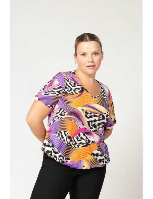 Printed knit tunic, short sleeves with elastic. Base with drawstring. V-neck Collection: Spring Summer Model: Height 1.70m and wearing size 2XL.