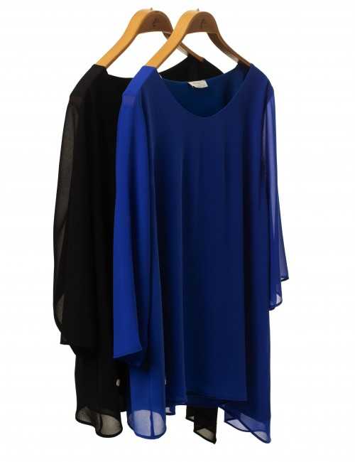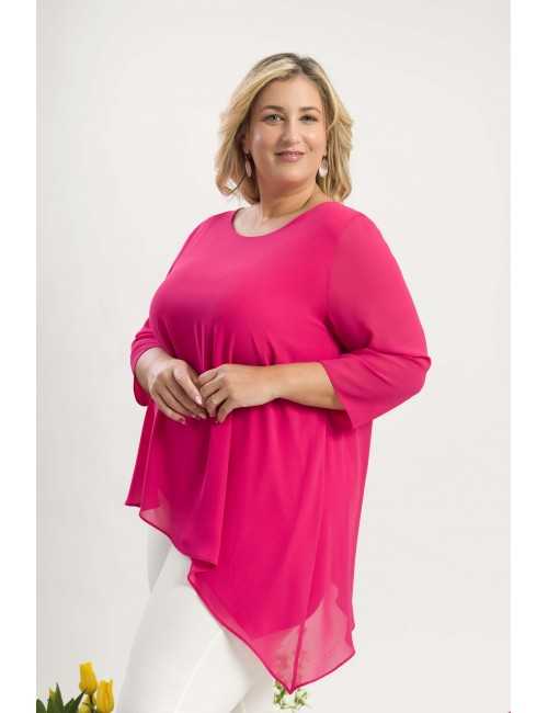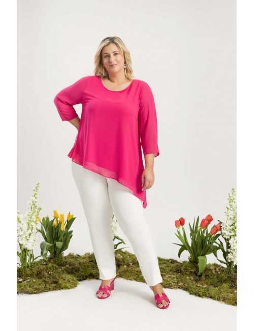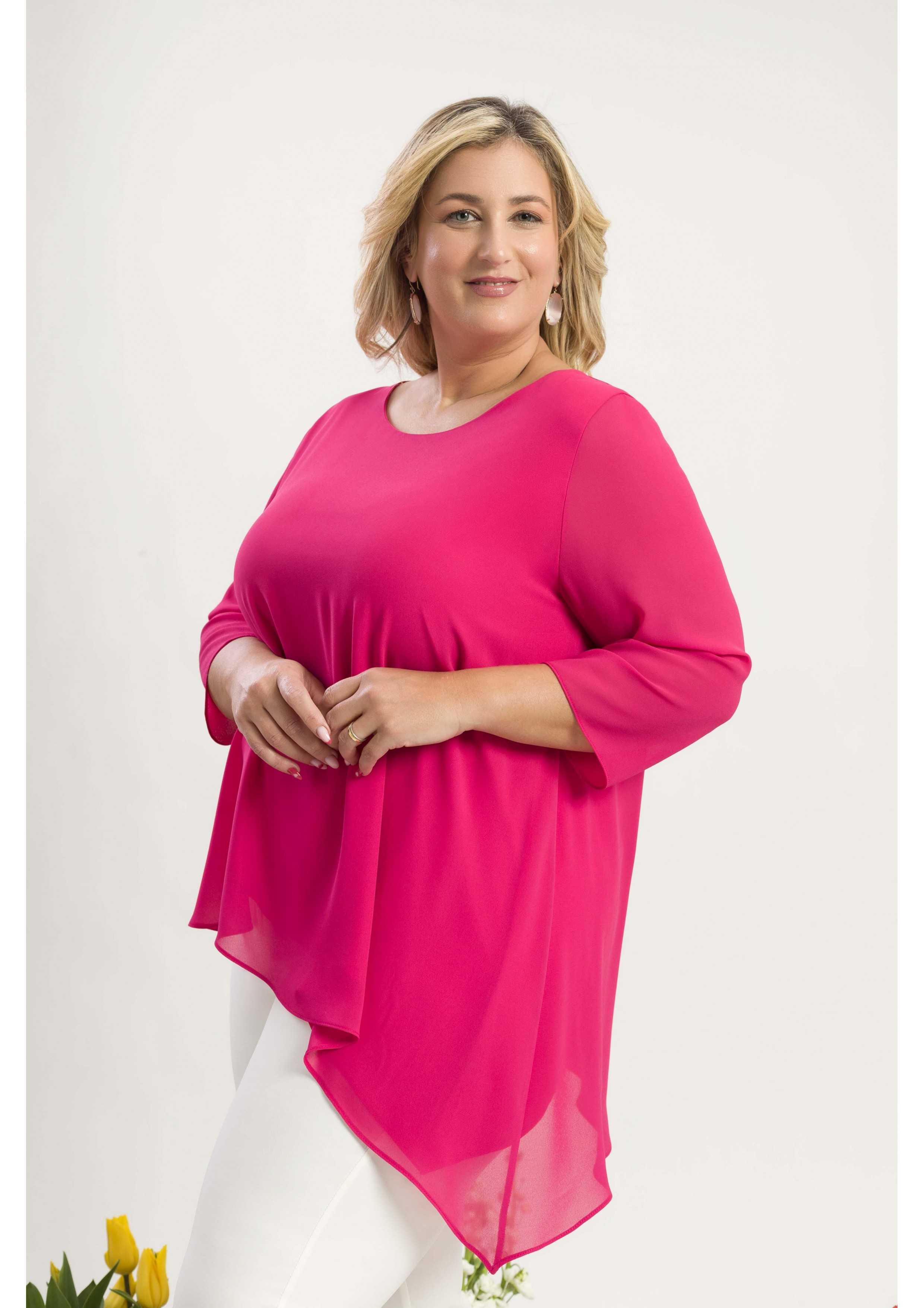 Tunic in fluid plain fabric, 3/4 sleeves, slightly flared with a side point. Collection: Spring Summer Model: Height 1.70m wearing size 2XL in blue and black. Model: Height 1.65m wearing size 3XL in fuchsia pink.
