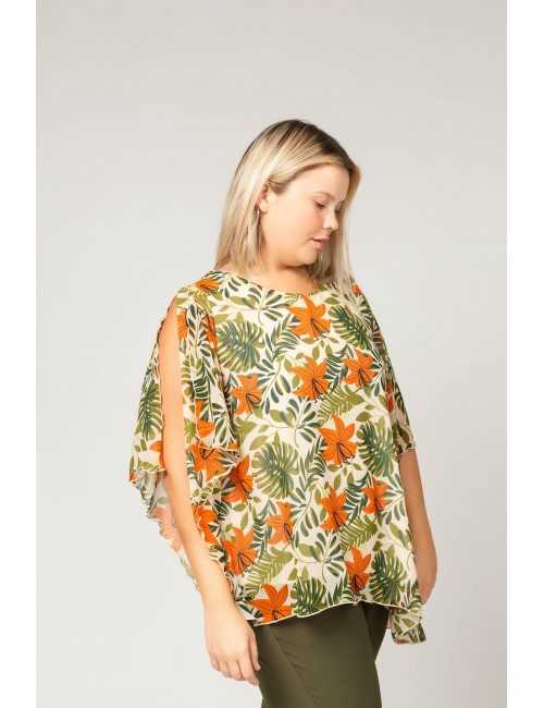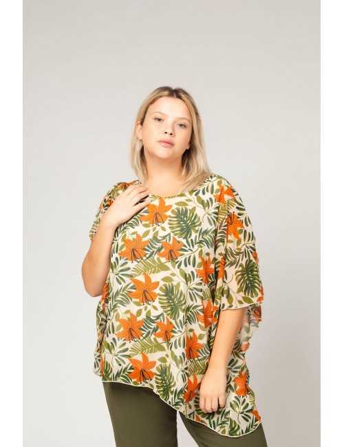 Printed fabric tunic, 3/4 sleeve with slit, slightly flared with side point, rolling finish. Collection: Spring Summer Model: Height 1.70m wearing size 2XL.