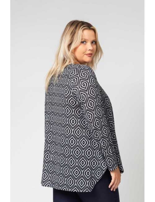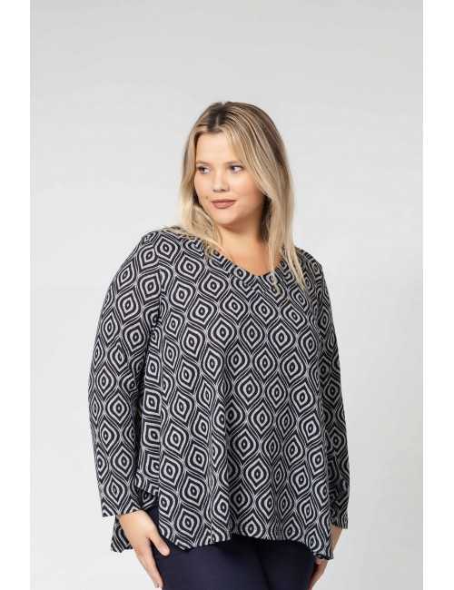 Long sleeve tunic in printed knit with a V-neck. Collection: Autumn Winter Available in Plus Sizes Own design and manufacturing product. We are a clothing brand with over 50 years of experience Model: Height 1.70m and wearing size 2XL. Composition: 96% Polyester 5% Elastane