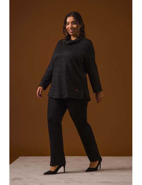 Plain knit tunic with lurex, long sleeves, dropped high collar, side slits. Collection: Autumn Winter Available in Plus Sizes Own design and manufacturing. We are a clothing brand with over 50 years of experience Model: Height 1.63m and is wearing size 2XL. Composition: 70% Polyester 15% Viscose 5% Elastane 10% Metal