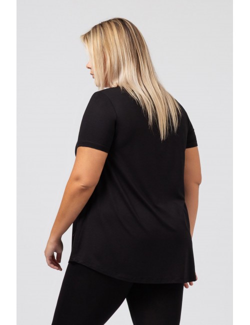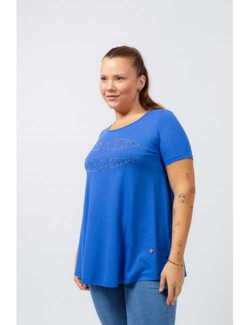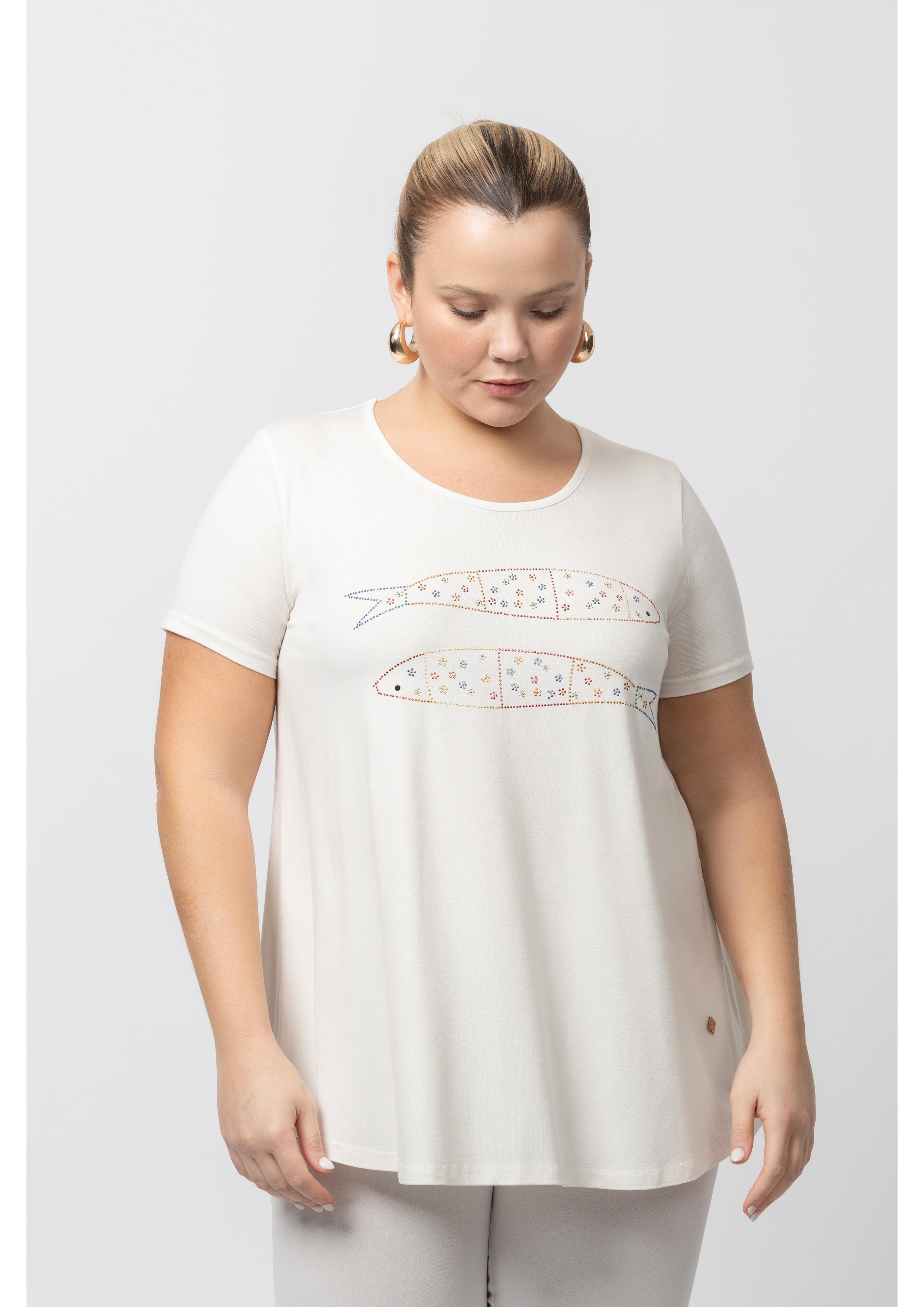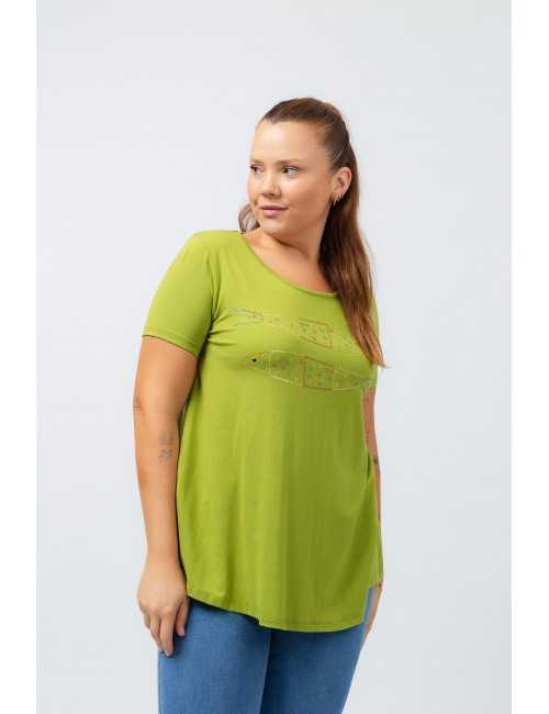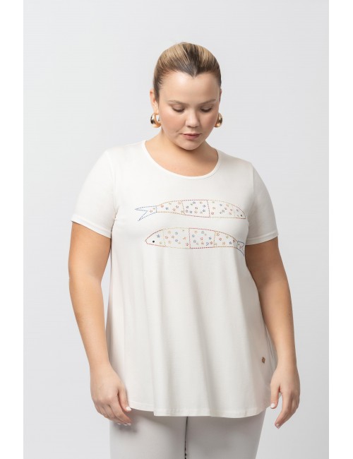 Plain knit tunic with fish applique and round neckline. Collection: Spring Summer Available in Plus Sizes Own design and manufacturing product. We are a clothing manufacturing brand with over 50 years of experience Model: Height 1.70m and is wearing size 2XL. Composition: 94% Viscose 6% Elastane