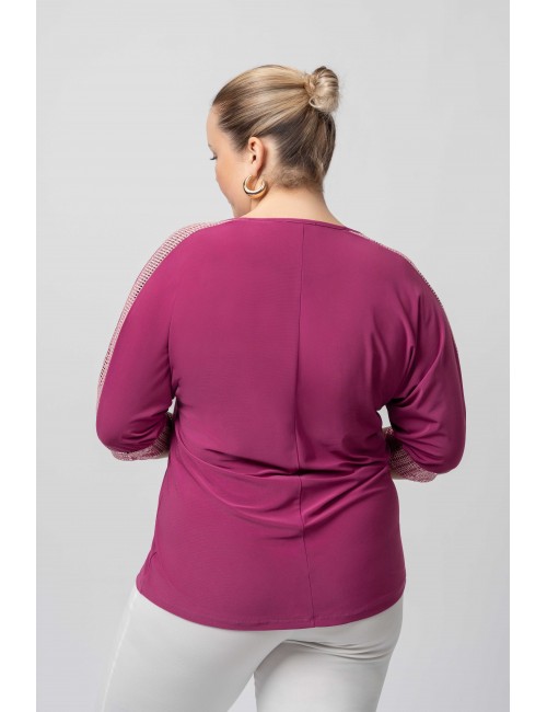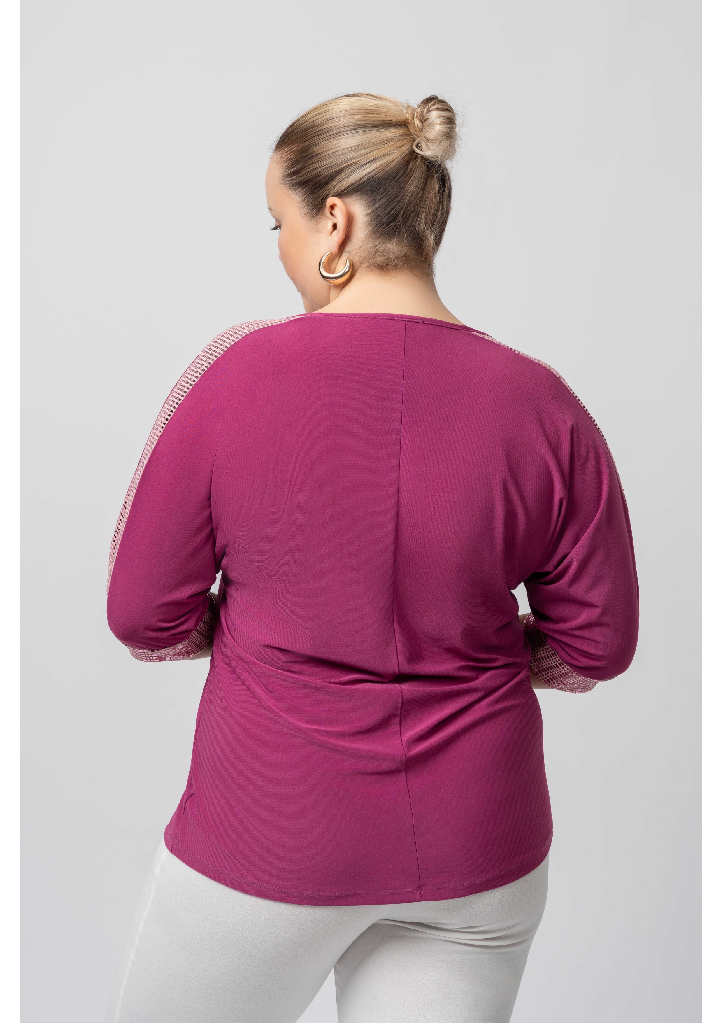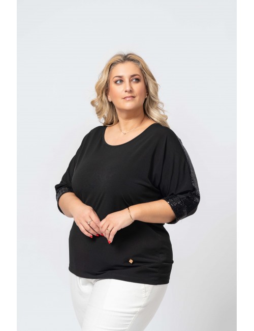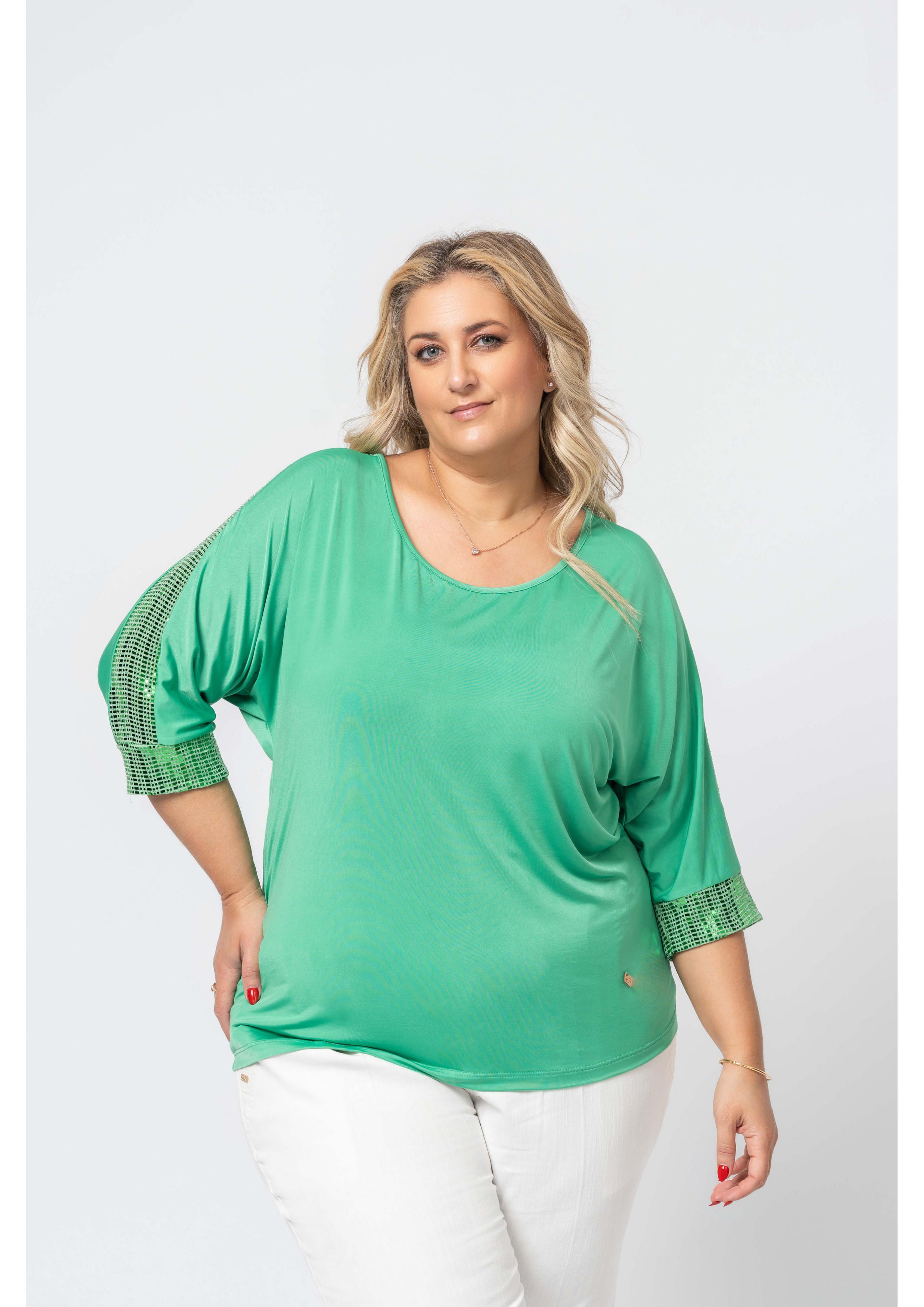 Plain knit tunic with 3/4 batwing sleeves. Sequin detailing at the sleeves and shoulders. Collection: Spring Summer Available in Plus Sizes Own design and manufacturing. We are a clothing brand with over 50 years of experience Model: Height 1.70m and is wearing size 2XL. Composition: Plain: 94% Polyester 6% Elastane | Shine: 80% Nylon 15% Metal 5% Elastane