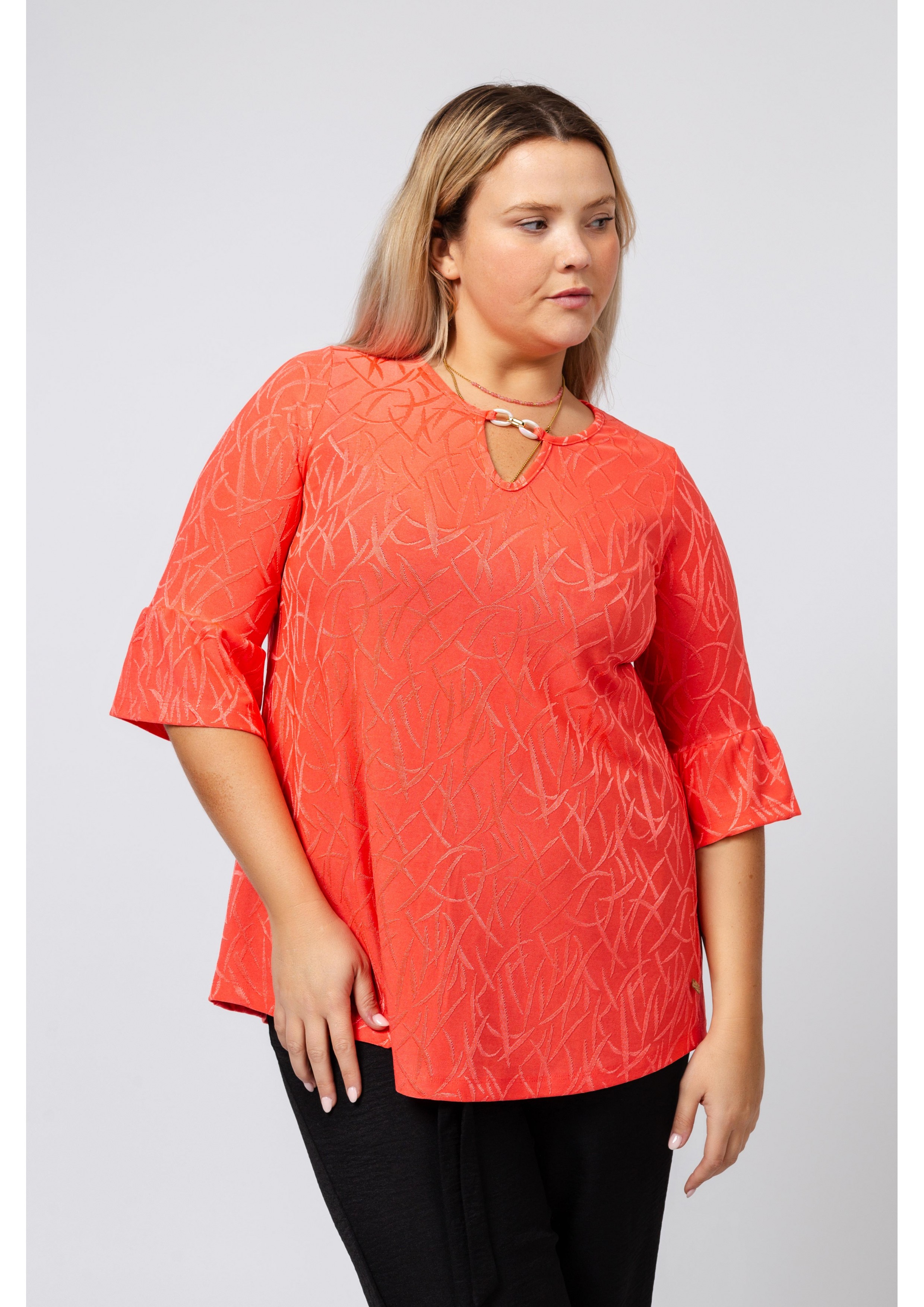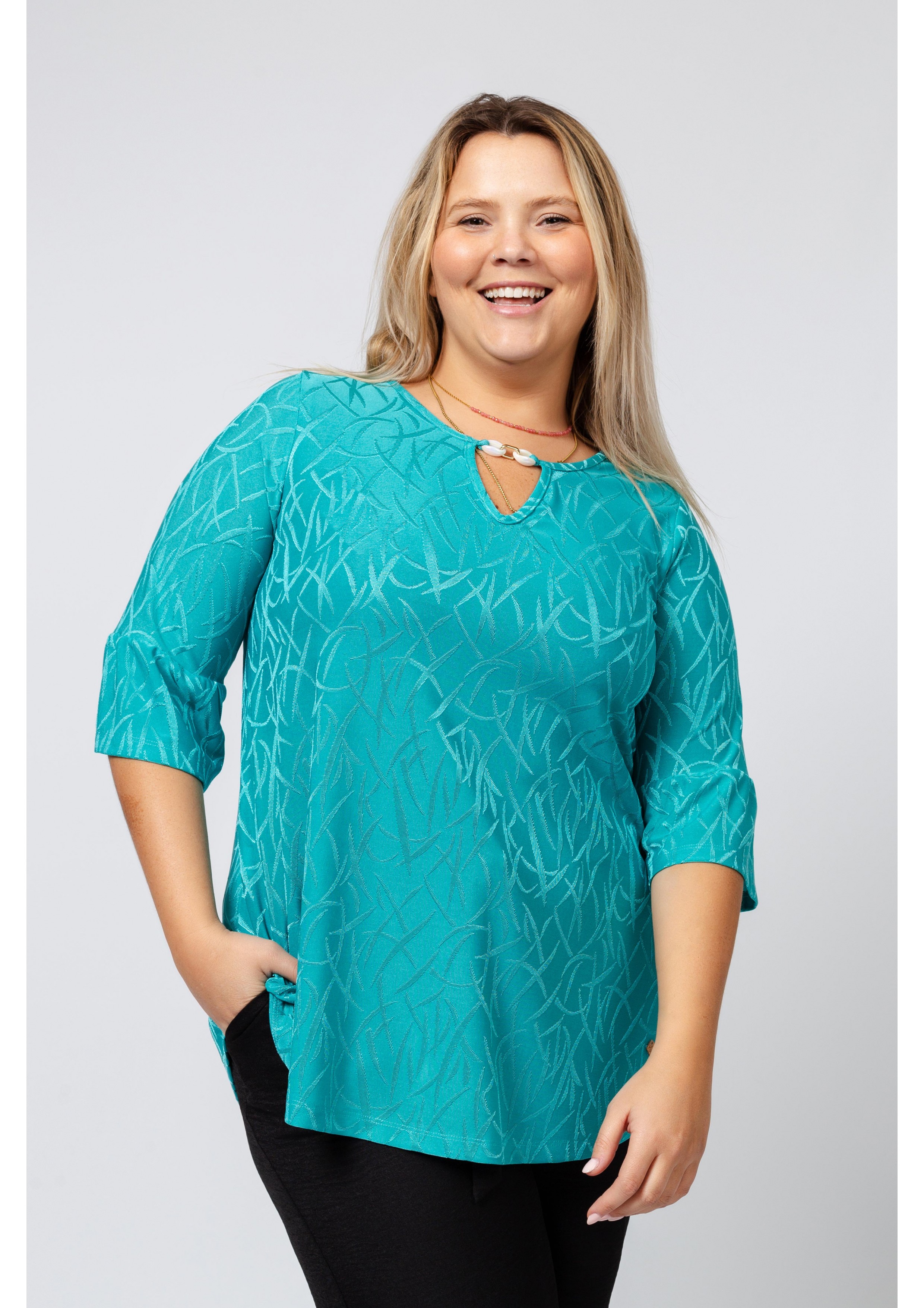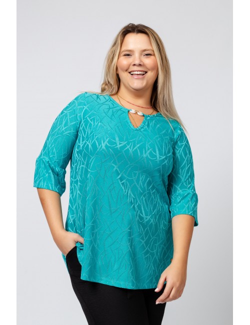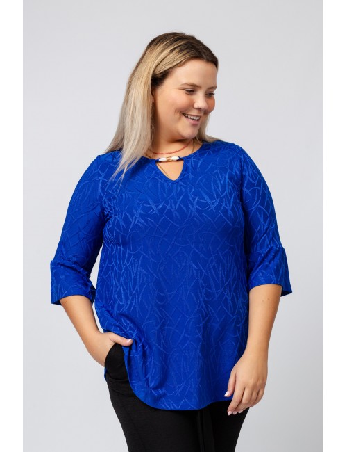 Knit tunic with a round neckline and opening with 3/4 sleeve ruffle application. Collection: Spring Summer Available in Plus Sizes Own design and manufacturing product. We are a clothing manufacturing brand with over 50 years of experience Model: Height 1.70m and wearing size 2XL. Composition: 95% Polyester 5% Elastane