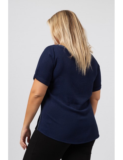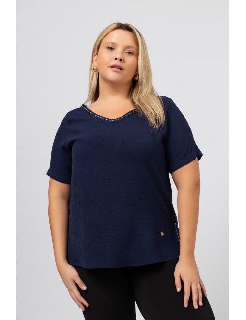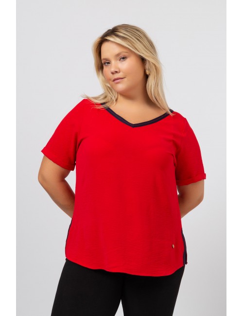 Tunic in smooth fabric, V-neck, ribbon trim with topstitching on the neckline and slits. Batwing sleeves. Side slits. Collection: Spring Summer Available in Plus Sizes Product of our own design and manufacture. We are a clothing brand with over 50 years of experience Model: Height 1.70m and wearing size 2XL. Composition: 100% Polyester