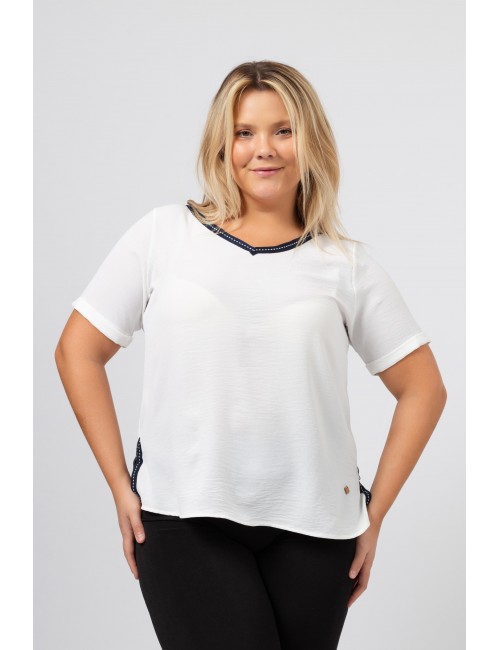 Tunic in smooth fabric, V-neck, ribbon trim with topstitching on the neckline and slits. Batwing sleeves. Side slits. Collection: Spring Summer Model: Height 1.70m and wearing size 2XL.