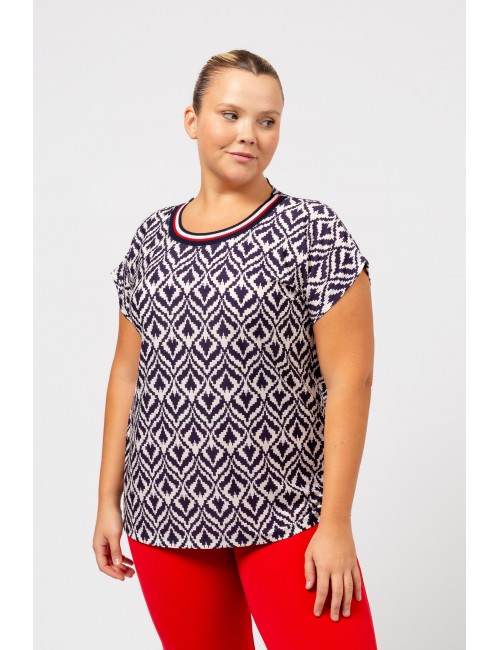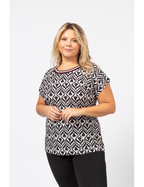 Printed knit tunic, dropped shoulder, round neckline with ribbing at the front, side slits. Collection: Spring Summer Model: Height 1.70m and is wearing size 2XL.