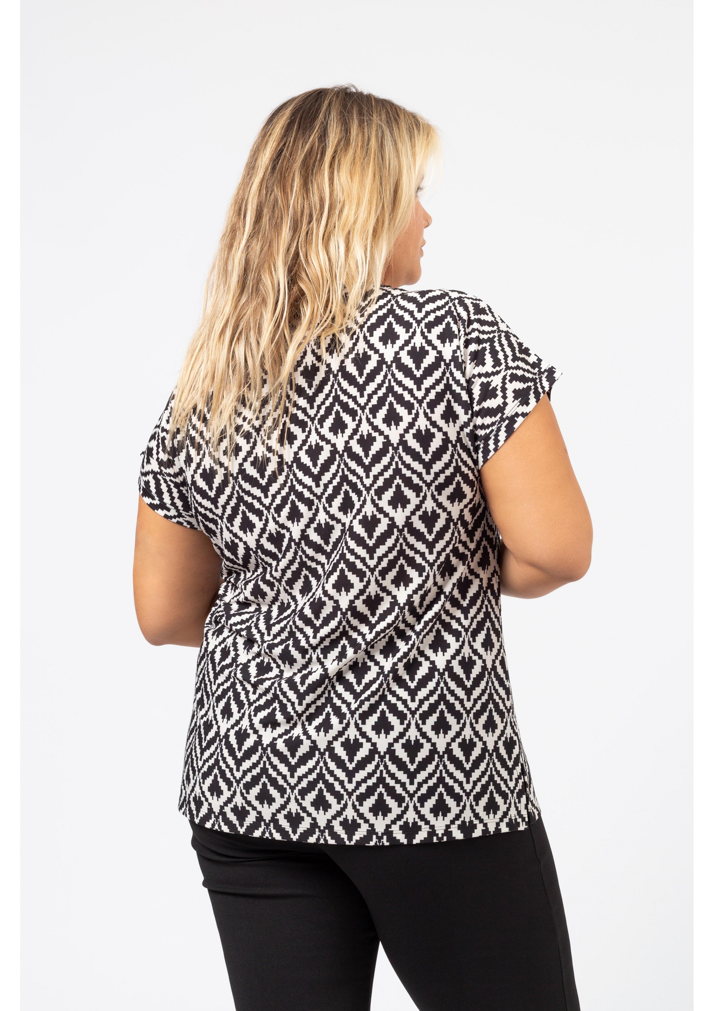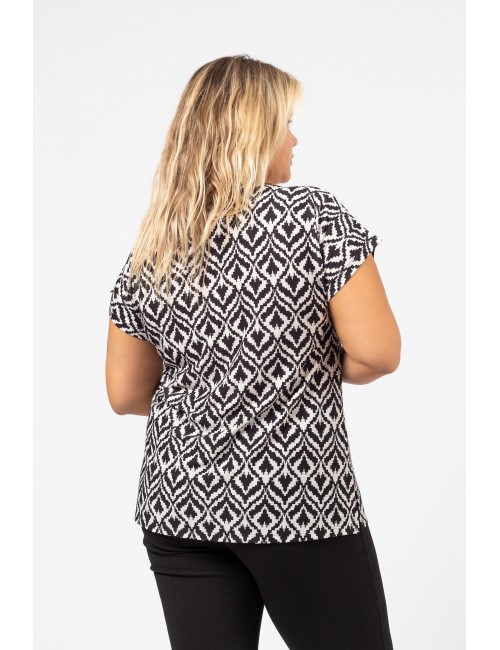 Printed knit tunic, dropped shoulder, round neckline with ribbing at the front, side slits. Collection: Spring Summer Available in Plus Sizes Own design and manufacturing product. We are a clothing manufacturing brand with over 50 years of experience. Model: Height 1.70m and is wearing size 2XL. Composition: 95% Polyester 5% Elastane