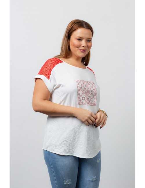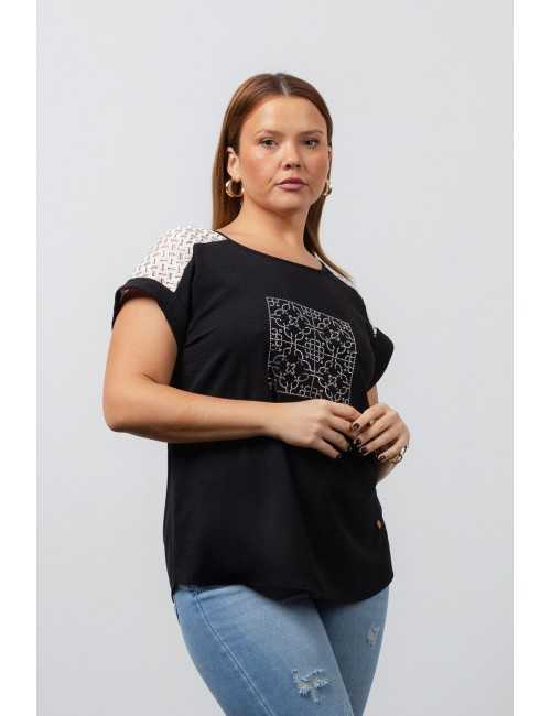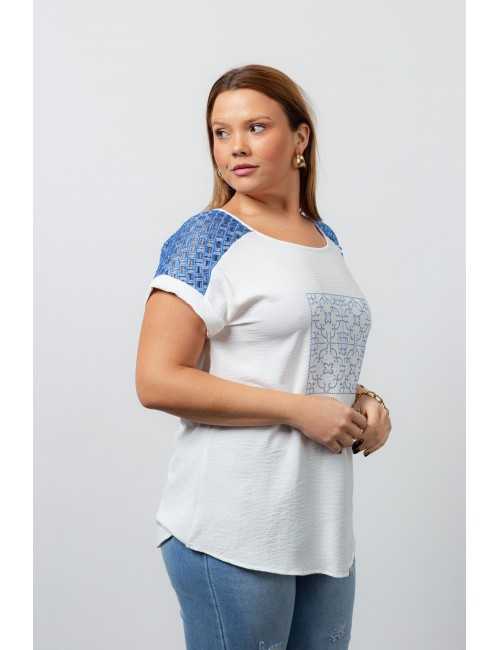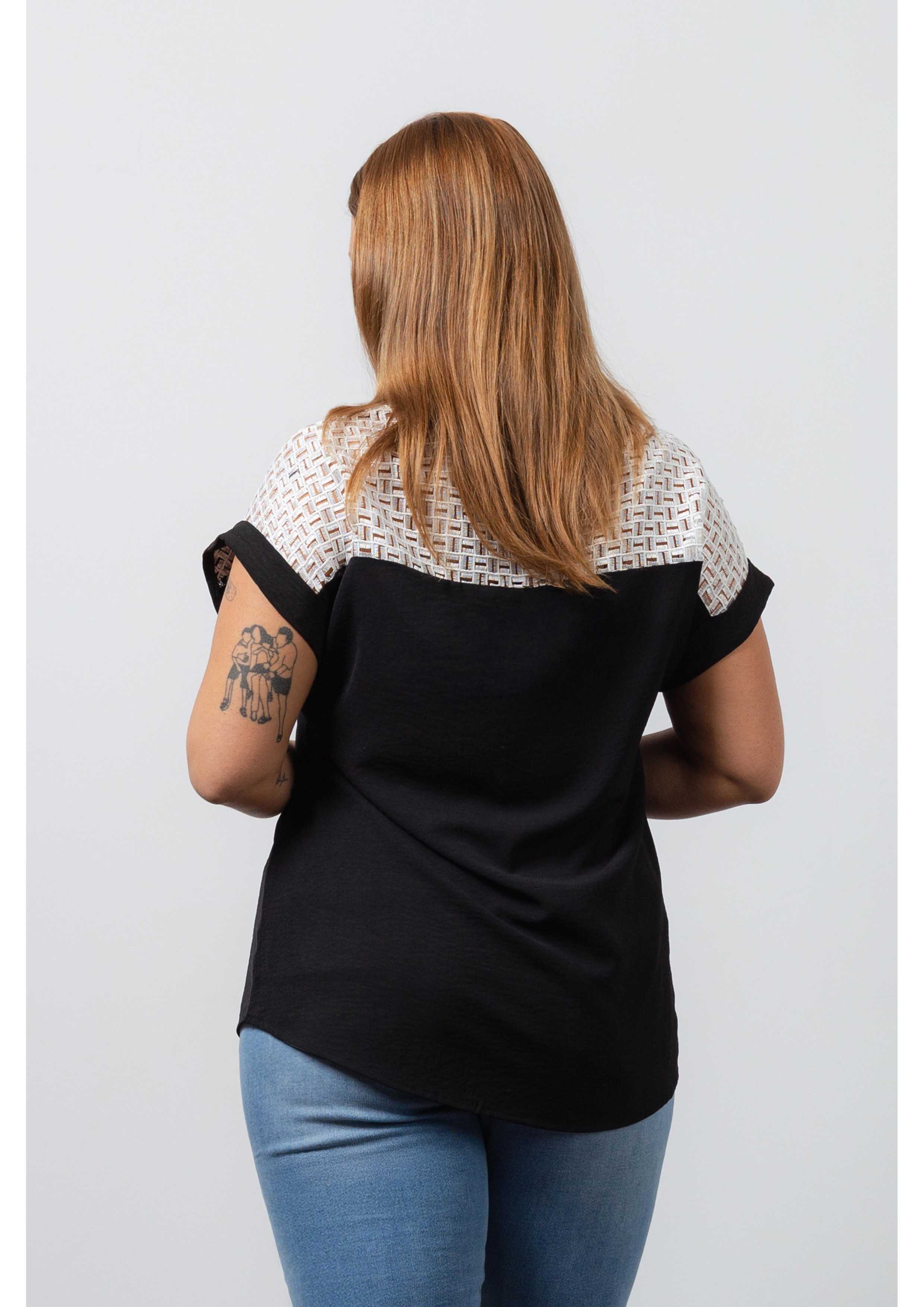Solid fabric tunic, back yoke in lace, batwing sleeves, and tile effect transfer application. Collection: Spring Summer Model: Height 1.70m and is wearing size 2XL.