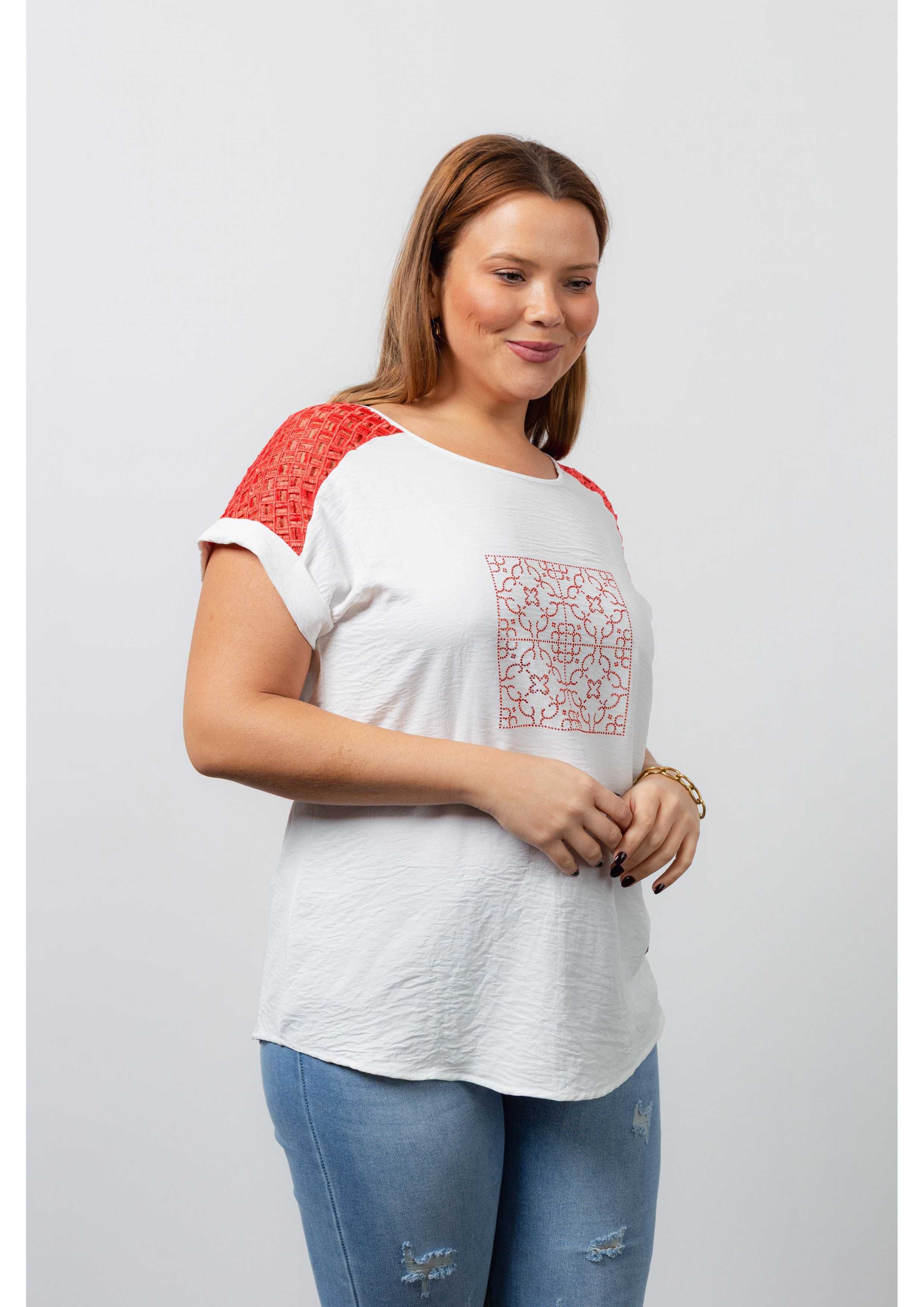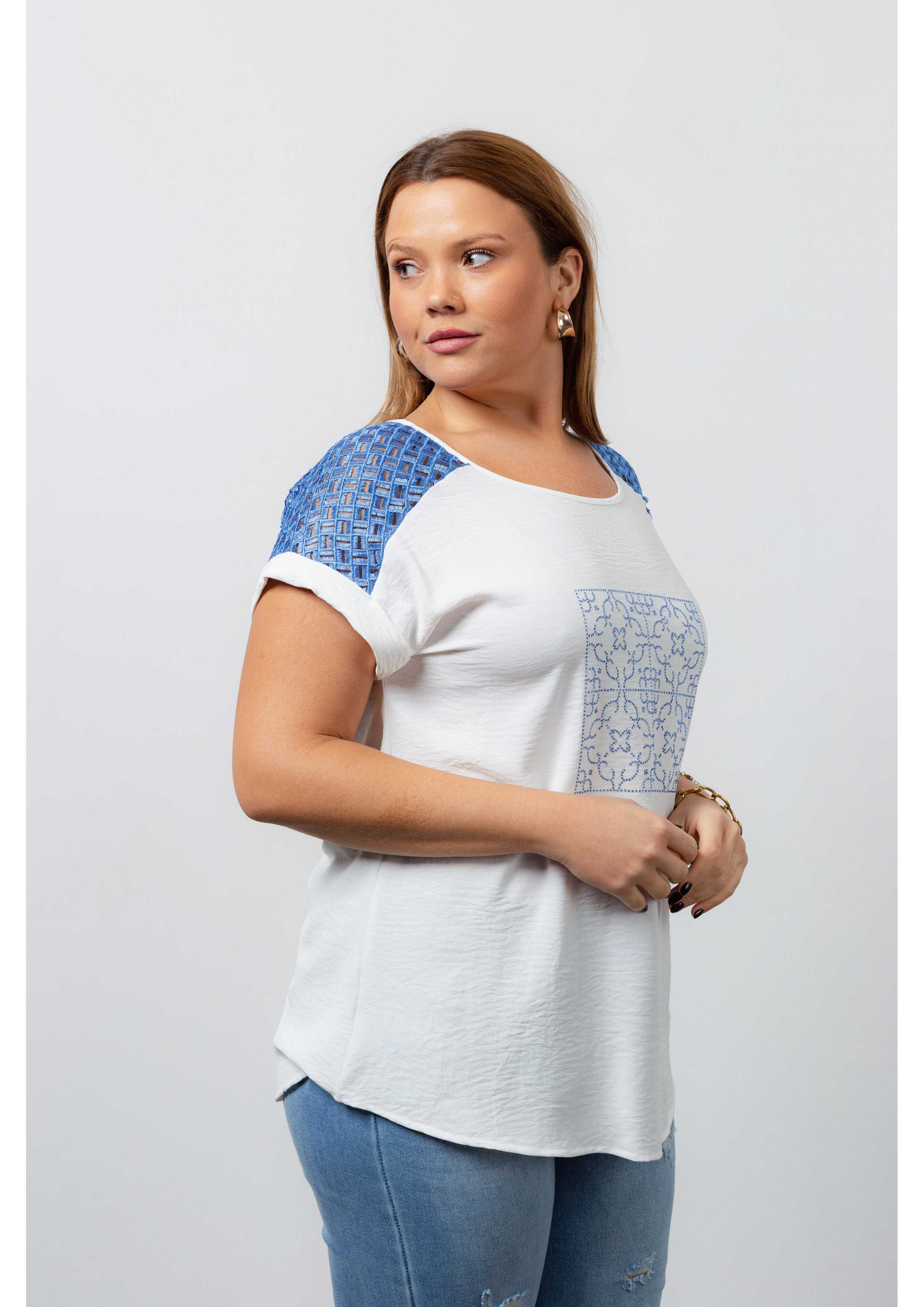 Solid fabric tunic, back yoke in lace, batwing sleeves, and tile effect transfer application. Collection: Spring Summer Available in Plus Sizes Own design and manufacturing product. We are a clothing brand with over 50 years of experience. Model: Height 1.70m and is wearing size 2XL. Composition: 100% Polyester