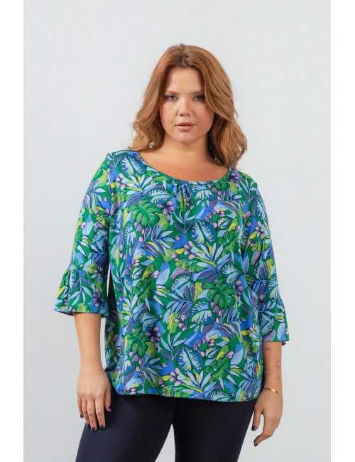 Printed knit tunic, 3/4 sleeves with ruffle, round neckline with slight gathering at the center front. Collection: Spring Summer Available in Plus Sizes Own design and manufacturing product. We are a clothing manufacturing brand with over 50 years of experience Model: Height 1.70m and is wearing size 2XL.