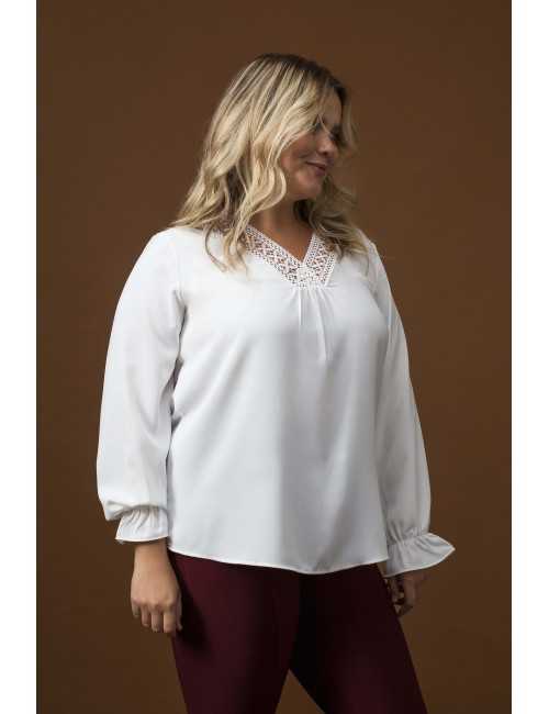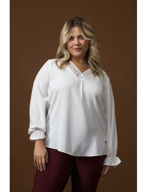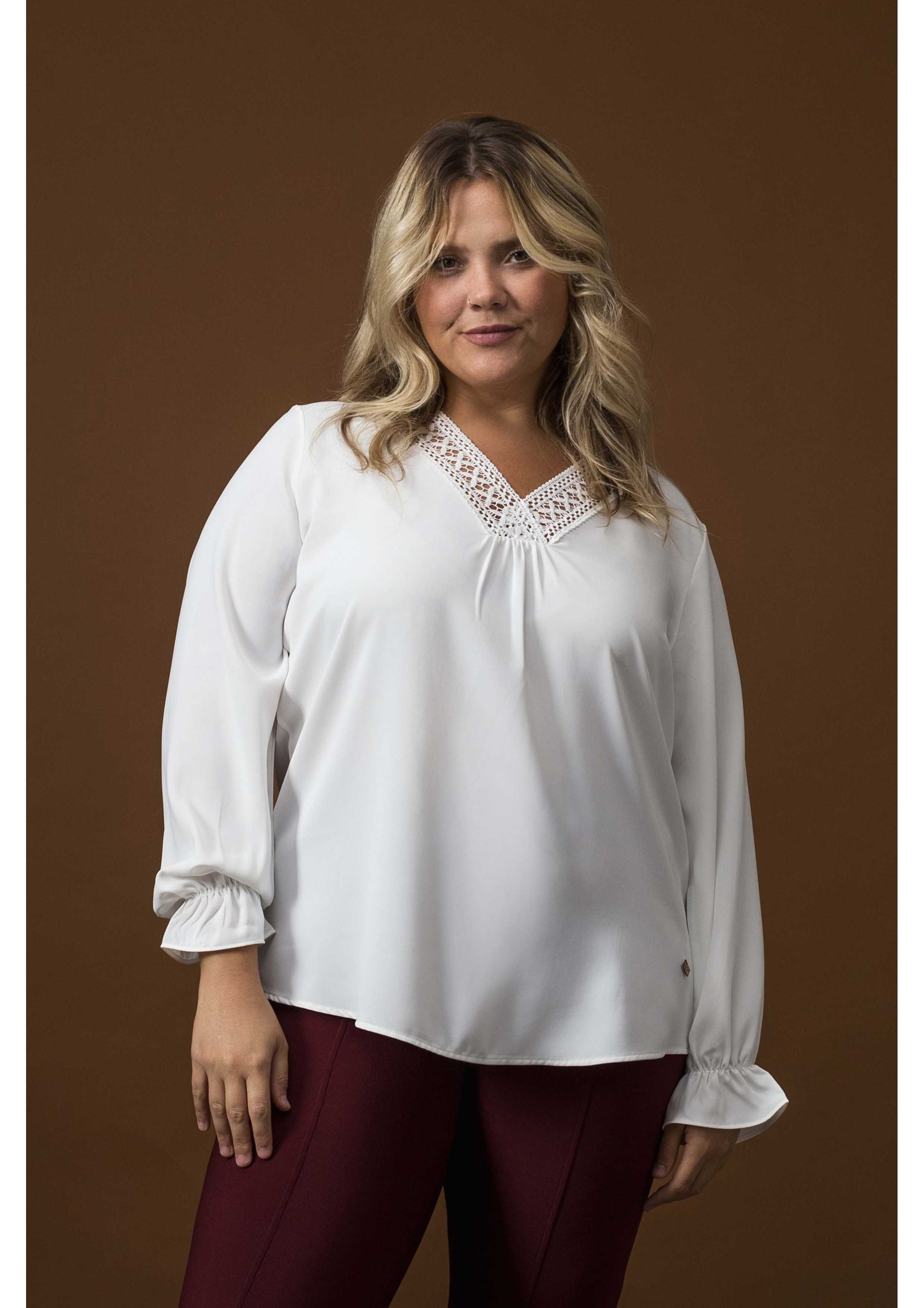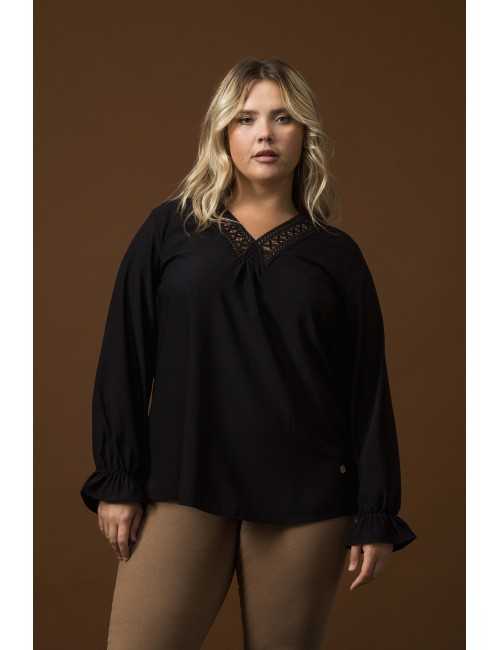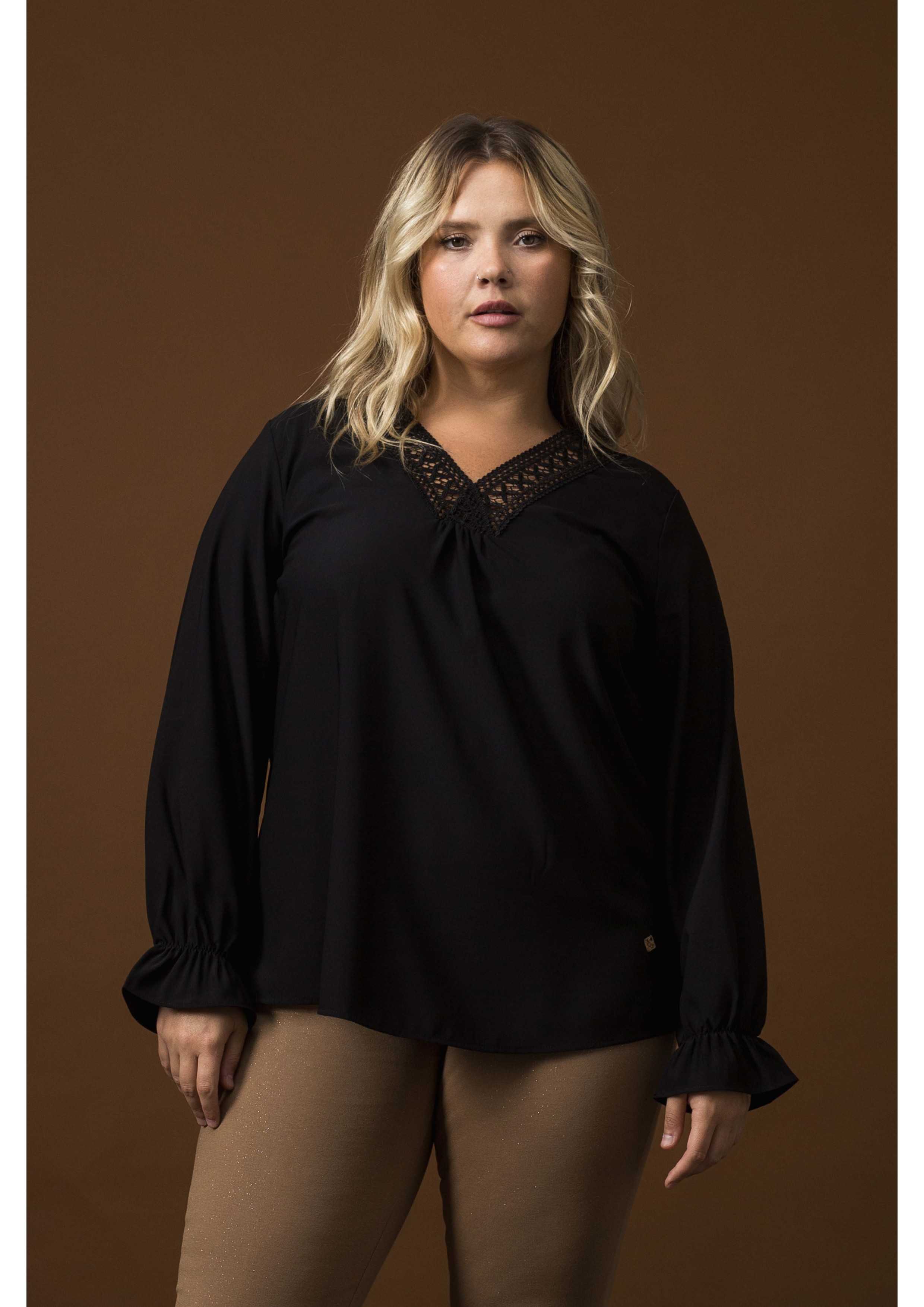 Plain crepe tunic, shoulder cape sleeves and elastic cuff with ruffle, V-neck with lace. Collection: Autumn Winter Available in Plus Sizes Original design and manufacture. We are a clothing brand with over 50 years of experience Model: Height 1.70m and is wearing size 2XL, in black and pearl. Model: Height 1.67m and is wearing size G, in pearl. Composition: 100% Polyester