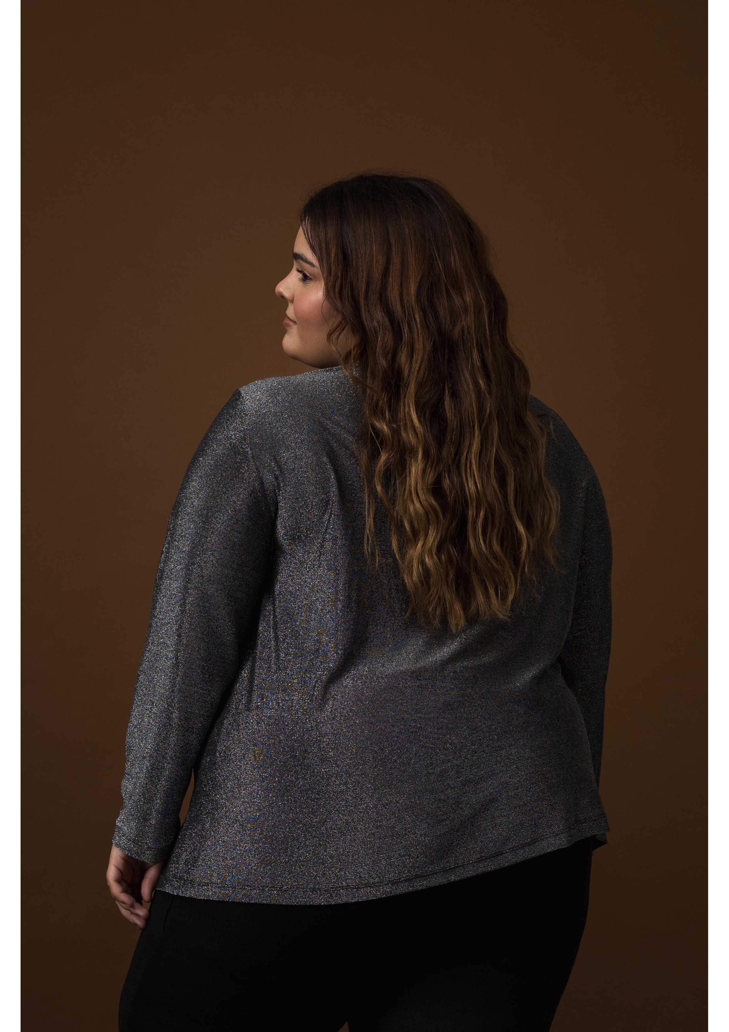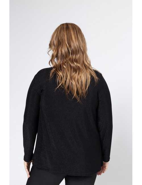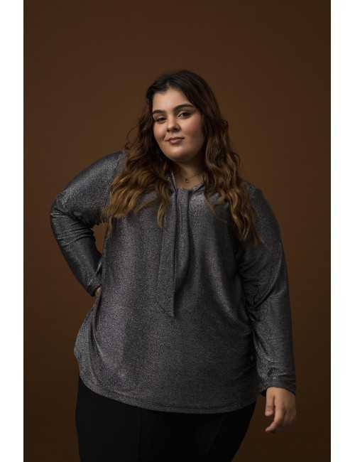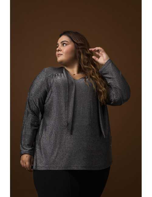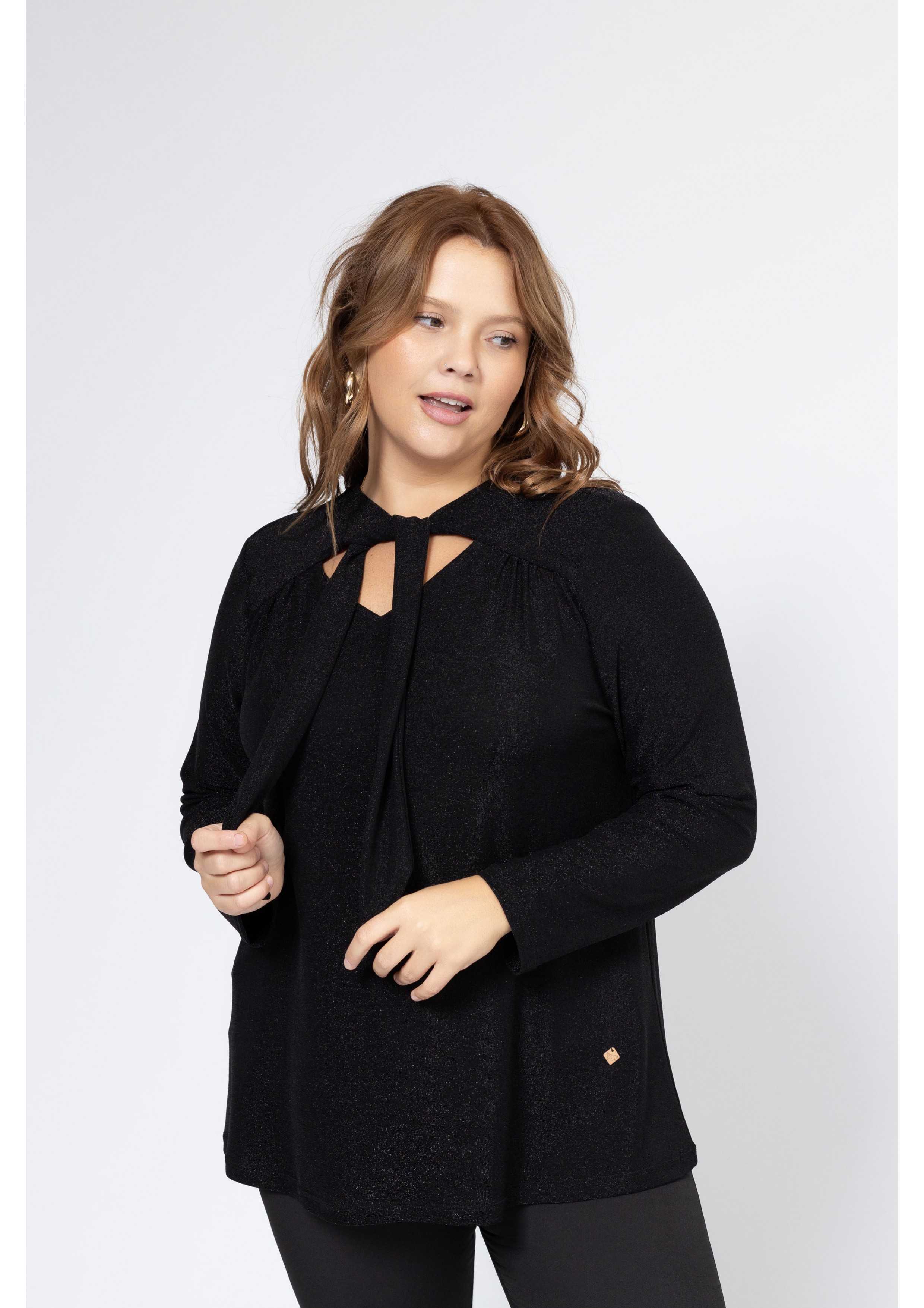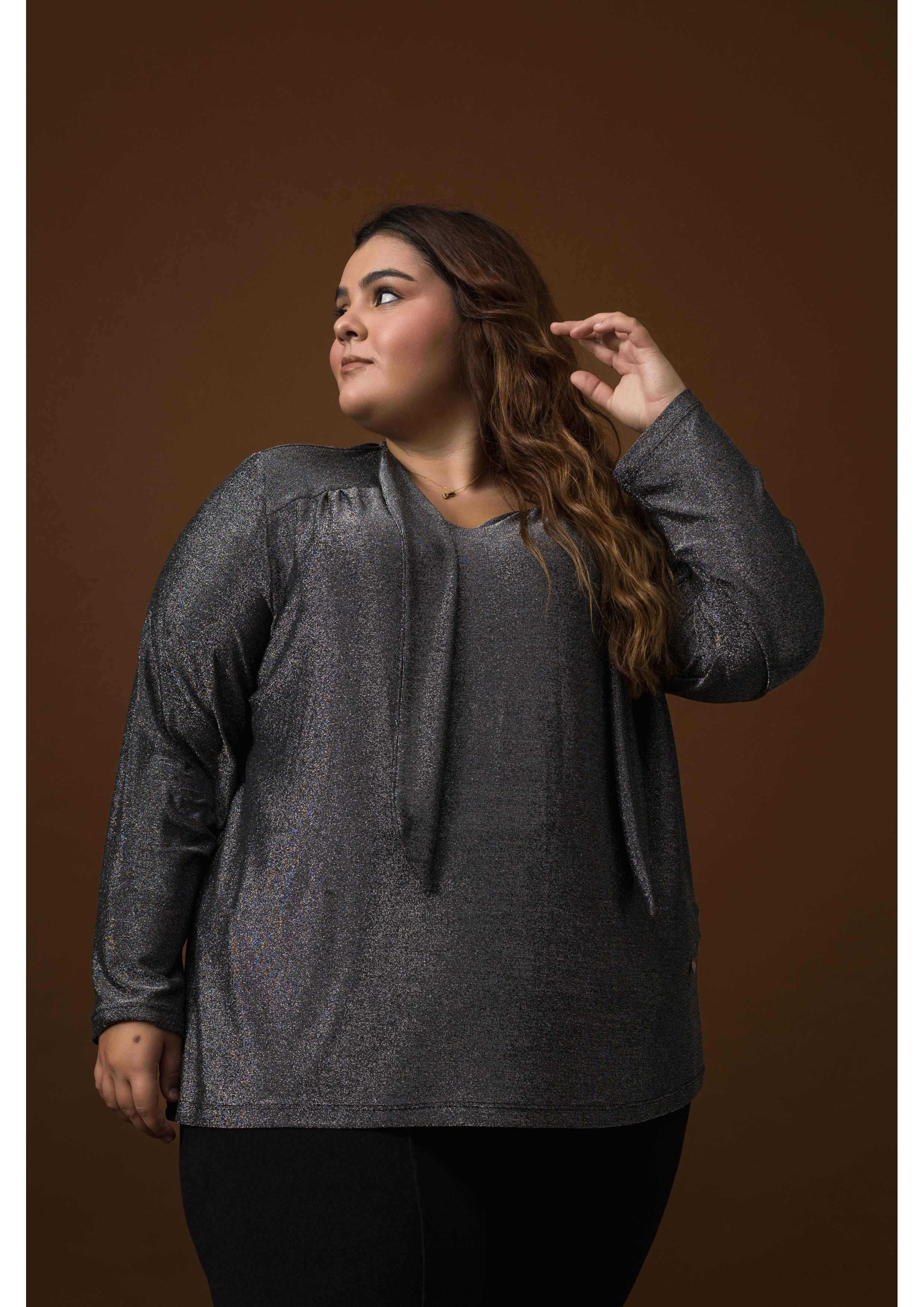 Solid knit tunic with lurex thread. long sleeves, v-neck with tight bow, gathered on the dropped shoulders, slightly flared model. Collection: Fall Winter Available in Plus Sizes Own design and manufacturing product. We are a clothing brand with over 50 years of experience Model: Height 1.67m wearing size G in silver color. Model: Height 1.70m wearing size 2XL in black color. Composition: 56% Nylon 39% Lurex 5% Elastane