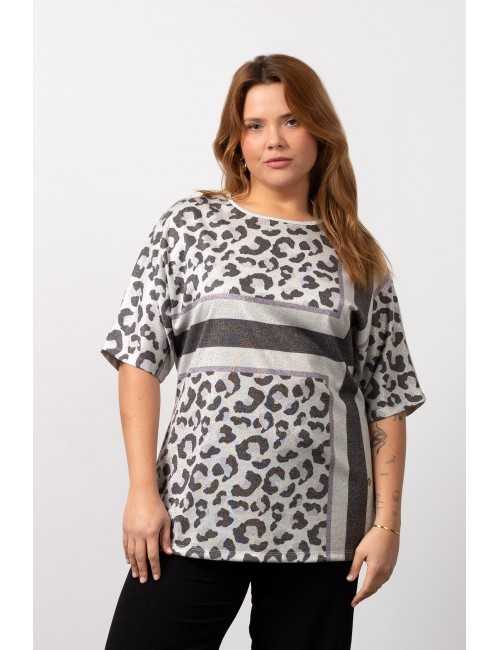 Lurex shine knit tunic, printed all over the front. Oversized model with a round neckline. Collection: Spring Summer Available in Plus Sizes Custom design and manufacturing product. We are a clothing brand with over 50 years of experience Model: Height 1.70m and is wearing size XL. Composition: 46% Viscose 30% Nylon 12% Polyester 12% Elastane