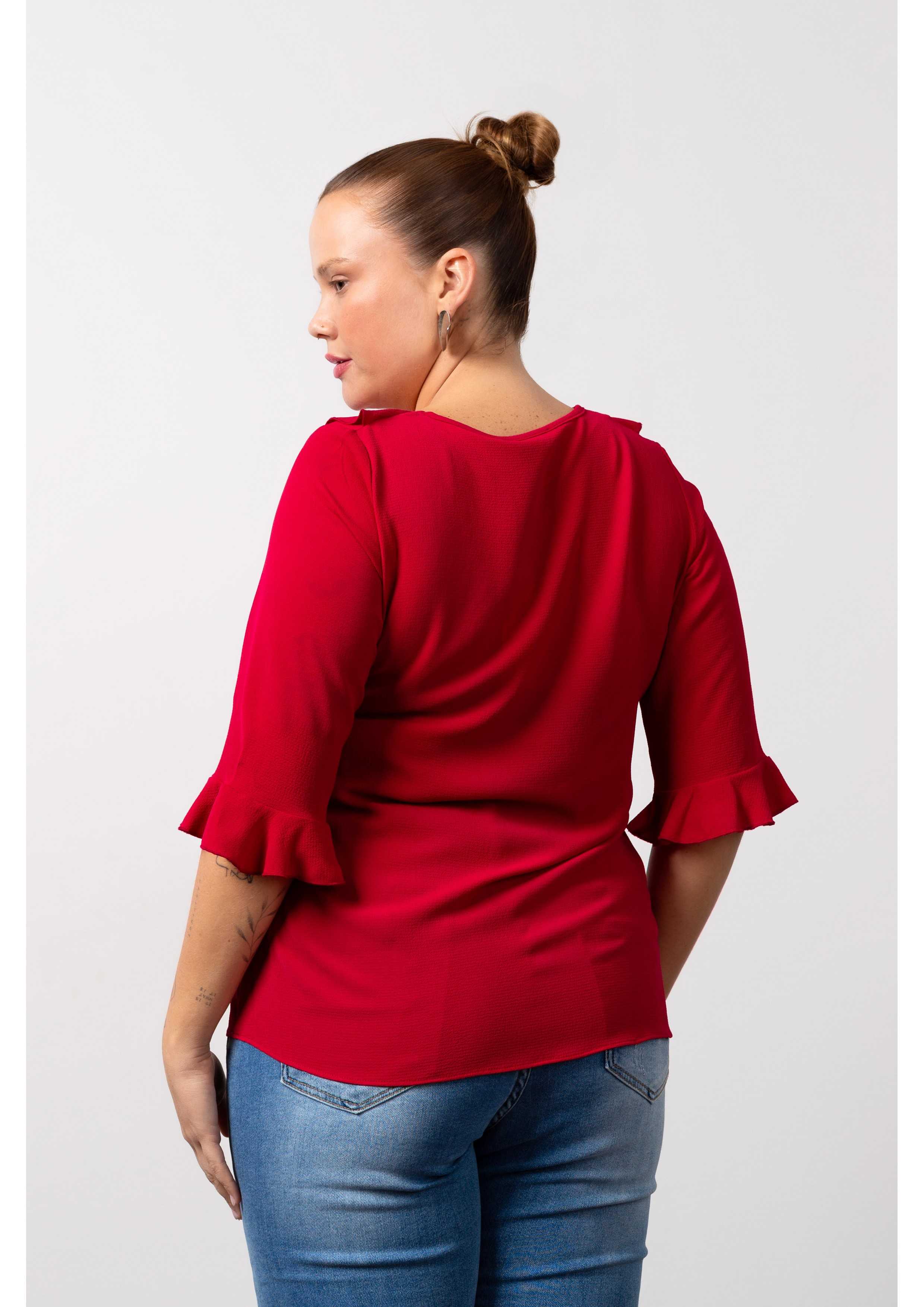 Tunic in plain fabric, V-neck with ruffle, 3/4 sleeves with ruffles. Rolled hem finishes. Collection: Spring Summer Available in Plus Sizes Own design and manufacturing product. We are a clothing brand with over 50 years of experience Model: Height 1.70m and is wearing size 2XL. Composition: 98% Polyester 2% Elastane