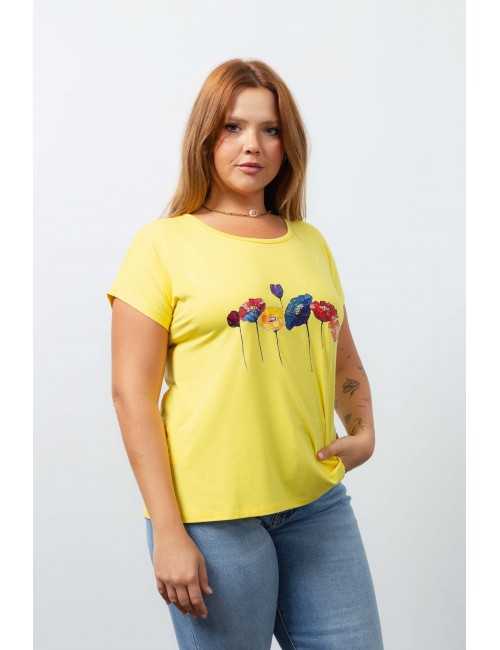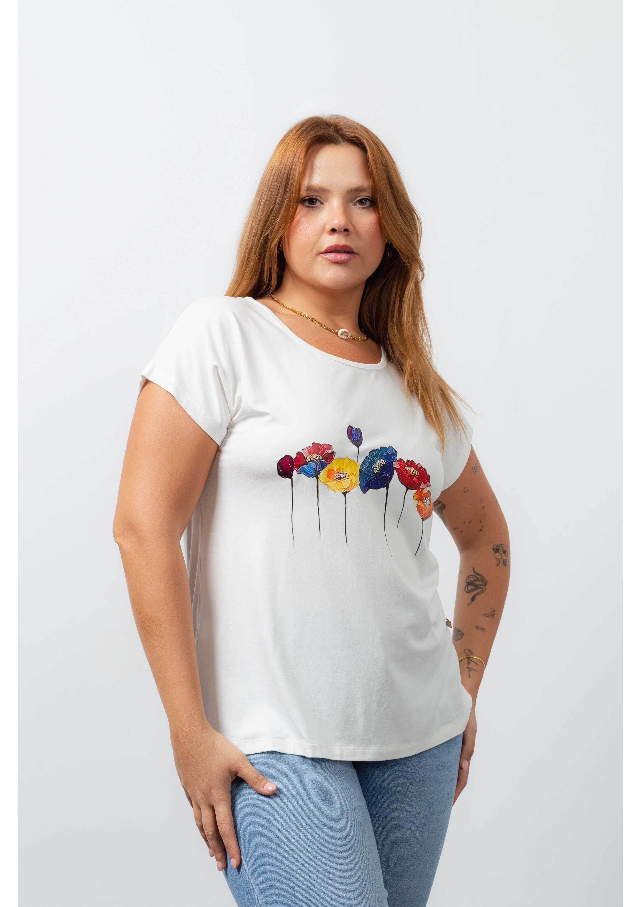 Solid knit tunic, printed on the front with flowers. Round neckline. Collection: Spring Summer Available in Plus Sizes Own design and manufacturing product. We are a clothing manufacturing brand with over 50 years of experience Model: Height 1.70m and is wearing size XL. Composition: 94% Viscose 6% Elastane
