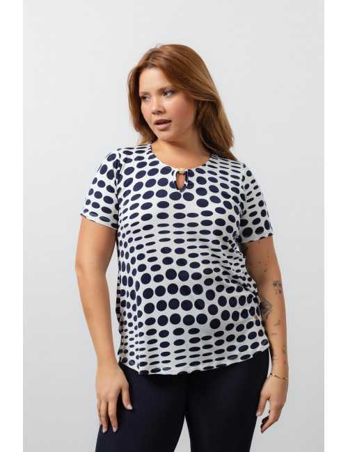 Printed knit tunic, polka dots, short sleeves, round neckline with teardrop and front appliqué. Side slits. Collection: Spring Summer Available in Plus Sizes Own design and manufacturing product. We are a clothing manufacturing brand with over 50 years of experience Model: Height 1.70m and is wearing size XL. Composition: 94% Polyester 6% Elastane