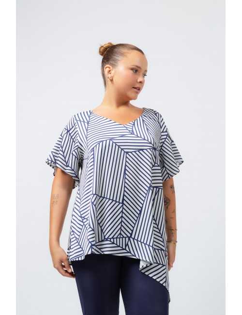 Tunic in printed fabric, V-neck and left side in a point. Short bell-style sleeves. Collection: Spring Summer Available in Plus Sizes Own design and manufacturing product. We are a clothing brand with over 50 years of experience Model: Height 1.70m and wearing size XL. Composition: 98% Polyester 2% Elastane
