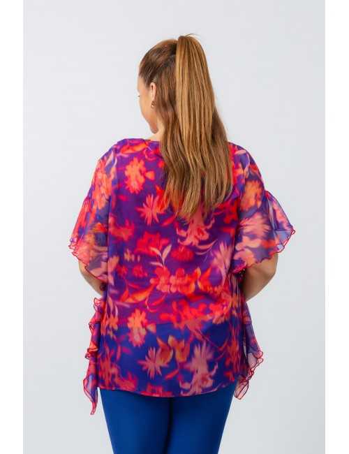 Printed fabric tunic, fine, lined piece, ruffles on the sides with rolled finish, round neckline. Collection: Spring Summer Model: Height 1.70m and wearing size XL.