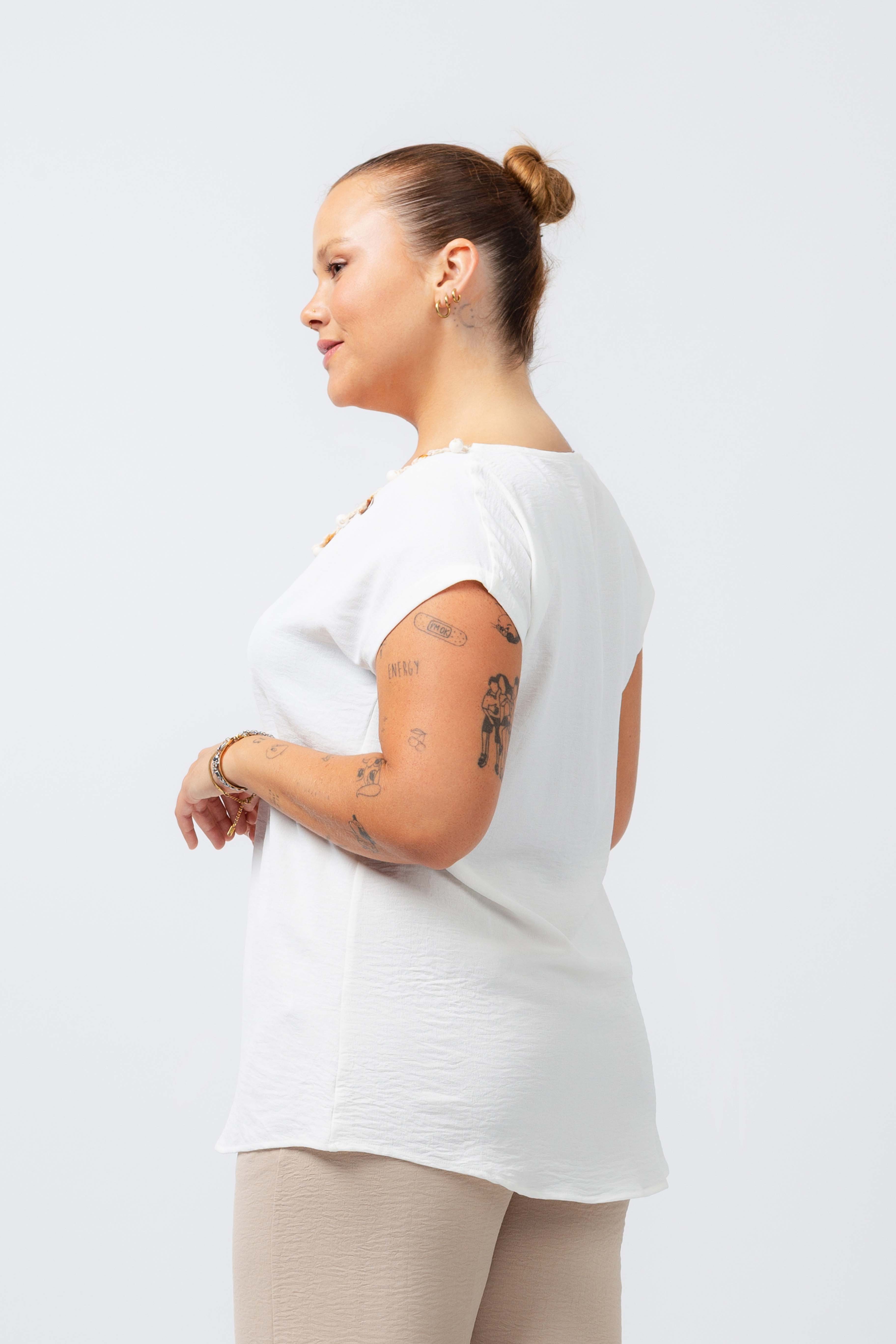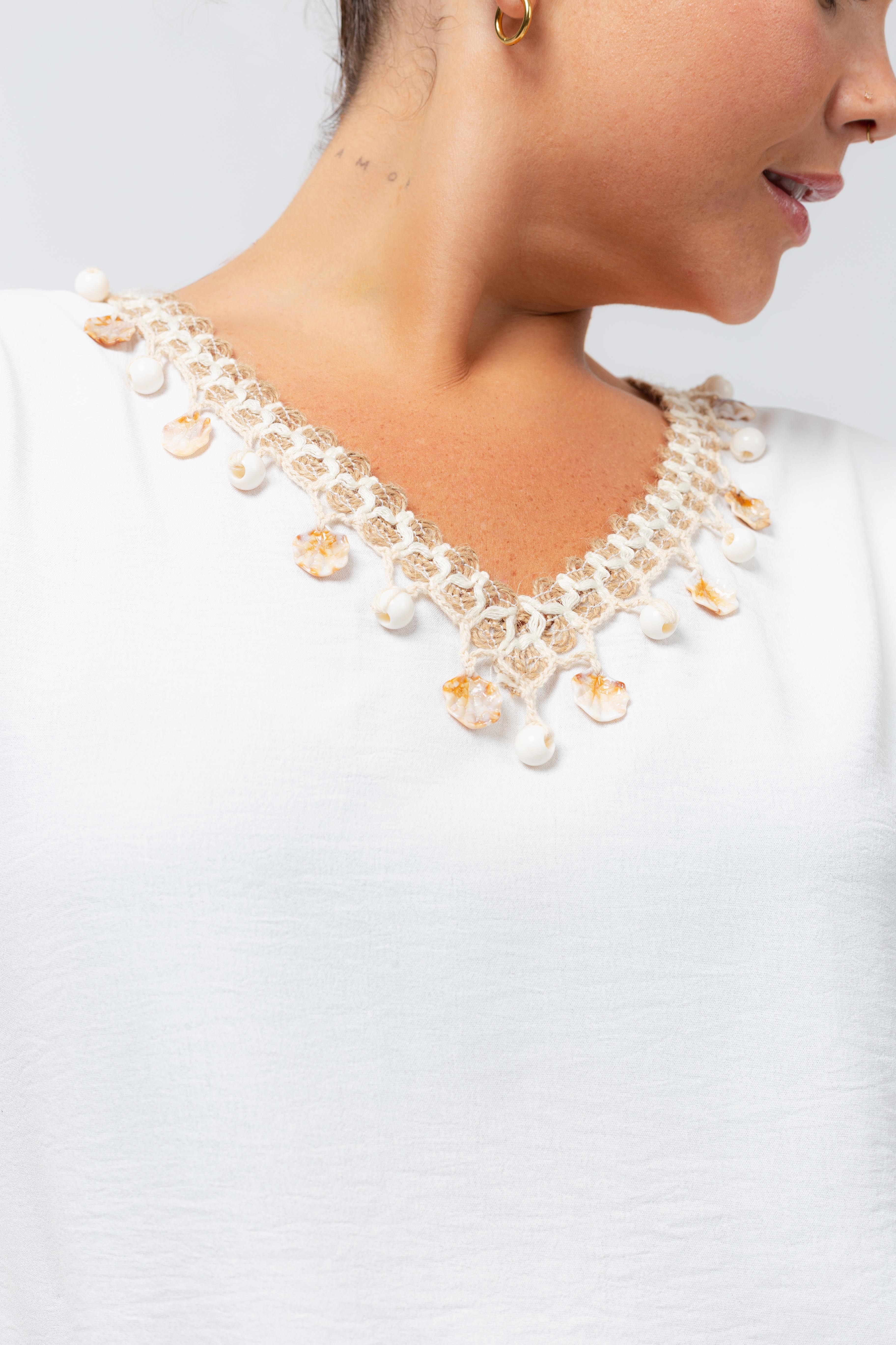 Tunic in plain fabric, wide shoulders. V-neck with fringe application beach motifs. Collection: Spring Summer Model: Height 1.70m and wearing size XL.