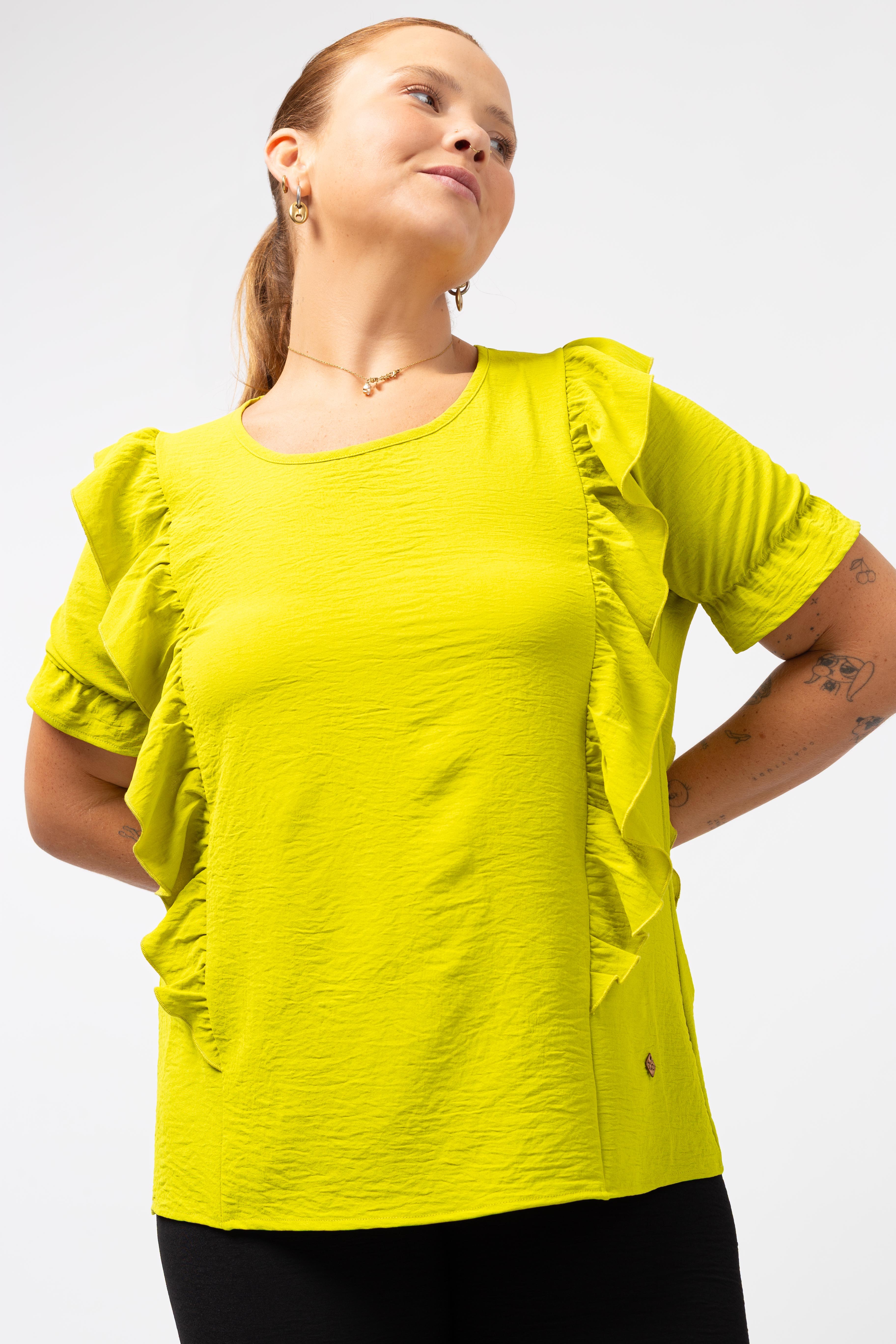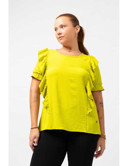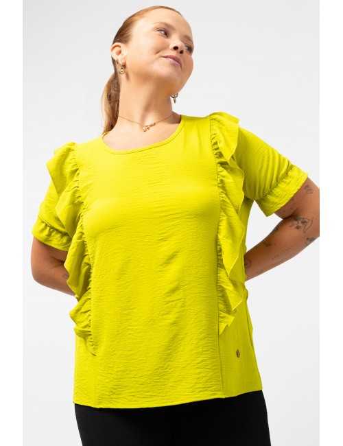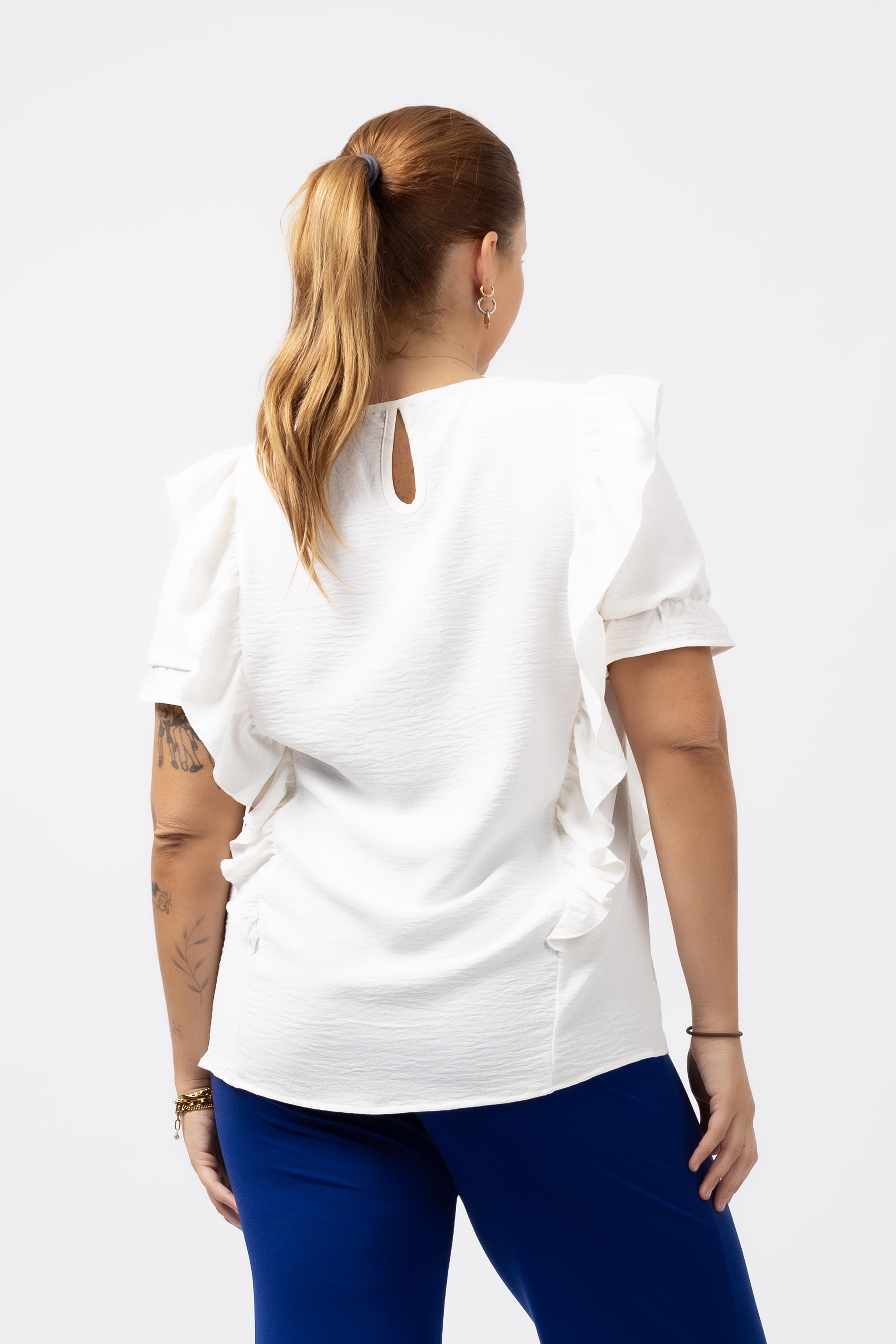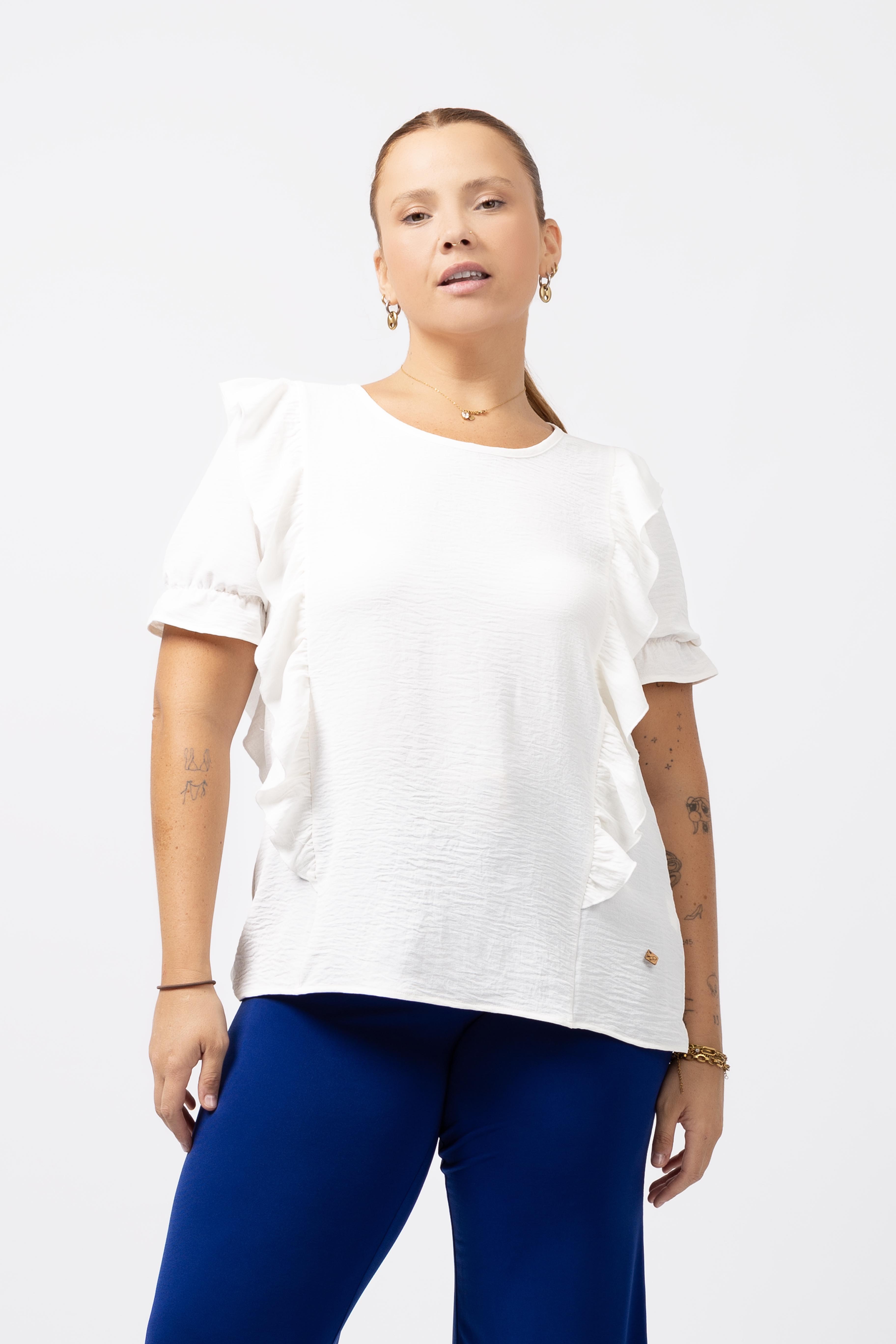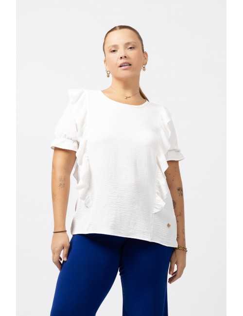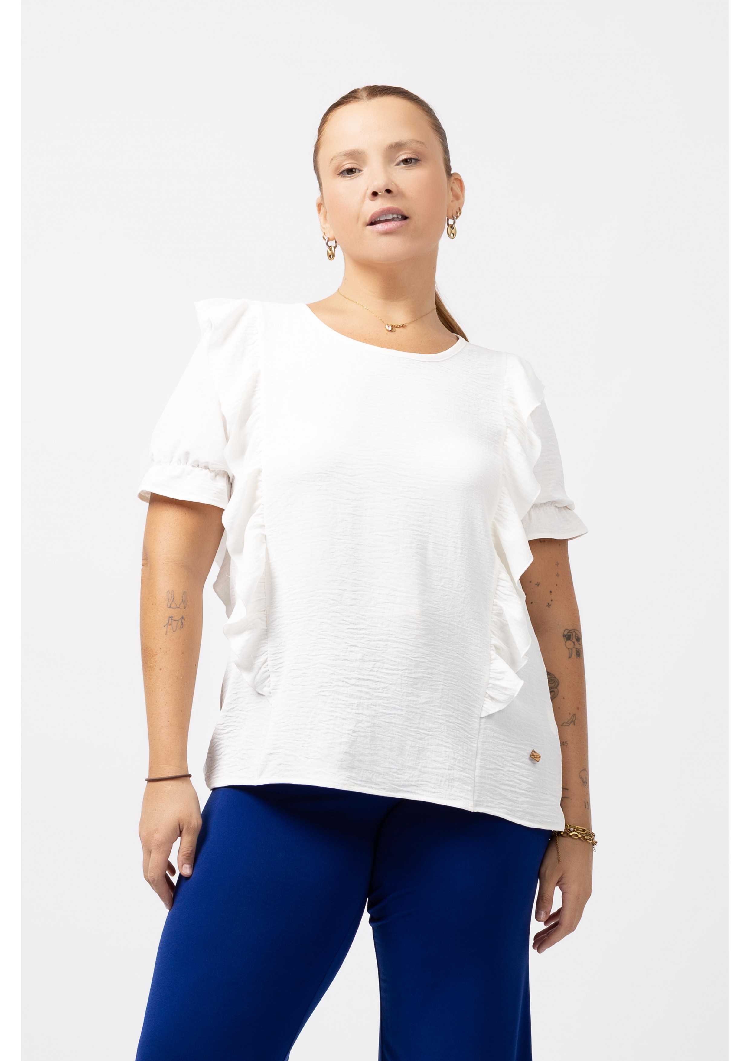 Tunic in plain fabric, round neckline with a closed teardrop at the back. Ruffles at the front and back with rolled hem finish. Short sleeves with elastic to create ruffle. Collection: Spring Summer Available in Plus Sizes Own design and manufacturing product. We are a clothing brand with over 50 years of experience Model: Height 1.70m and wearing size XL. Composition: 100% Polyester