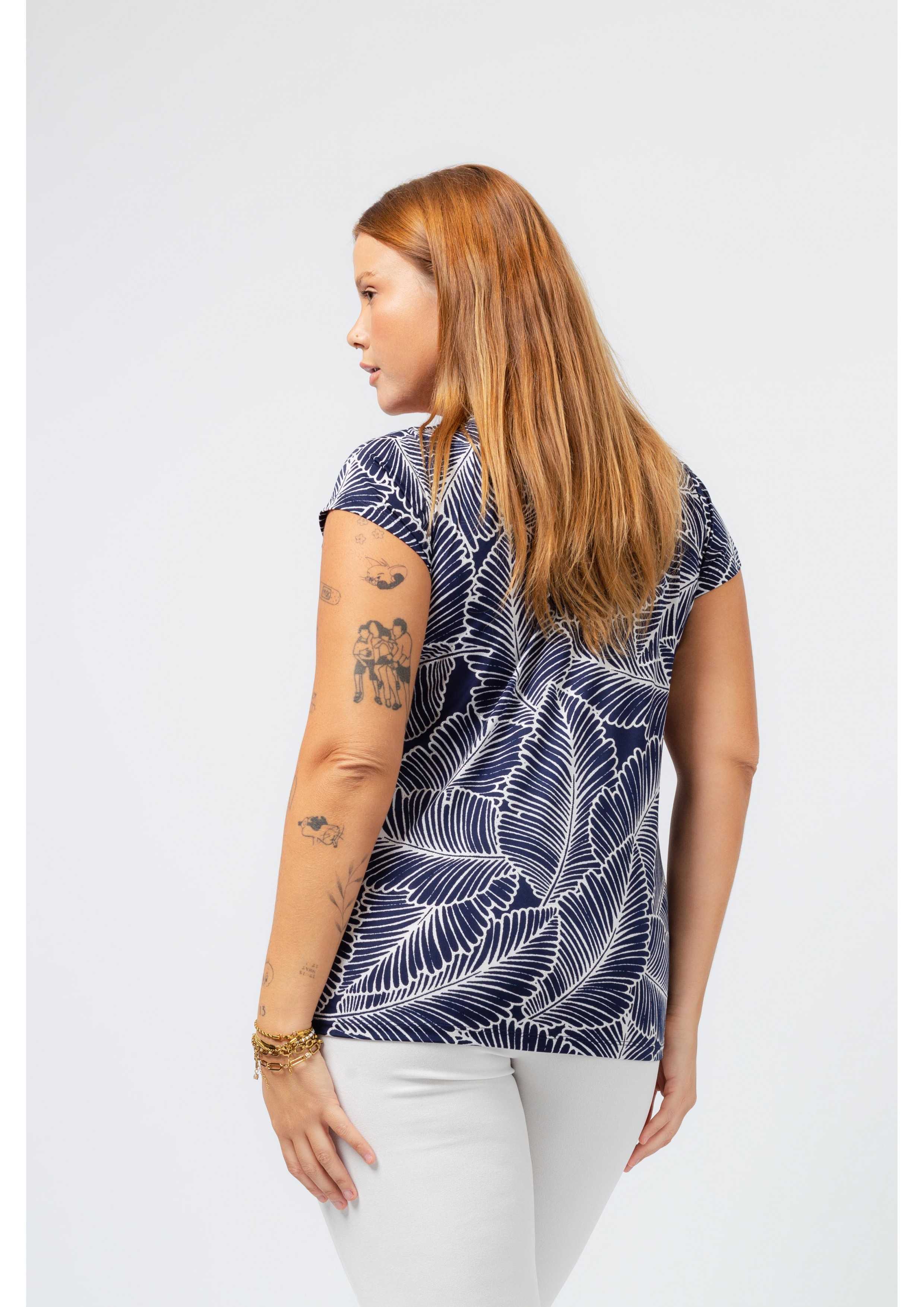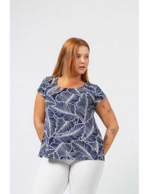Printed knit sweater, short sleeves, round neck. Cut on the shoulder with metallic application. Model with straight cut. Collection: Spring Summer Available in Plus Sizes Own design and manufacturing product. We are a clothing manufacturing brand with over 50 years of experience Model: Height 1.70m and wearing size XL. Composition: 94% Polyester 6% Elastane