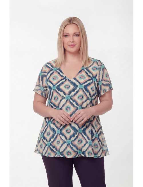 Printed resil knit tunic, blue tones, short sleeves, V-neckline. Back cut, flared model. Lined piece. Available in Plus Sizes Product of our own design and manufacture. We are a clothing manufacturing brand with over 50 years of experience