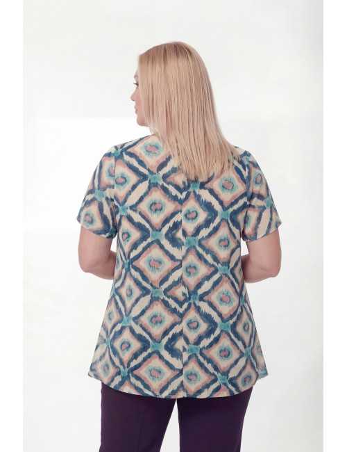 Printed resil knit tunic, blue tones, short sleeves, V-neckline. Back cut, flared model. Lined piece.