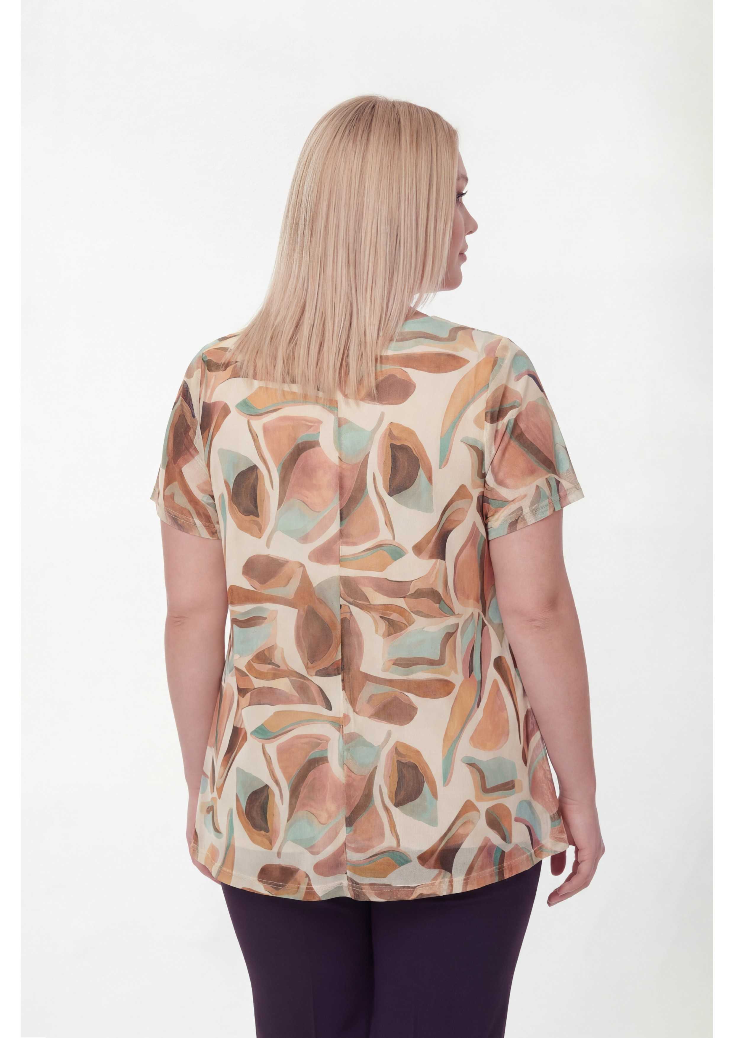 Printed resil knit tunic, camel tones, short sleeves, V-neckline. Back cut, flared style. Lined piece. Available in Plus Sizes Product of our own design and manufacture. We are a clothing manufacturing brand with over 50 years of experience
