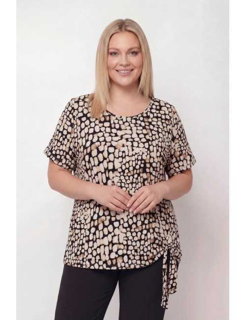 Printed knit tunic, round neckline, short sleeves. Left side with tie strap.