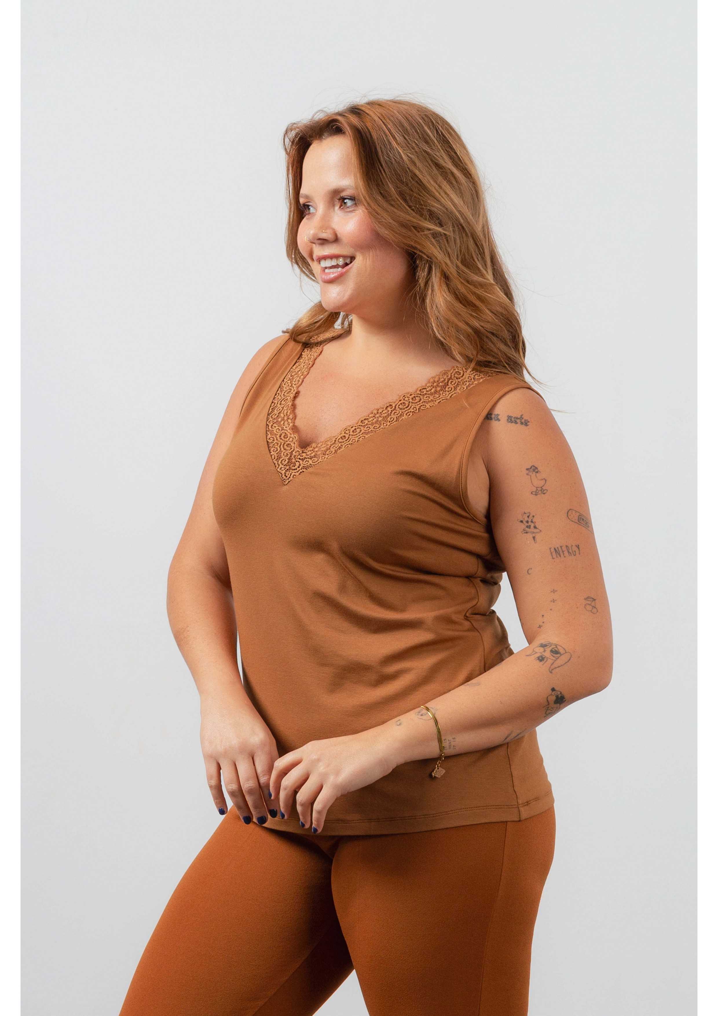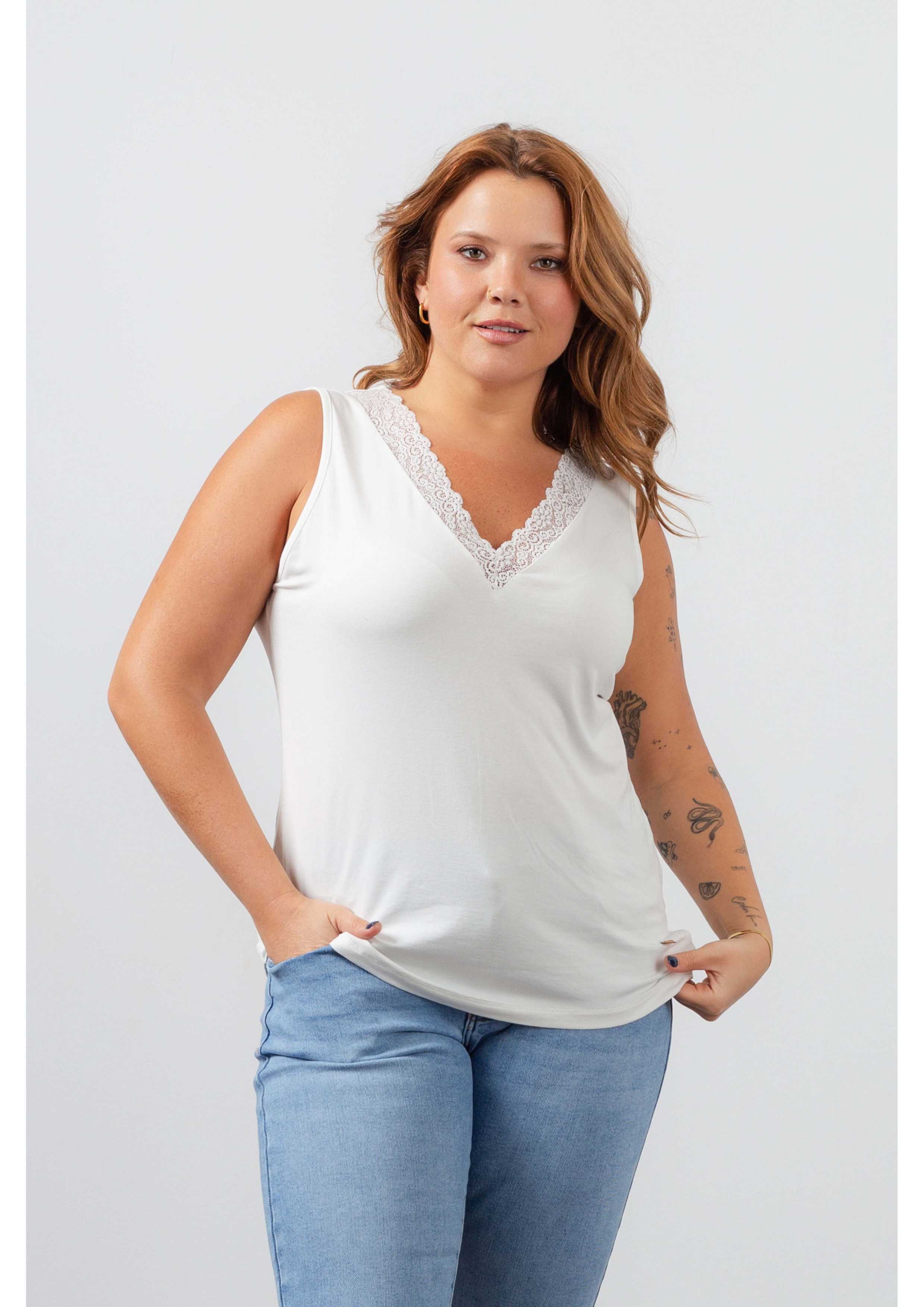 Top de malha lisa, corte recto, escote en pico con aplicación de encaje. Colección: Primavera Verano Modelo 1: Altura 1.80m y está vistiendo la talla 4XL Modelo 2: Altura 1.70m y está vistiendo la talla XL