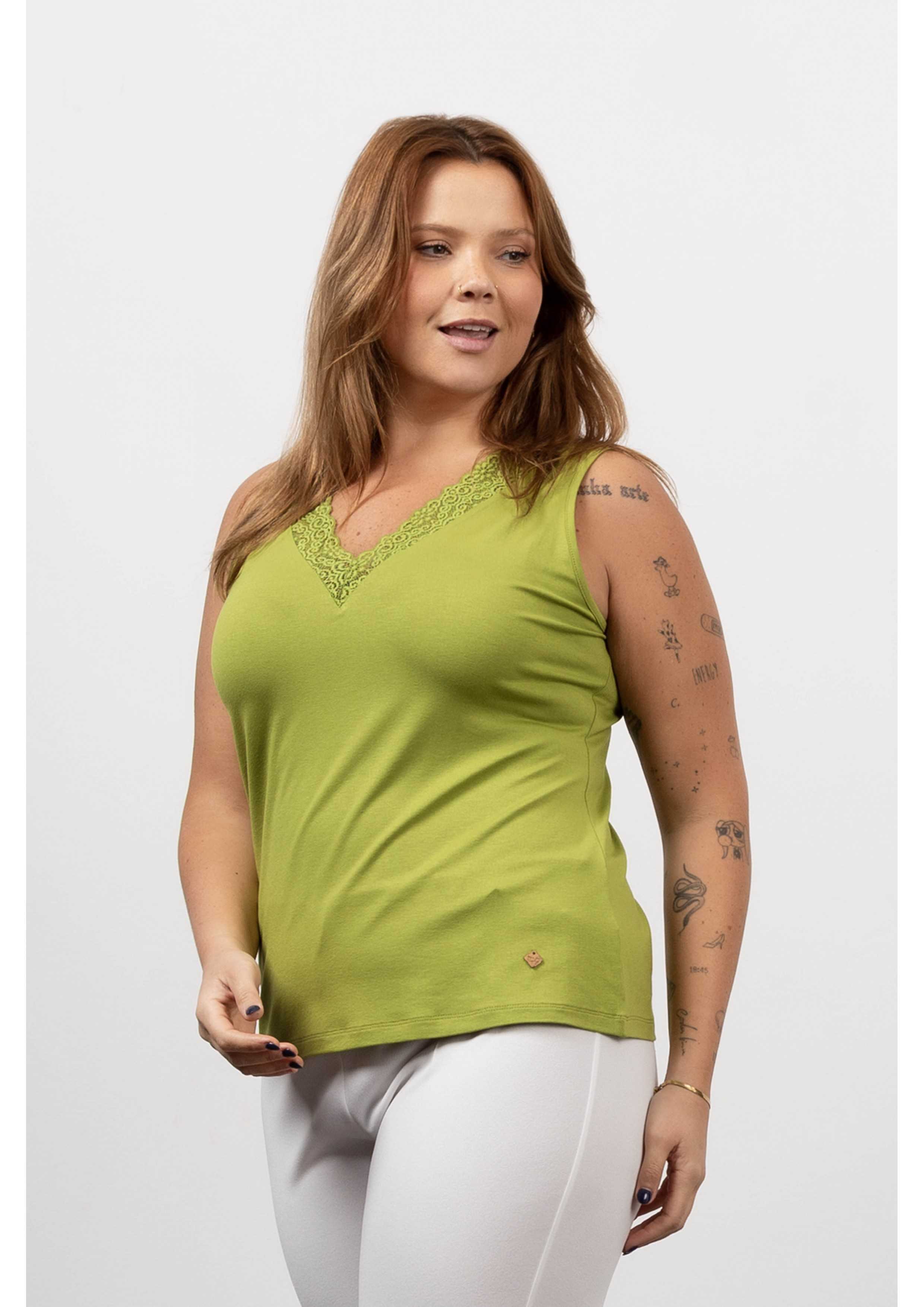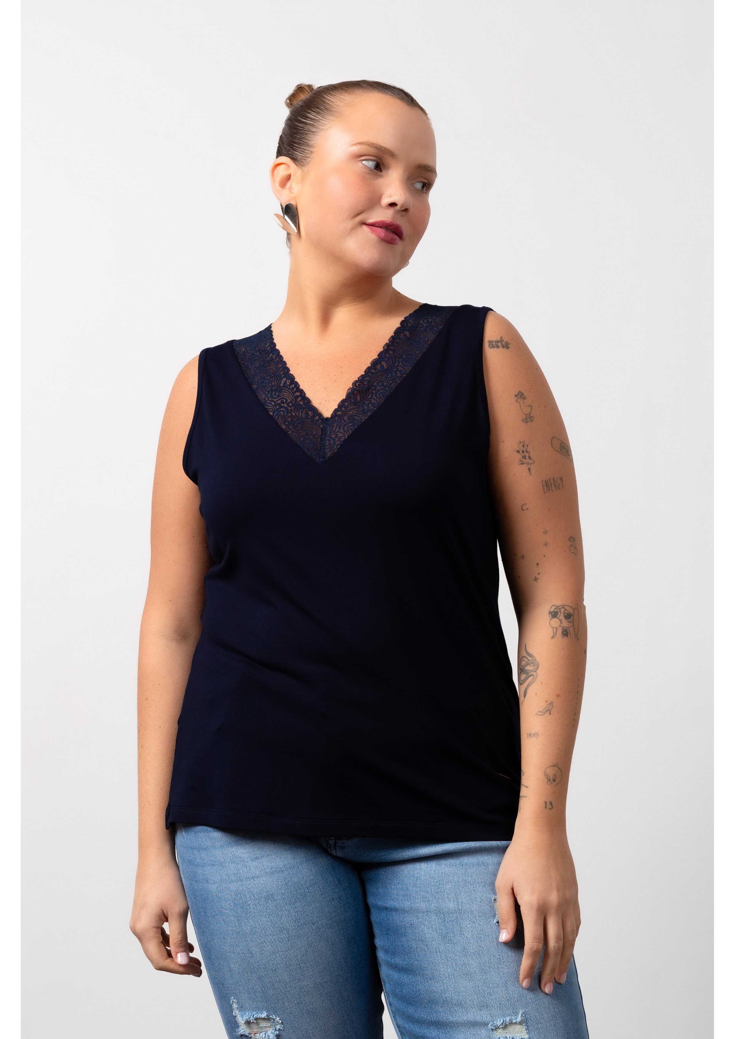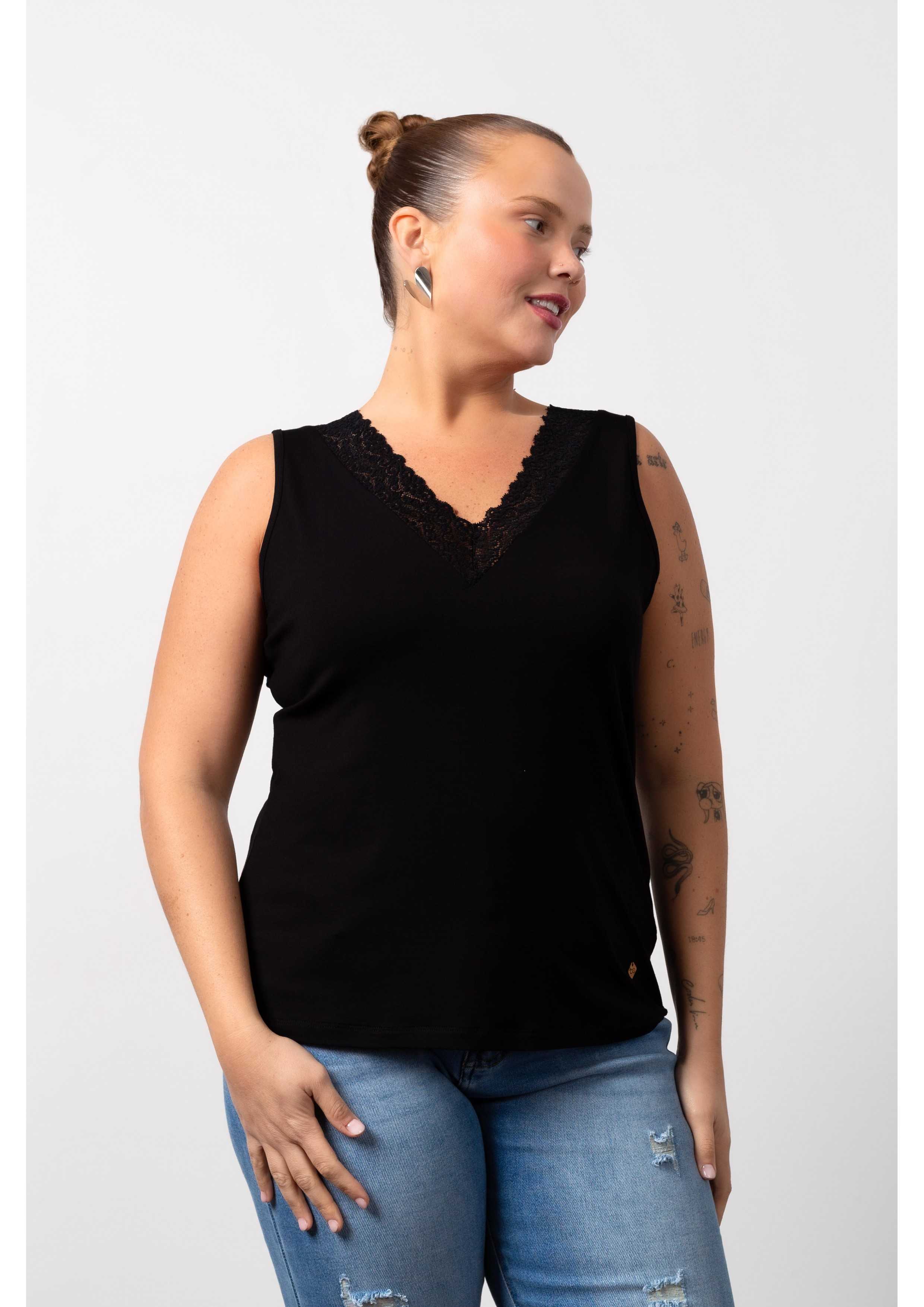 Top de malha lisa, corte recto, escote en pico con aplicación de encaje. Colección: Primavera Verano Disponible en Tallas Grandes Producto de diseño y fabricación propia. Somos una marca de confección de ropa con más de 50 años de experiencia Modelo: Altura 1.70m y está vistiendo la talla 2XL.