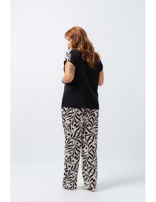 Conjunto en tejido liso y estampado. Pantalón estampado con bolsillos laterales, elástico alto en la cintura cubierto. Túnica en tejido liso con escote redondo, aberturas laterales, ajuste en los hombros y en el frente en tejido estampado. Colección: Primavera Verano Disponible en Tallas Grandes Producto de diseño y fabricación propia. Somos una marca de confección de ropa con más de 50 años de experiencia Modelo: Altura 1.70m y está usando la talla XL. Composición: 99%Poliéster 1%Elastano| 100%Poliéster