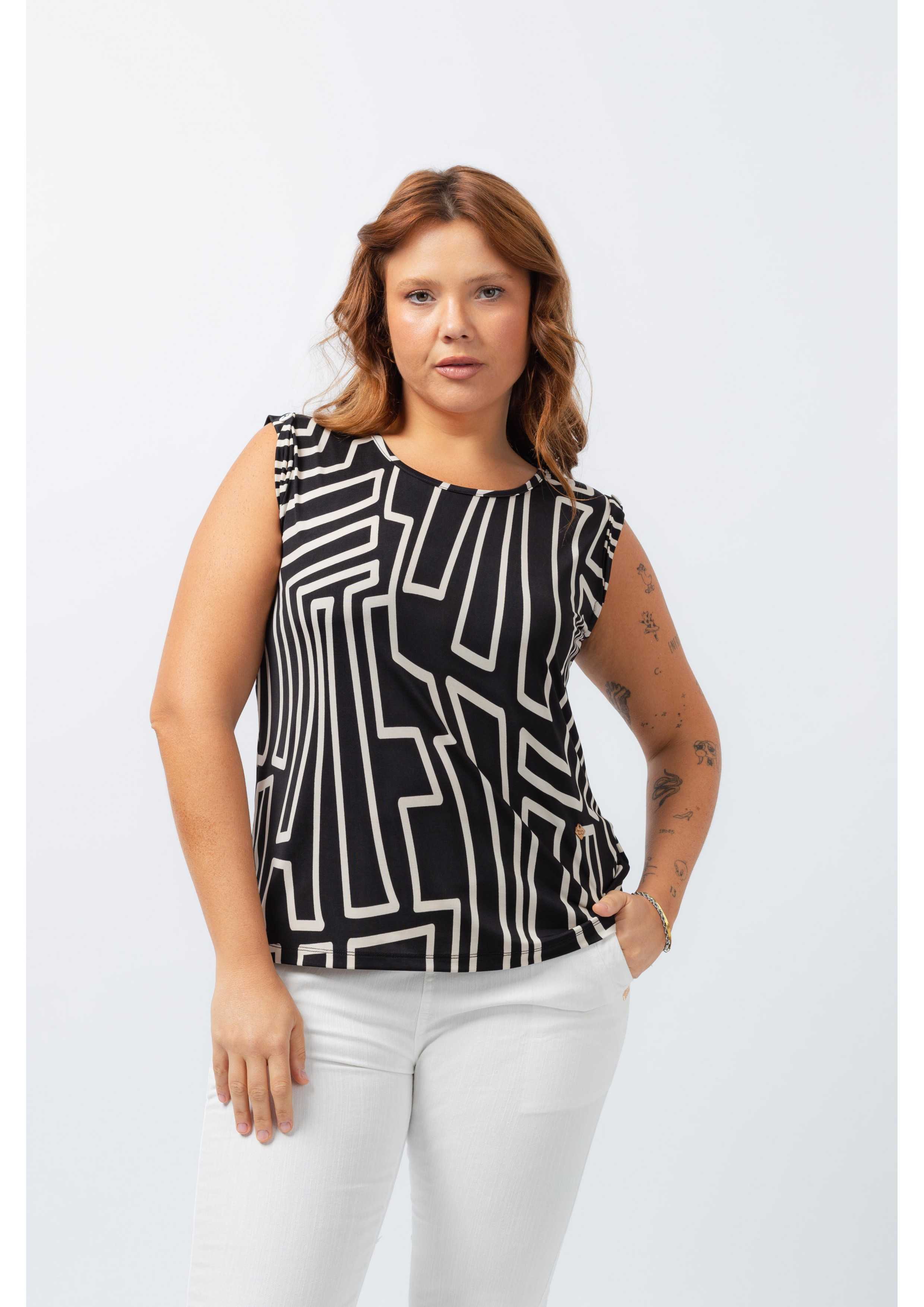 Top de malha estampada, pequeña manga copa doblada y clavada con botón en la parte superior del hombro. Escote redondo. Colección: Primavera Verano Modelo 1: Altura 1.80m y está usando la talla 4XL en negro Modelo 2: Altura 1.70m y está usando la talla XL