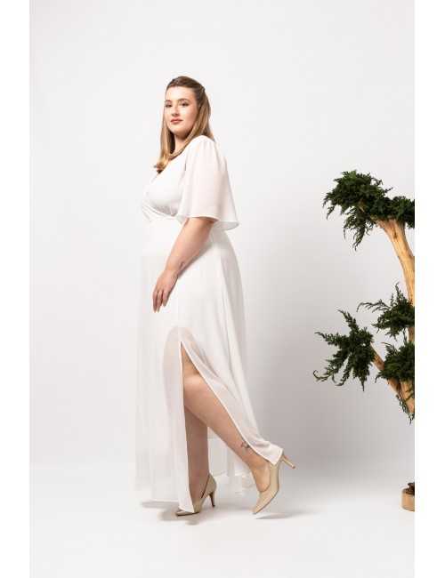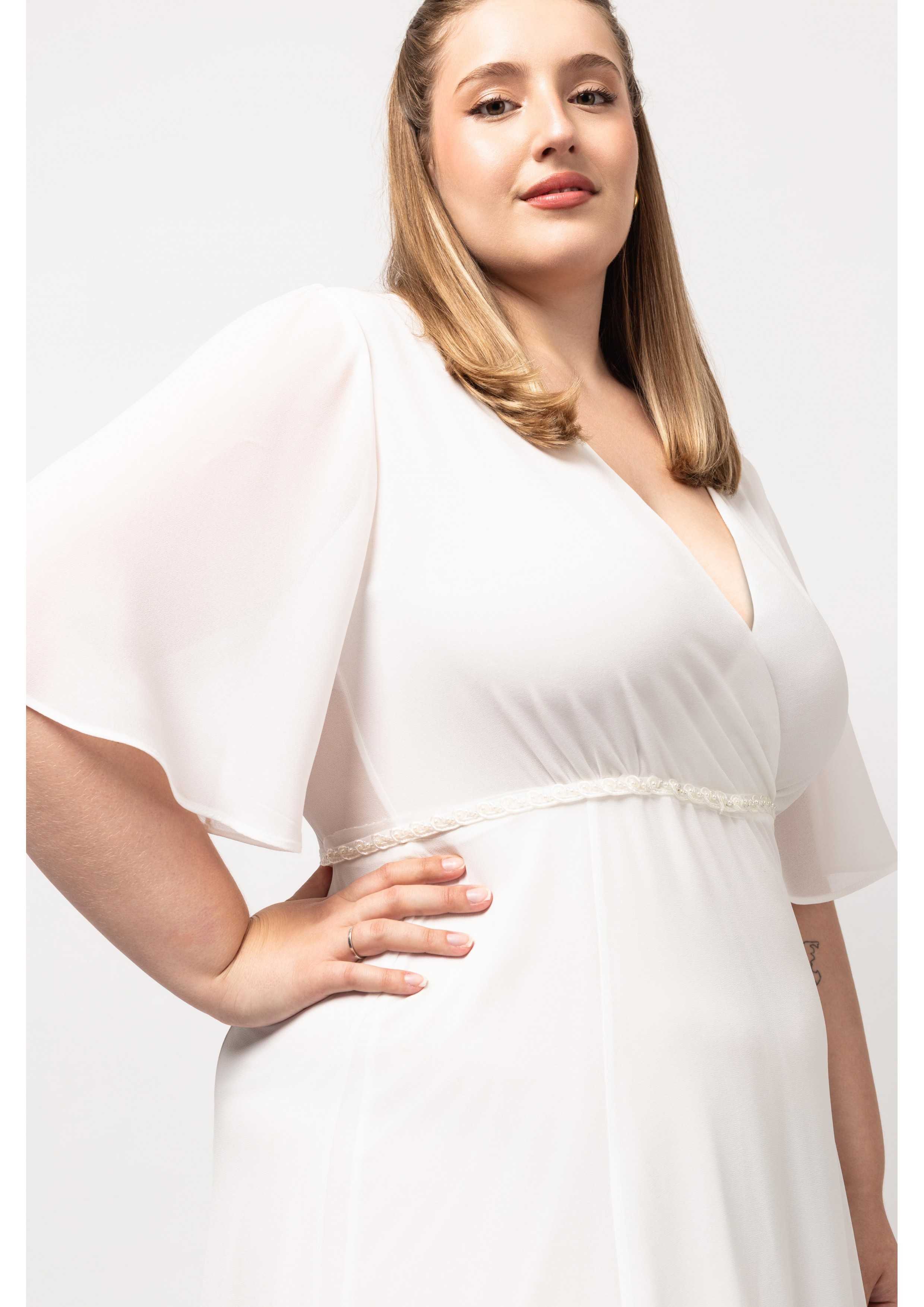 Vestido en tejido liso. Pecho en trespase, falda larga y redonda. Corte lateral delantero. Manga corta efecto campana. Aplicación en el corte del pecho con cinta de perlas. Colección: Primavera Verano Disponible en Tamanhos Grandes Producto de diseño y fabricación propia. Somos una marca de confección de ropa con más de 50 años de experiencia Modelo: Altura 1.80m y está vistiendo la talla 3XL. Composición: 100%Poliéster|FORRO 94%Poliéster 6%Elastano