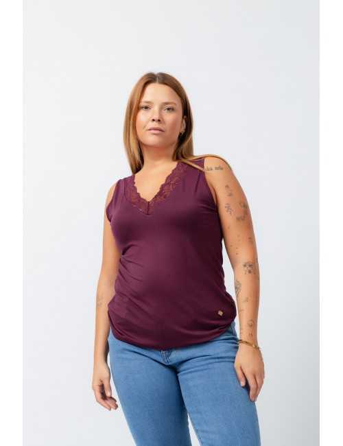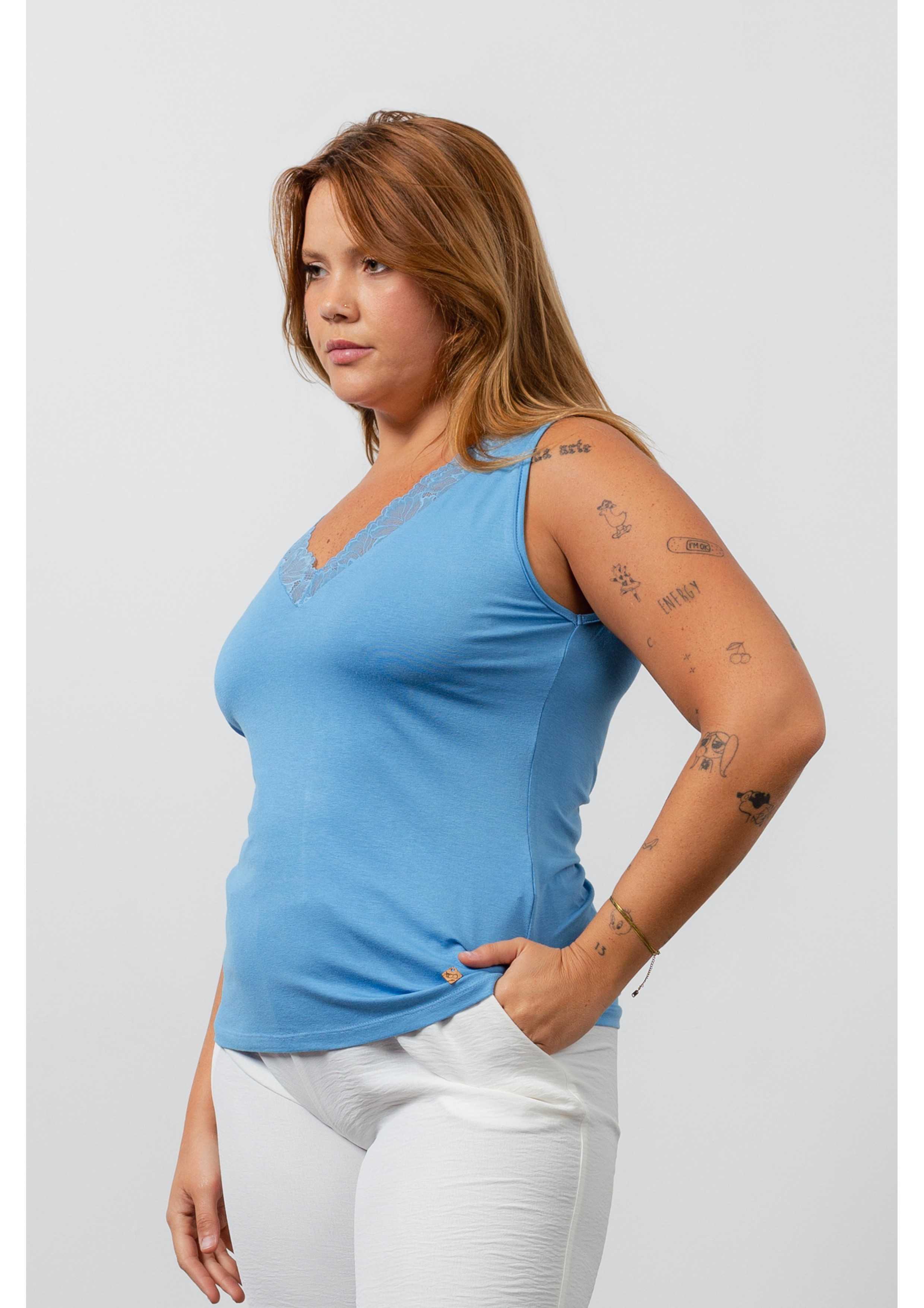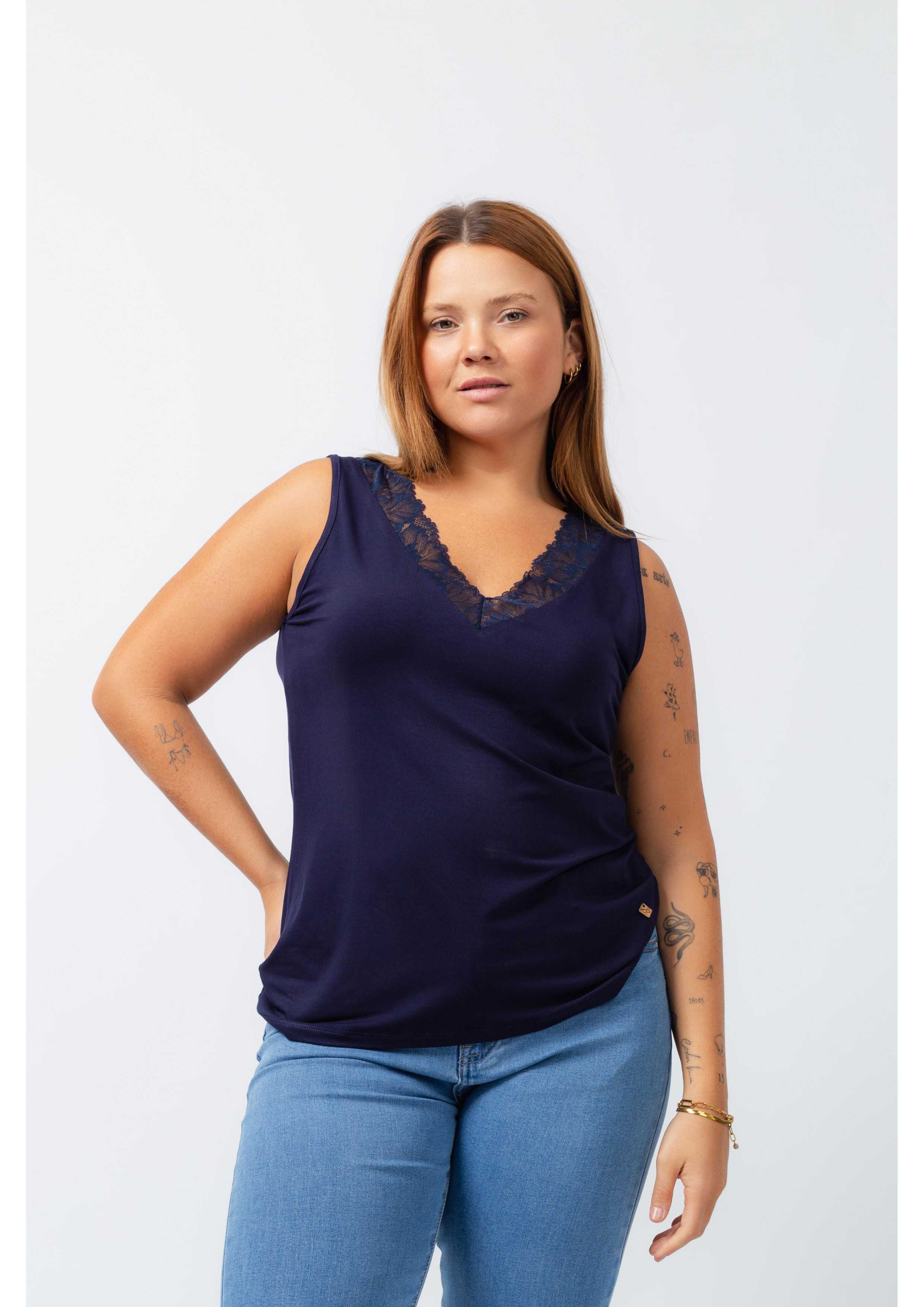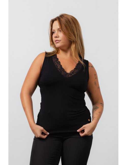 Top de malla lisa, corte recto, escote en pico con aplicación de encaje. Colección: Primavera Verano Disponible en Tallas Grandes Producto de diseño y fabricación propia. Somos una marca de confección de ropa con más de 50 años de experiencia Modelo: Altura 1.70m y está vistiendo la talla XL. Composición: 94%Viscosa 6%Elastano