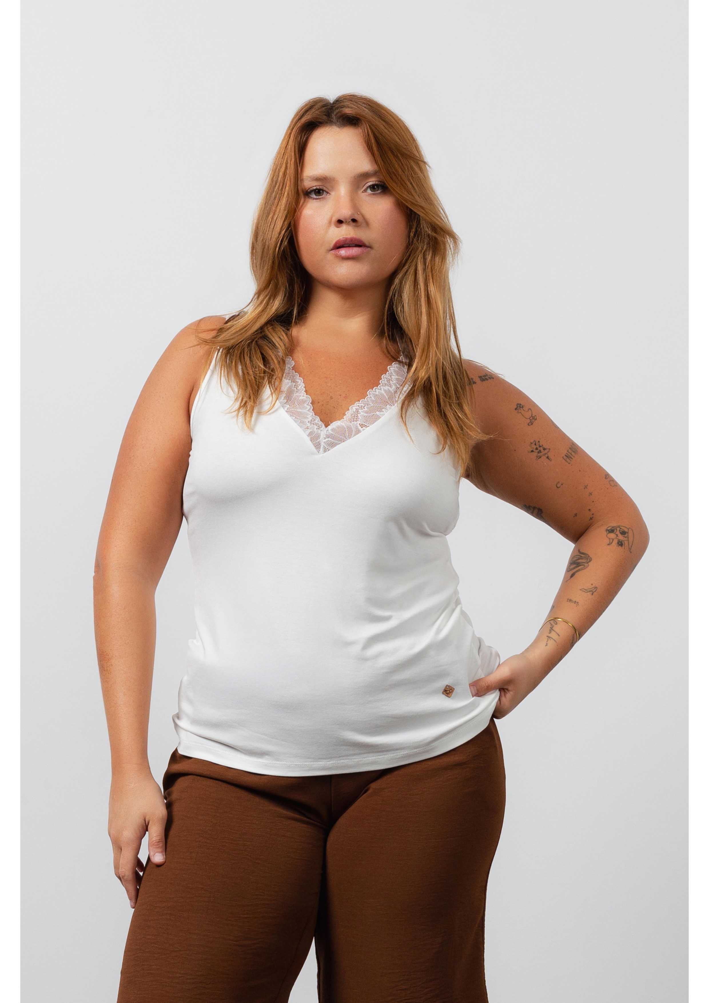 Top de malla lisa, corte recto, escote en pico con aplicación de encaje. Colección: Primavera Verano Modelo: Altura 1.70m y está vistiendo la talla XL.