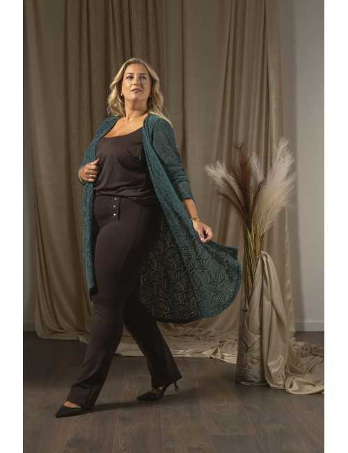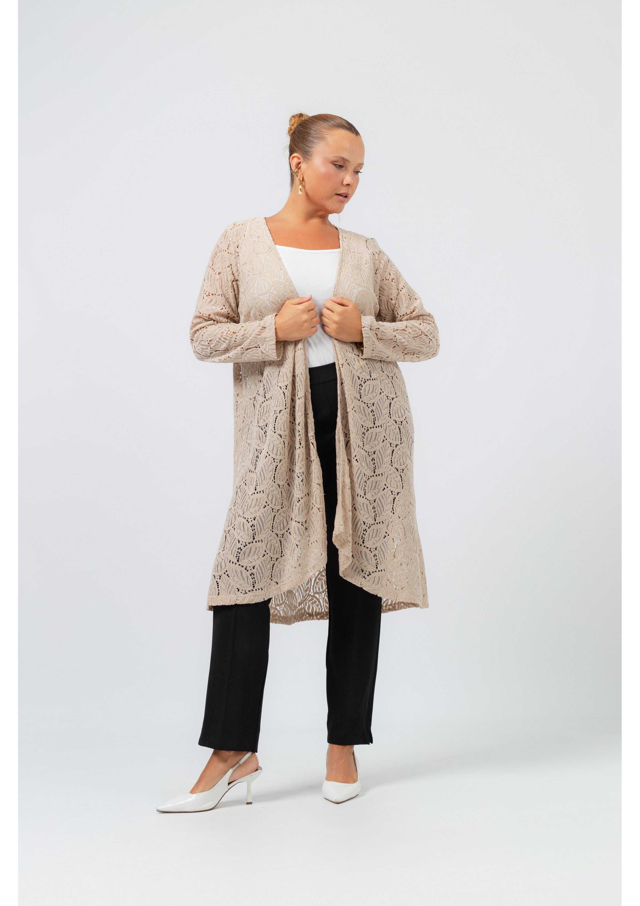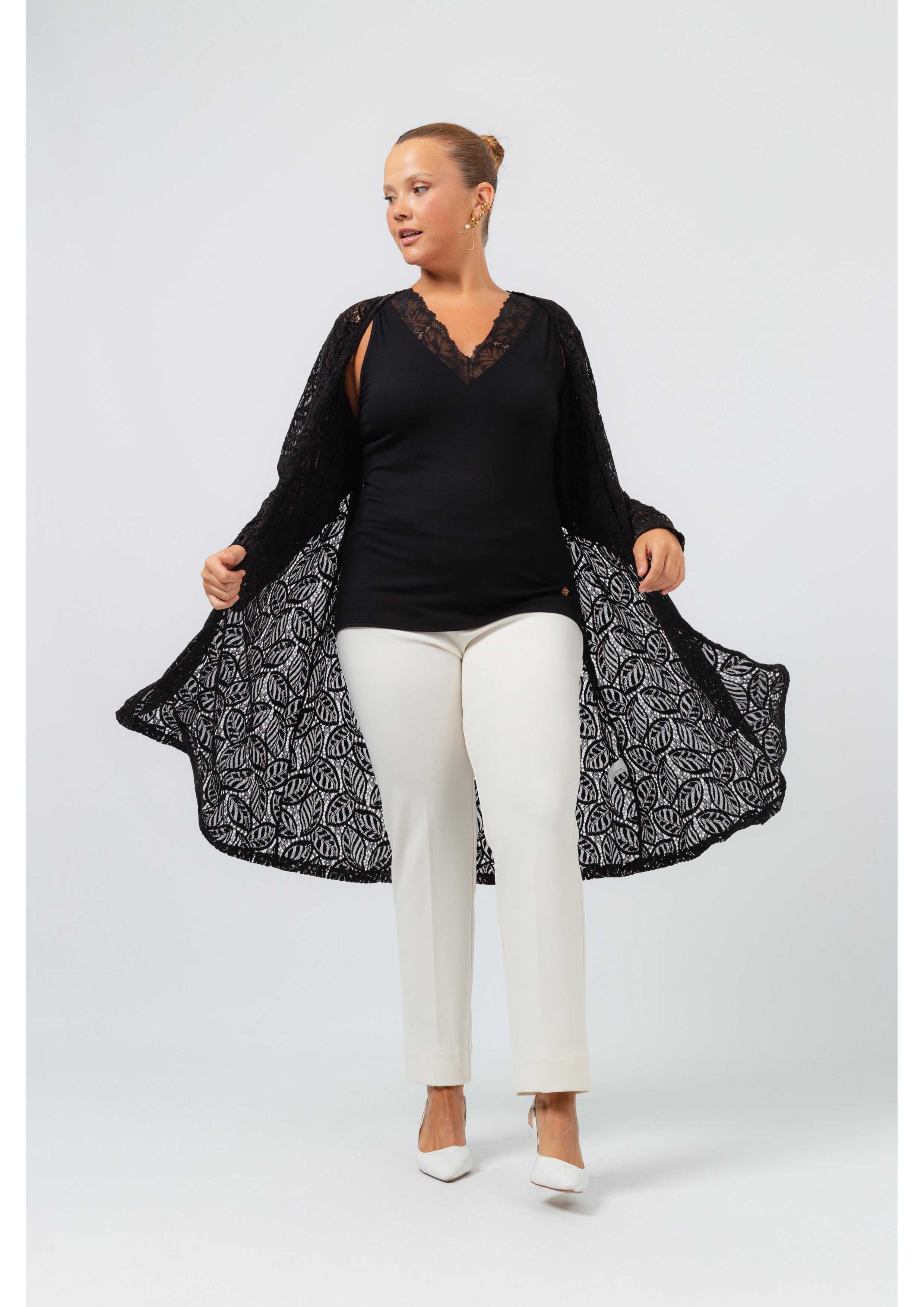 Chaqueta de encaje lisa, manga larga, corte ligeramente evasé, picos en la parte inferior, frente abierto y caído. Colección: Otoño Invierno Disponible en Tallas Grandes Producto de diseño y fabricación propia. Somos una marca de confección de ropa con más de 50 años de experiencia Modelo: Altura 1.65m y está usando la talla 3XL. Modelo: Altura 1.70m y está usando la talla 2XL. Composición: 55% Poliéster 45% Poliamida