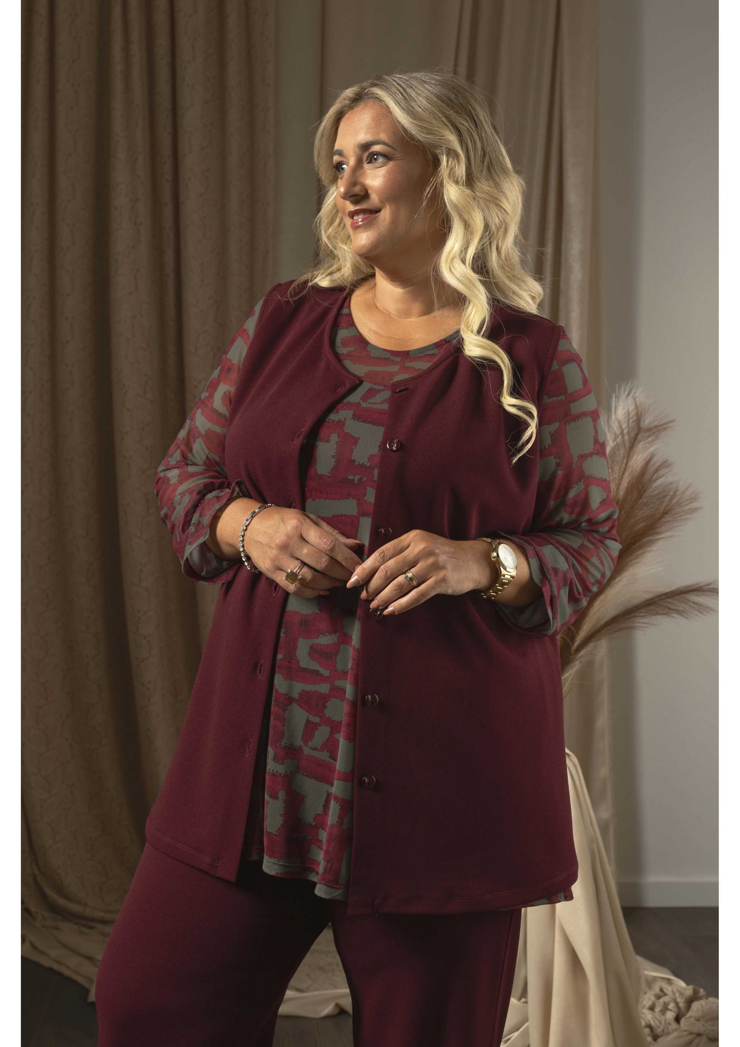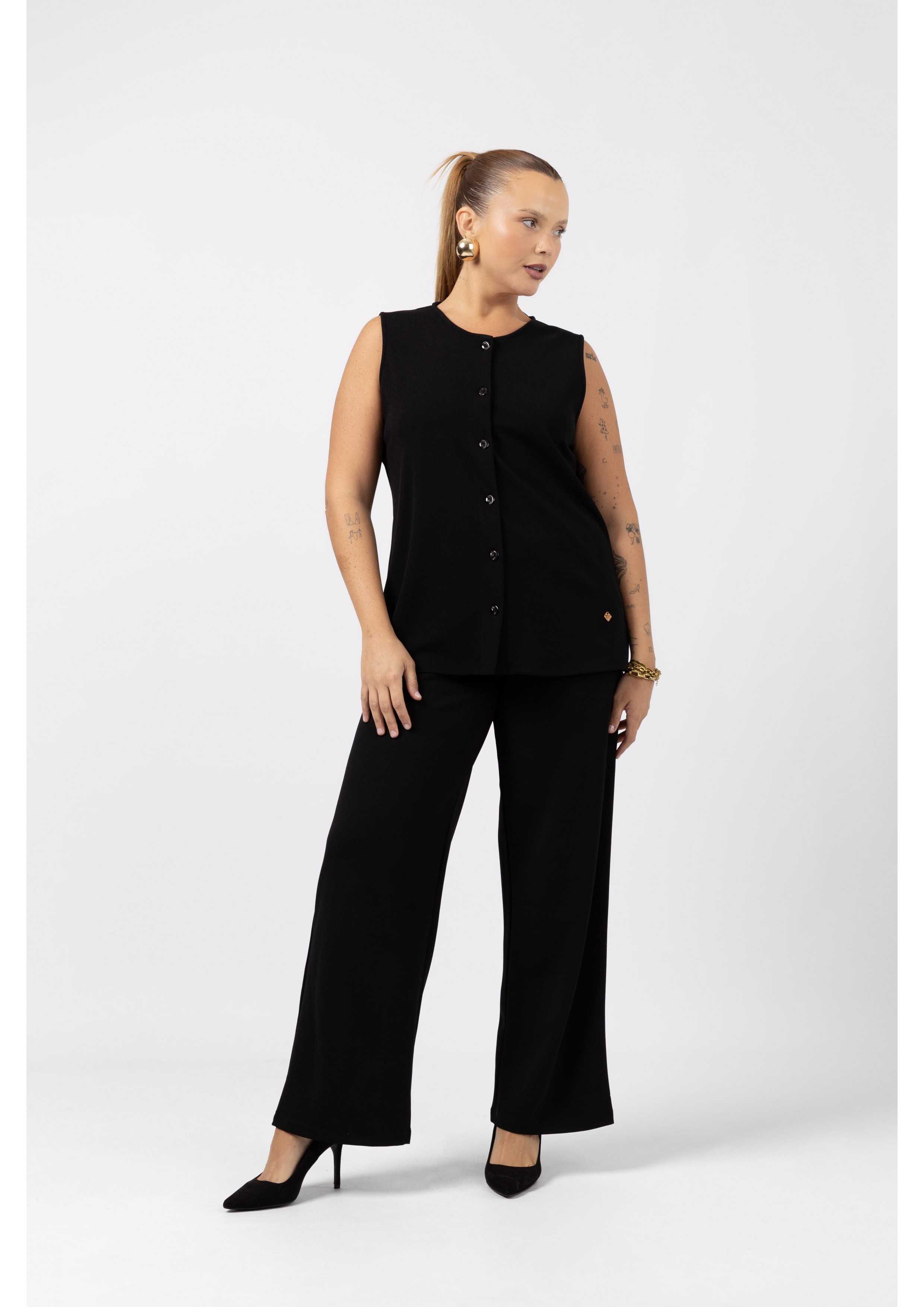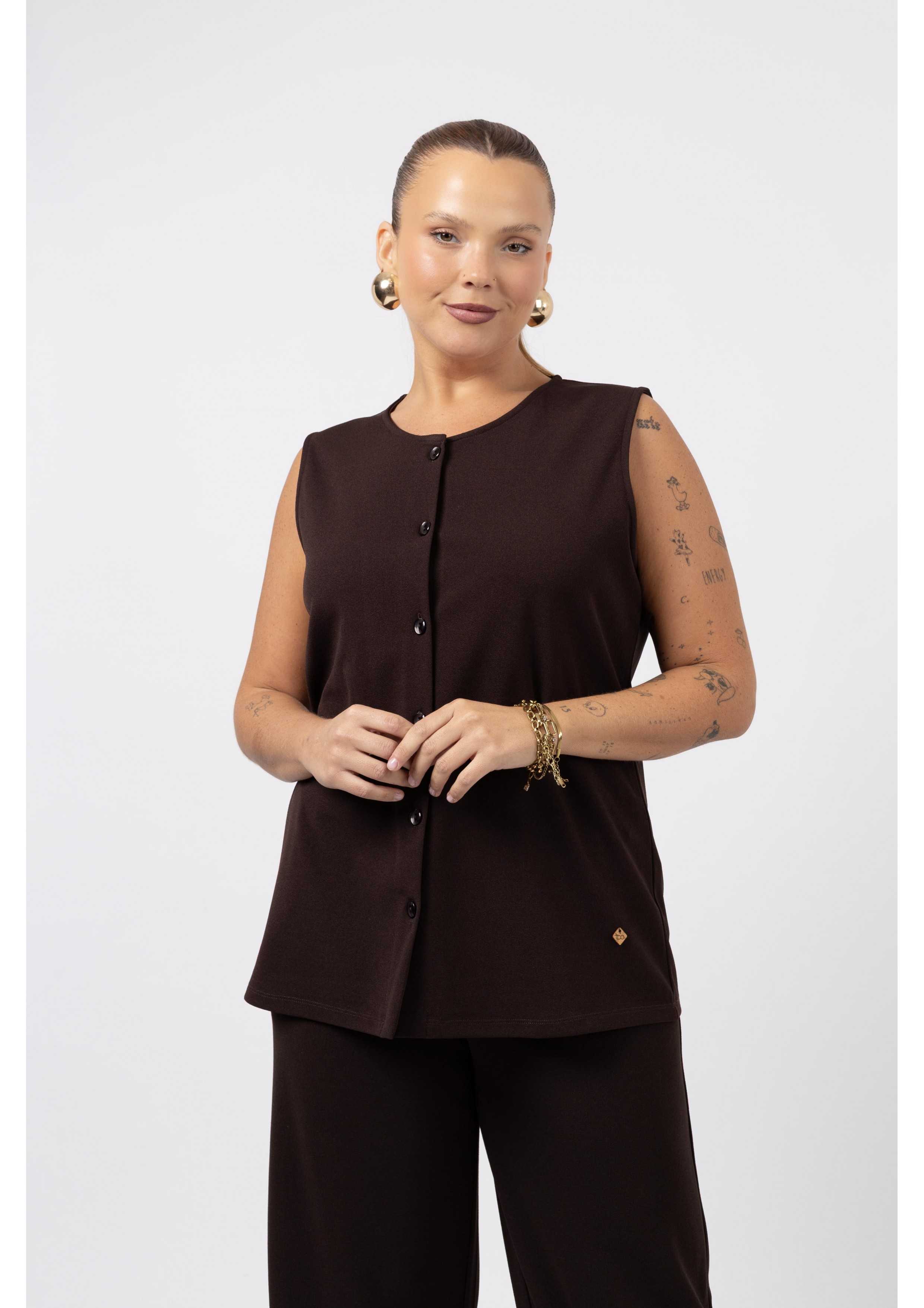 Chaleco de punto liso con botones. Colección: Otoño Invierno Disponible en Tallas Grandes Producto de diseño y fabricación propia. Somos una marca de confección de ropa con más de 50 años de experiencia Modelo: Altura 1.56m y está vistiendo la talla 3XL. Composición: 95% Poliéster 5% Elastano