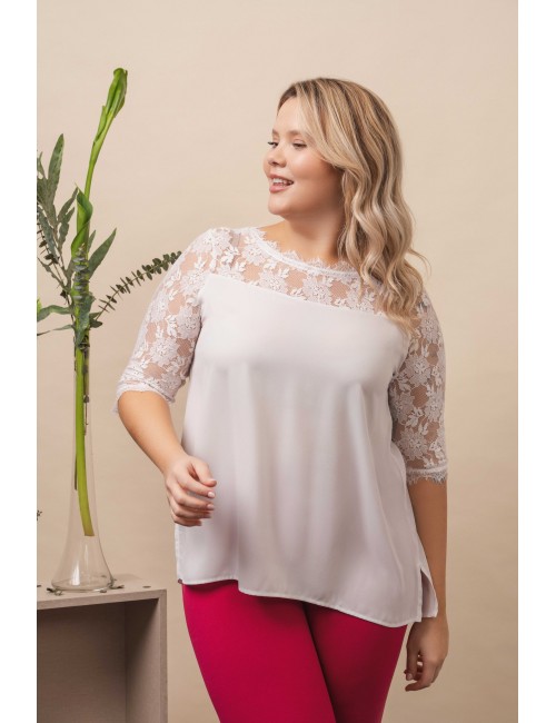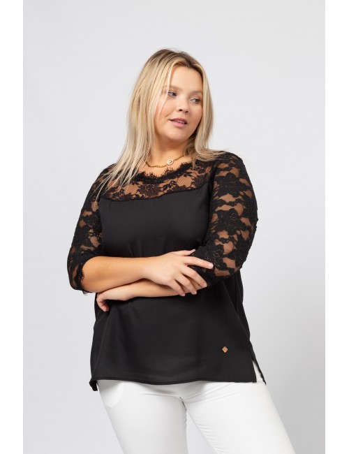 Próximamente disponible Blusa de tejido con manga 3/4 de encaje, y aberturas en los laterales Colección: Primavera Verano Disponible en Tallas Grandes Producto de diseño y fabricación propia. Somos una marca de confección de ropa con más de 50 años de experiencia Modelo: Altura 1.70m y está usando la talla 2XL.