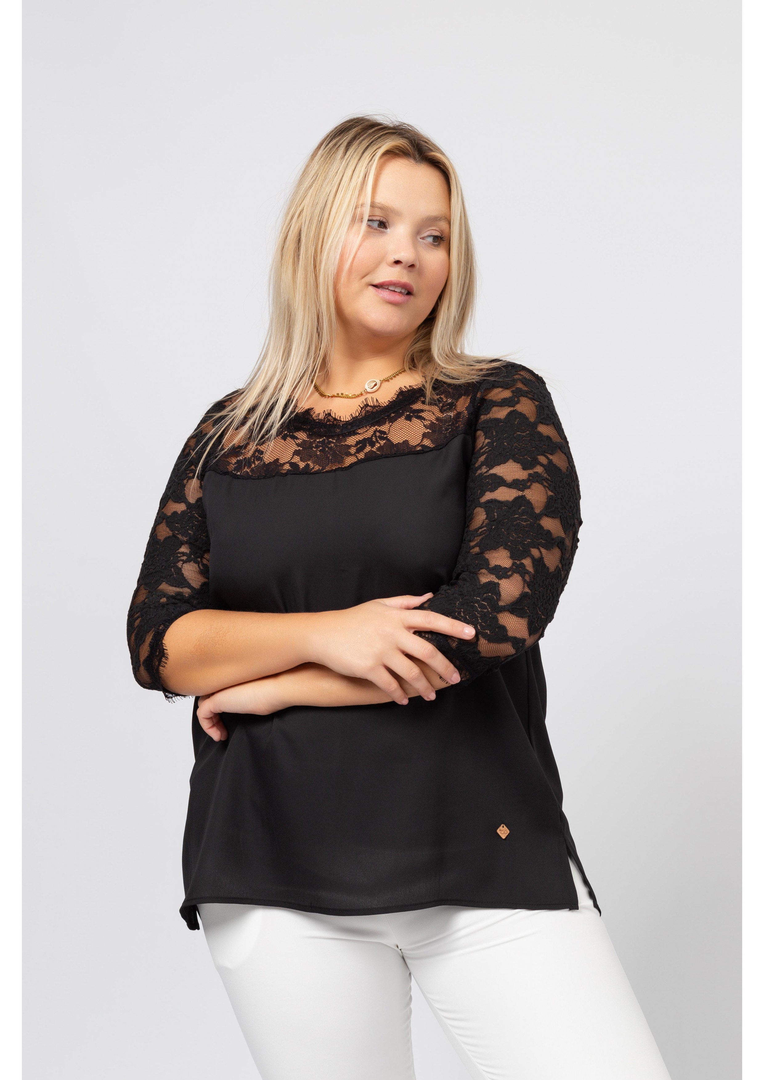 Próximamente disponible Blusa de tejido con manga 3/4 de encaje, y aberturas en los laterales Colección: Primavera Verano Modelo: Altura 1.70m y está usando la talla 2XL.