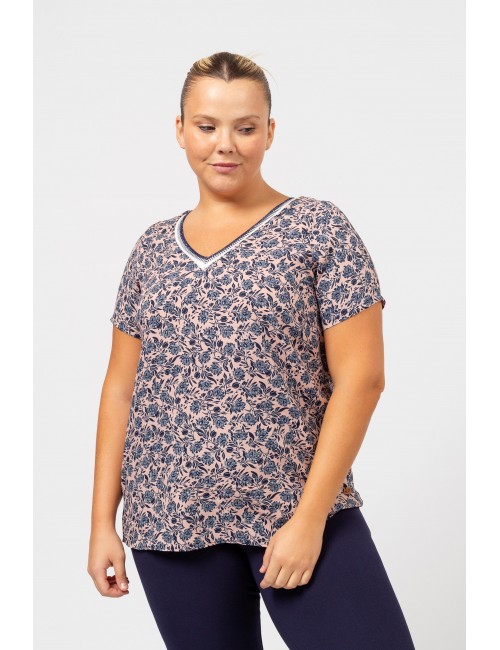 Blusa de tejido estampado, manga corta, escote en pico con tira recta con apunte de hilo lurex. Colección: Primavera Verano Disponible en Tallas Grandes Producto de diseño y fabricación propia. Somos una marca de confección de ropa con más de 50 años de experiencia Modelo: Altura 1.70m y está vistiendo la talla 2XL. Composición: 100%Poliéster