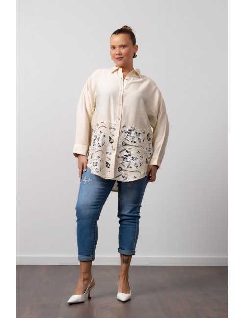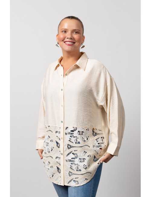 Blusa de tela lisa, ajuste en la parte inferior delantera en encaje trabajado. Manga larga con puños y cuello de camisa. Modelo: Altura 1.70m y está usando la talla 2XL