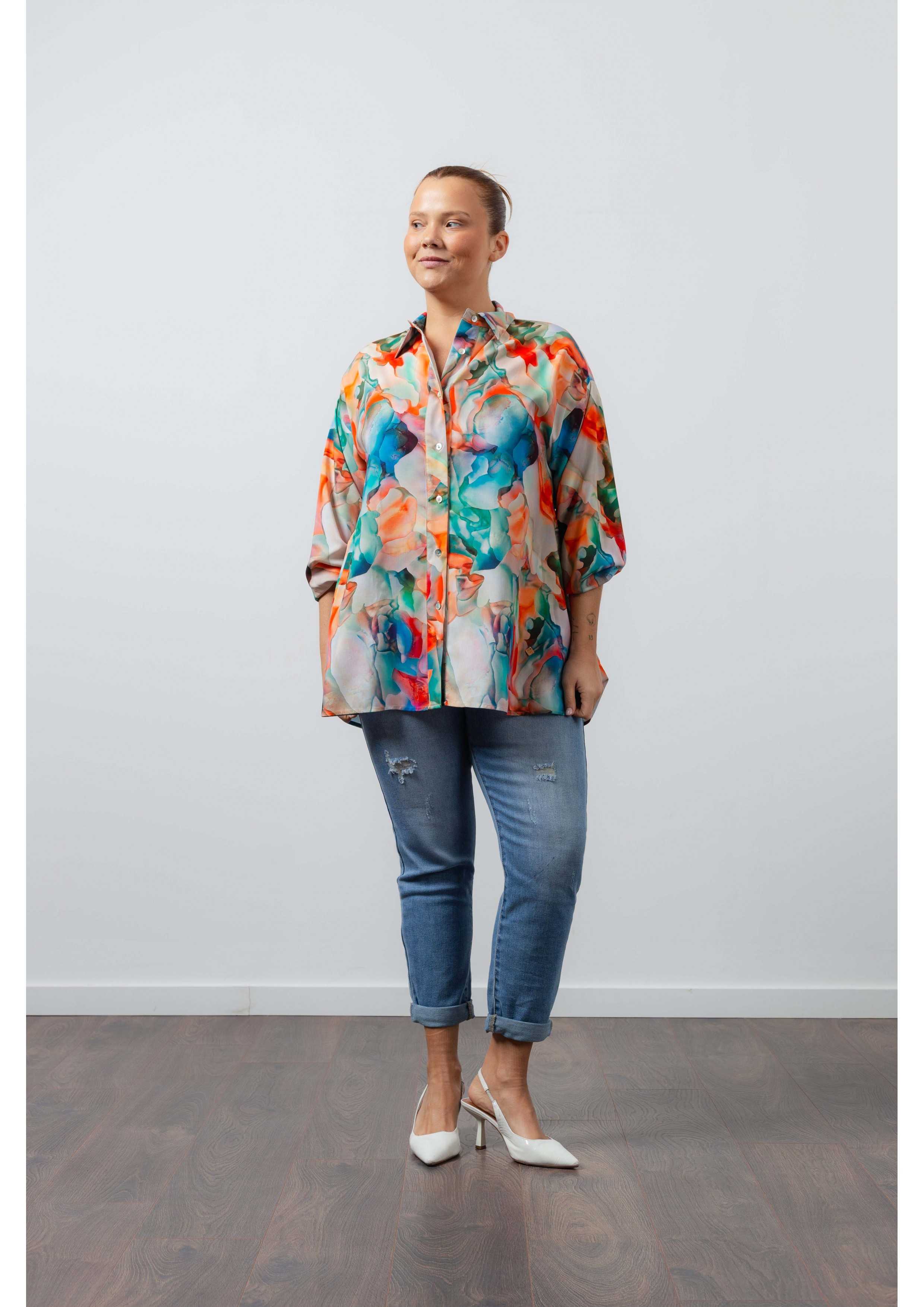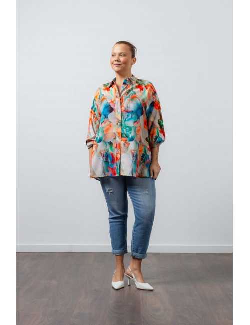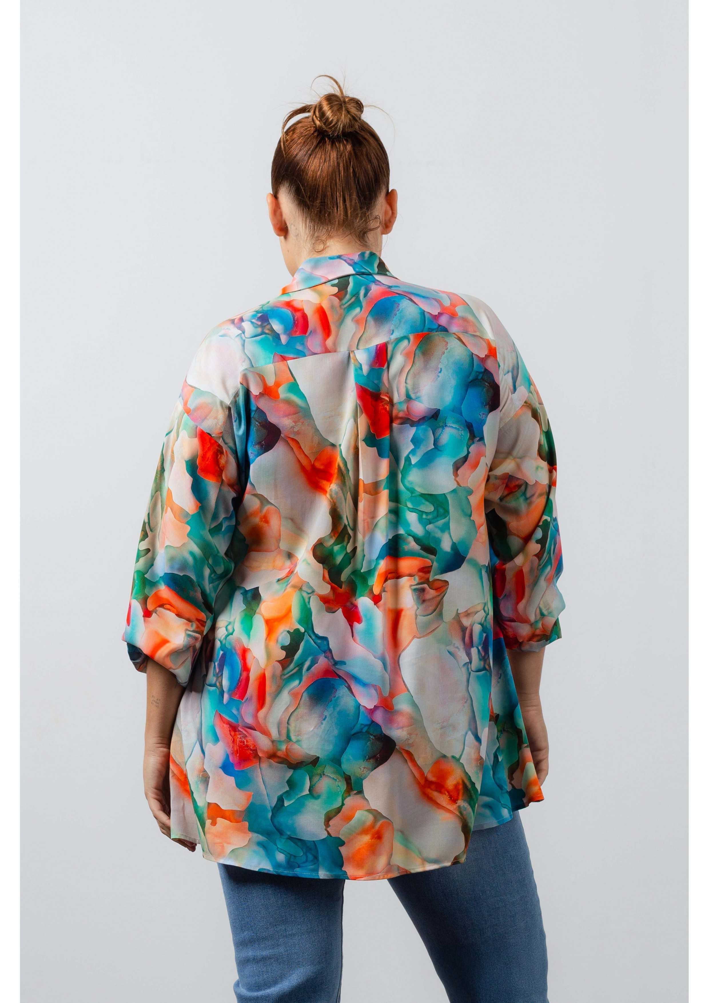 Blusa de tela estampada, manga 3/4 con presilla, abertura en la parte frontal con tapeta. Modelo ligeramente evasé. Colección: Primavera Verano Modelo: Altura 1.70m y está usando la talla XL.