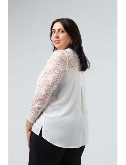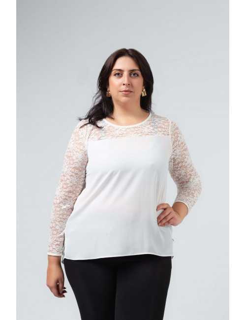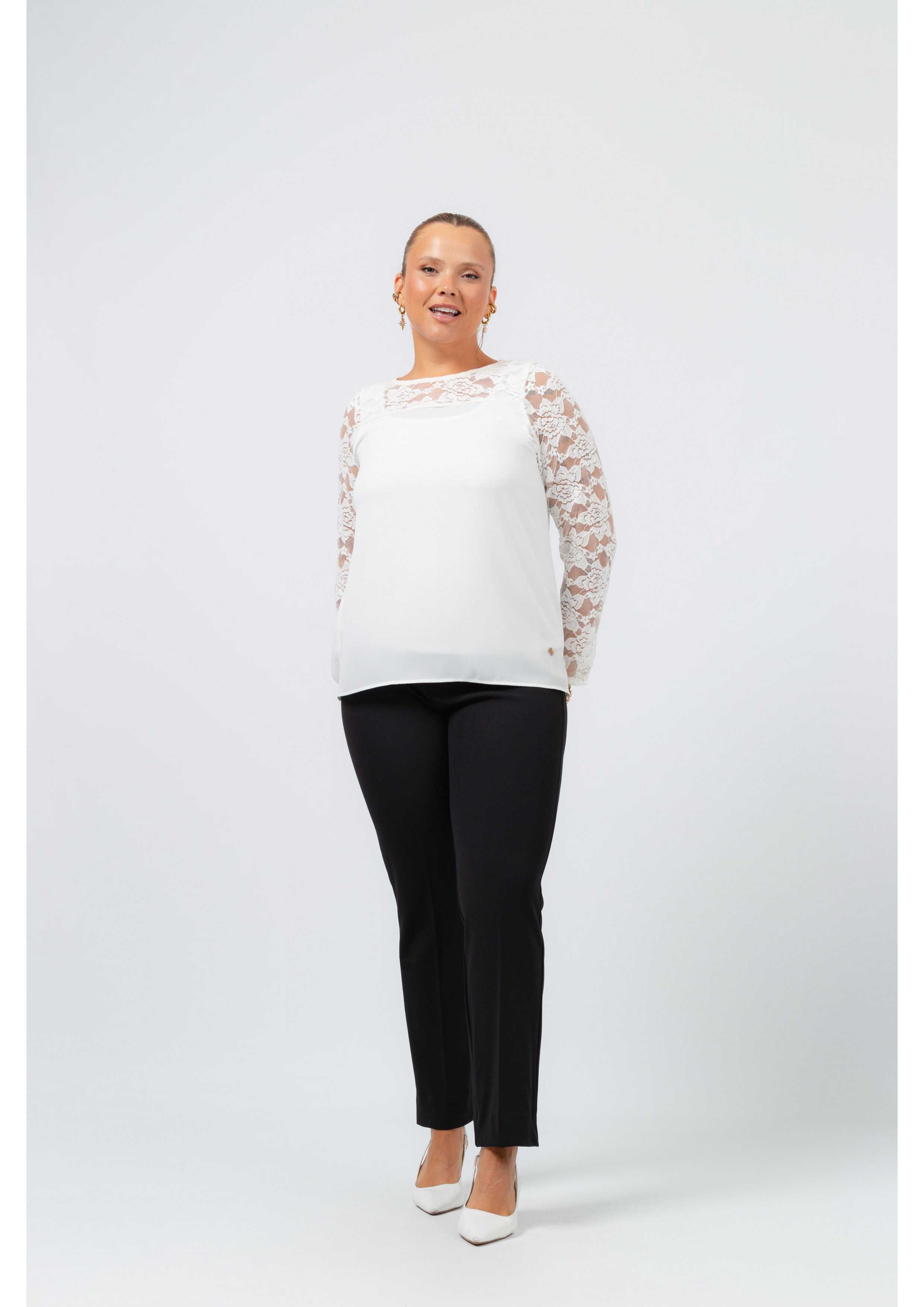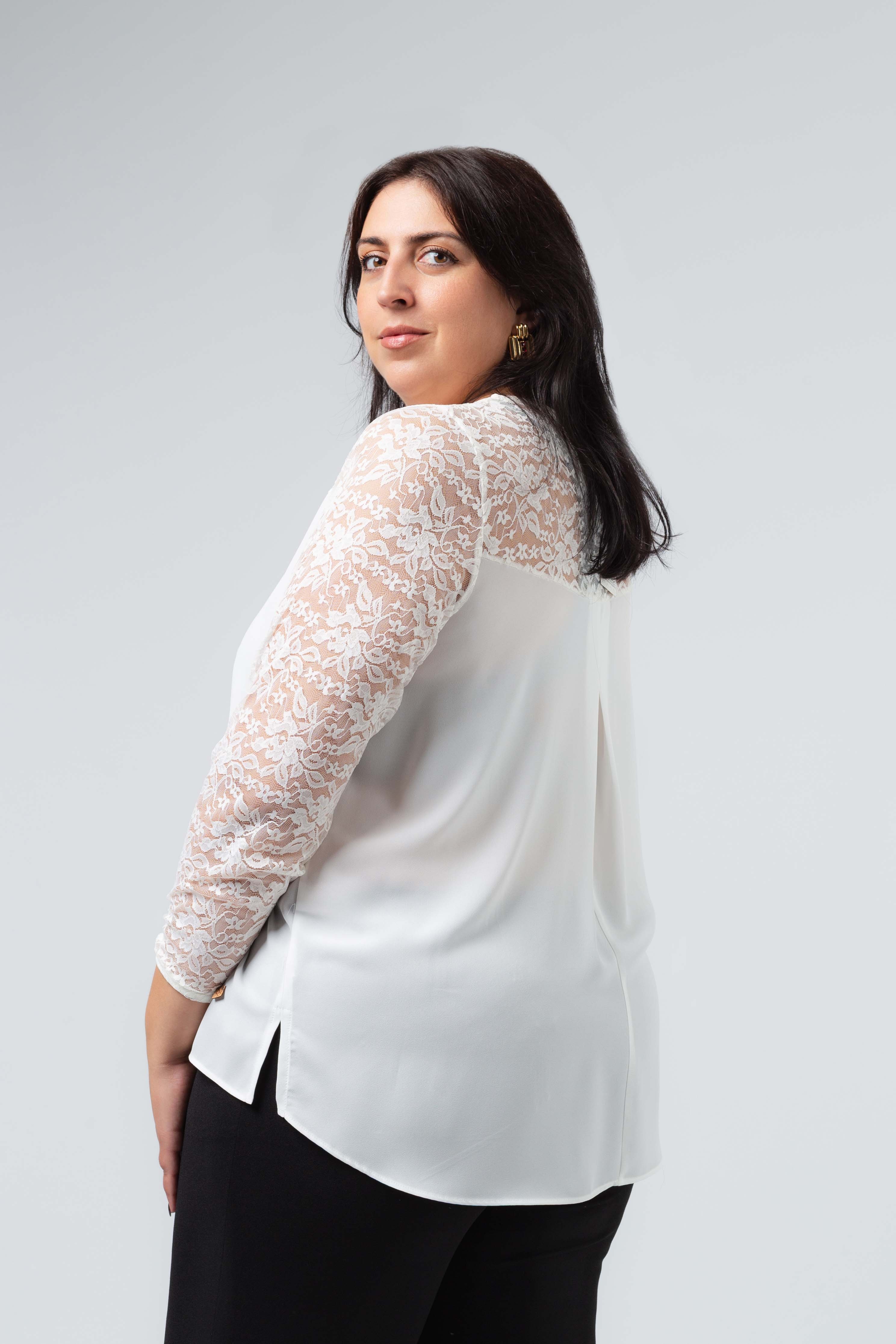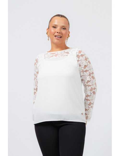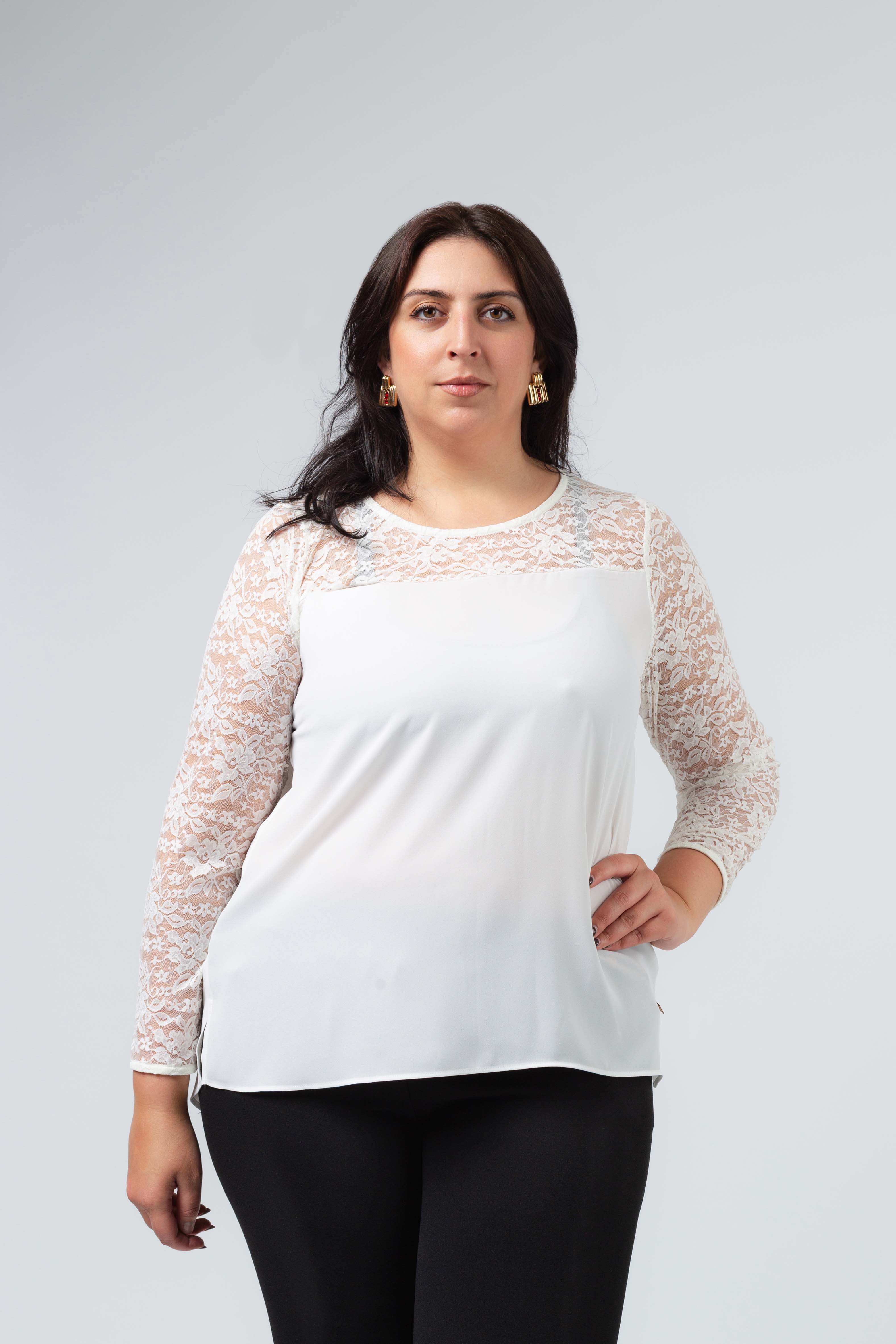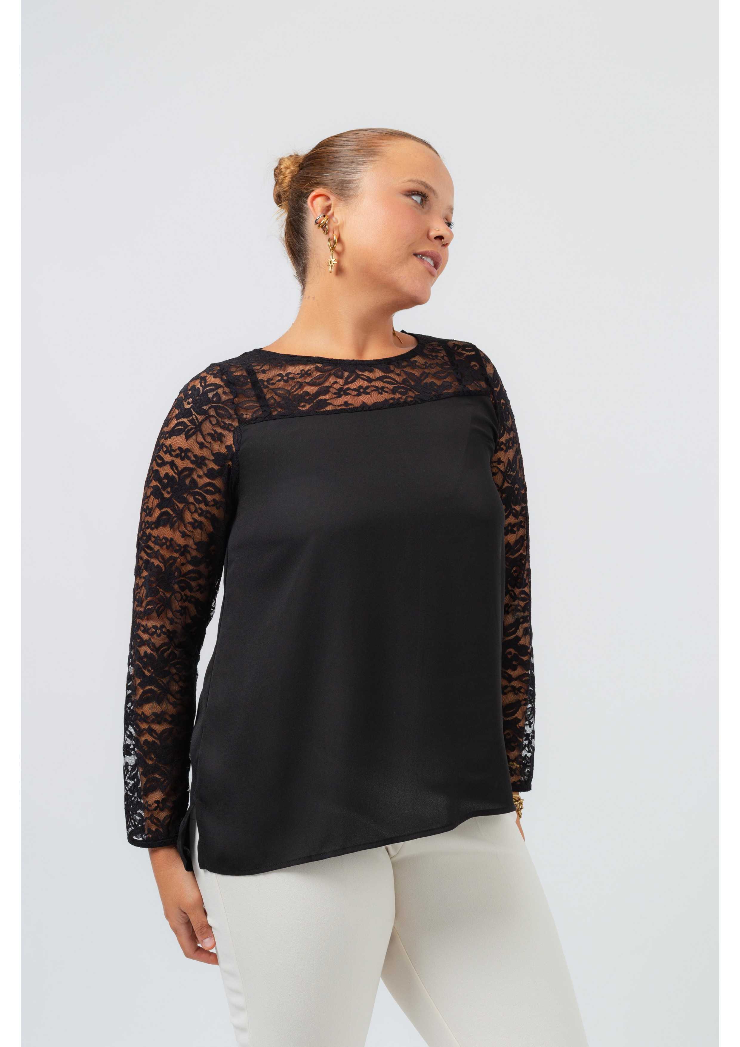 Blusa de tejido liso, mangas largas de encaje y escapularios en frente y espalda. Corte en la espalda, aberturas laterales. Escote redondo también en encaje. Colección: Otoño Invierno Disponible en Tallas Grandes Producto de diseño y fabricación propia. Somos una marca de confección de ropa con más de 50 años de experiencia Modelo: Altura 1.70m y está usando la talla XL. Composición: 100%Poliéster| 88%Nylon 12%Elastano