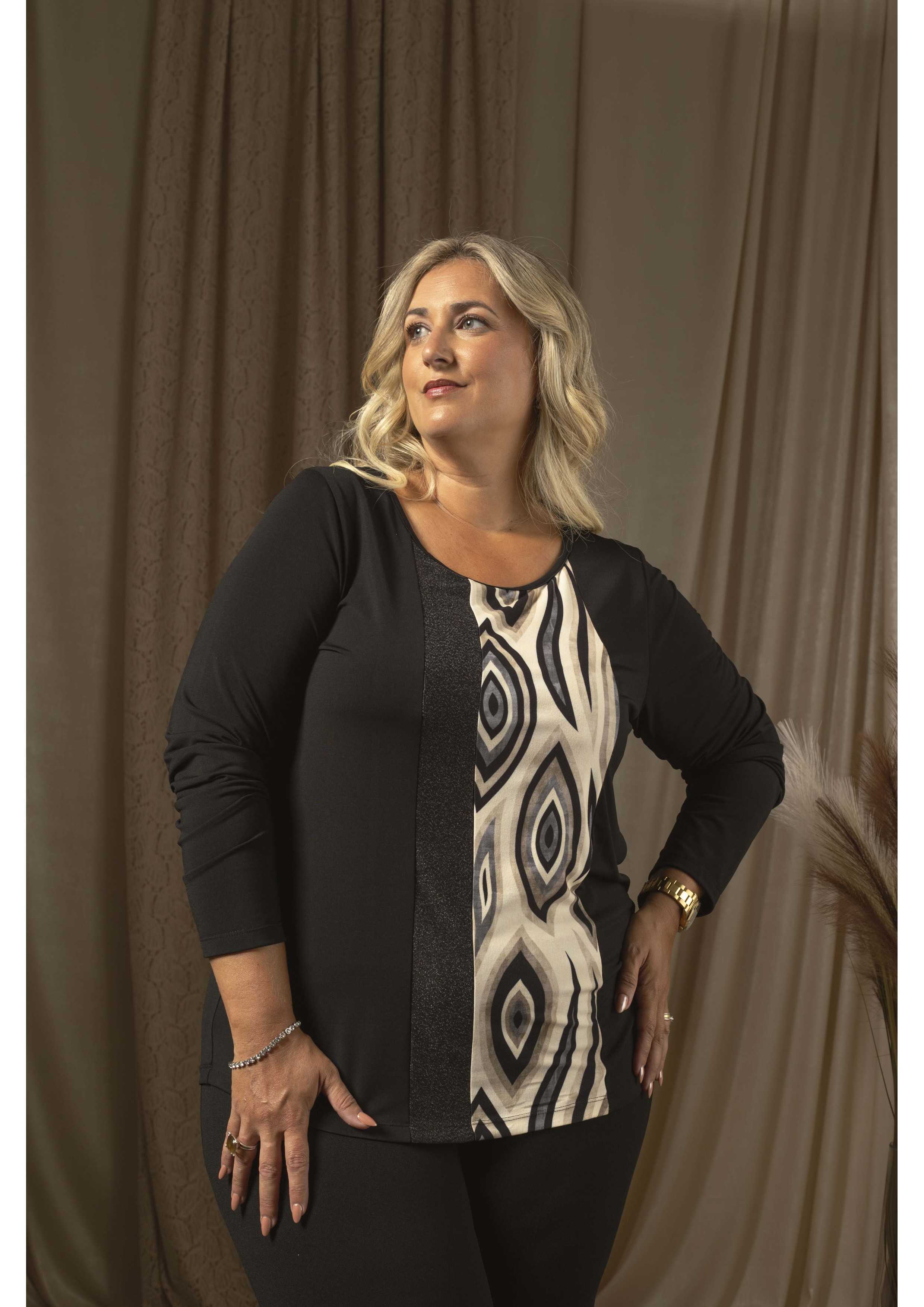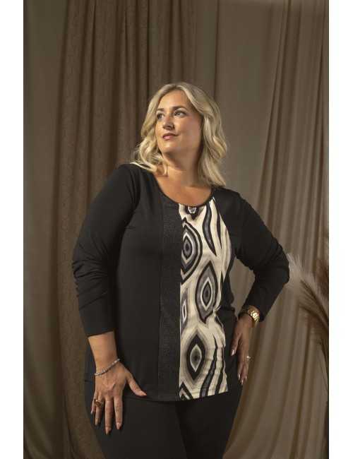 Camiseta de punto liso, manga larga con escote redondo. Dos bolsillos en la parte frontal, uno estampado, otro de punto lurex. Colección: Otoño Invierno Disponible en Tallas Grandes Producto de diseño y fabricación propia. Somos una marca de confección de ropa con más de 50 años de experiencia Modelo: Altura 1.65m y está usando la talla 3XL. Composición: 94%Poliéster 6%Elastano|46%Viscosa 30%Nylon 12%Poliéster 12%Elastano