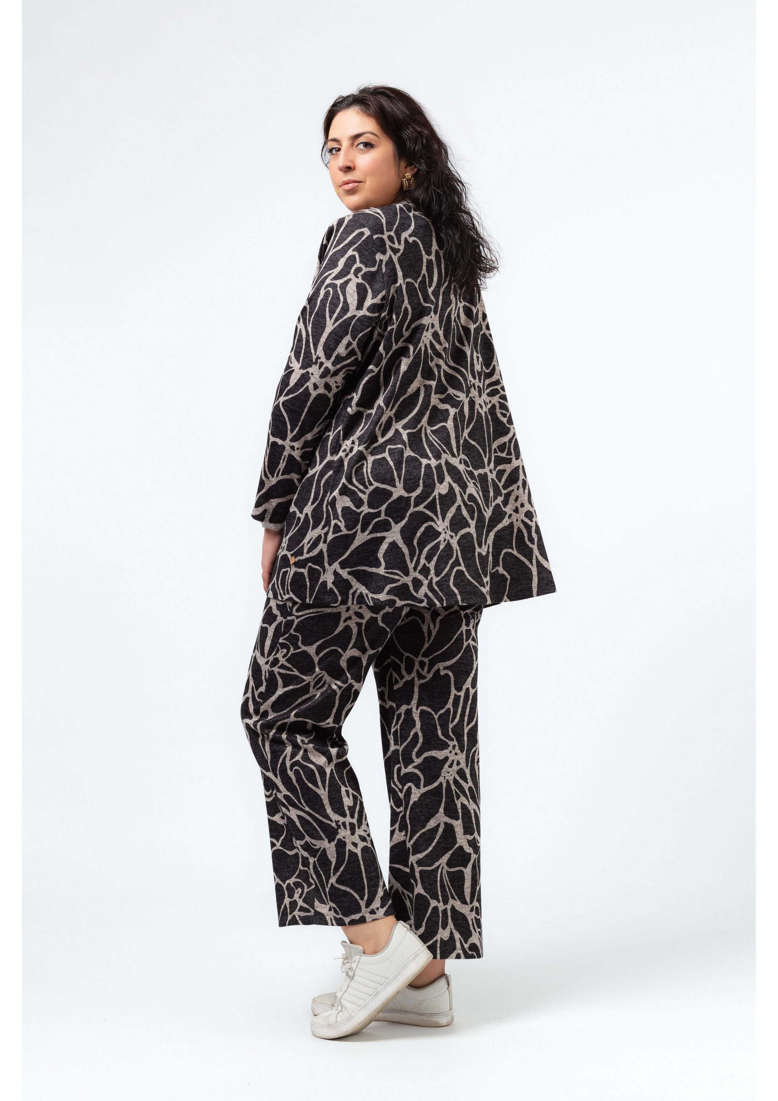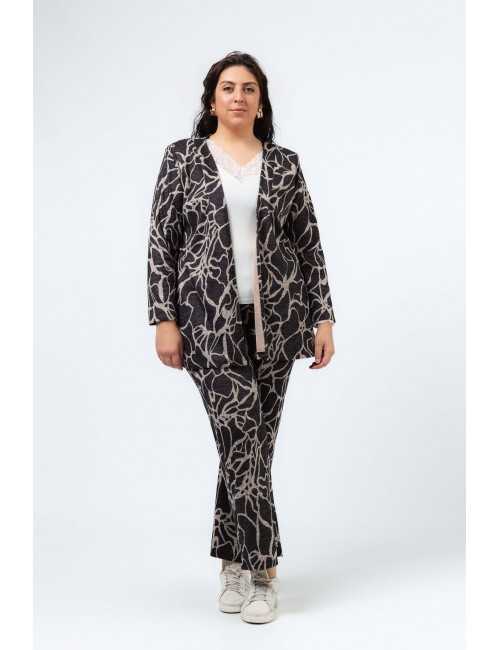 Chaqueta de punto estampada, manga larga, modelo abierto ligeramente evasé. Pinzas verticales. Lleva hombreras.