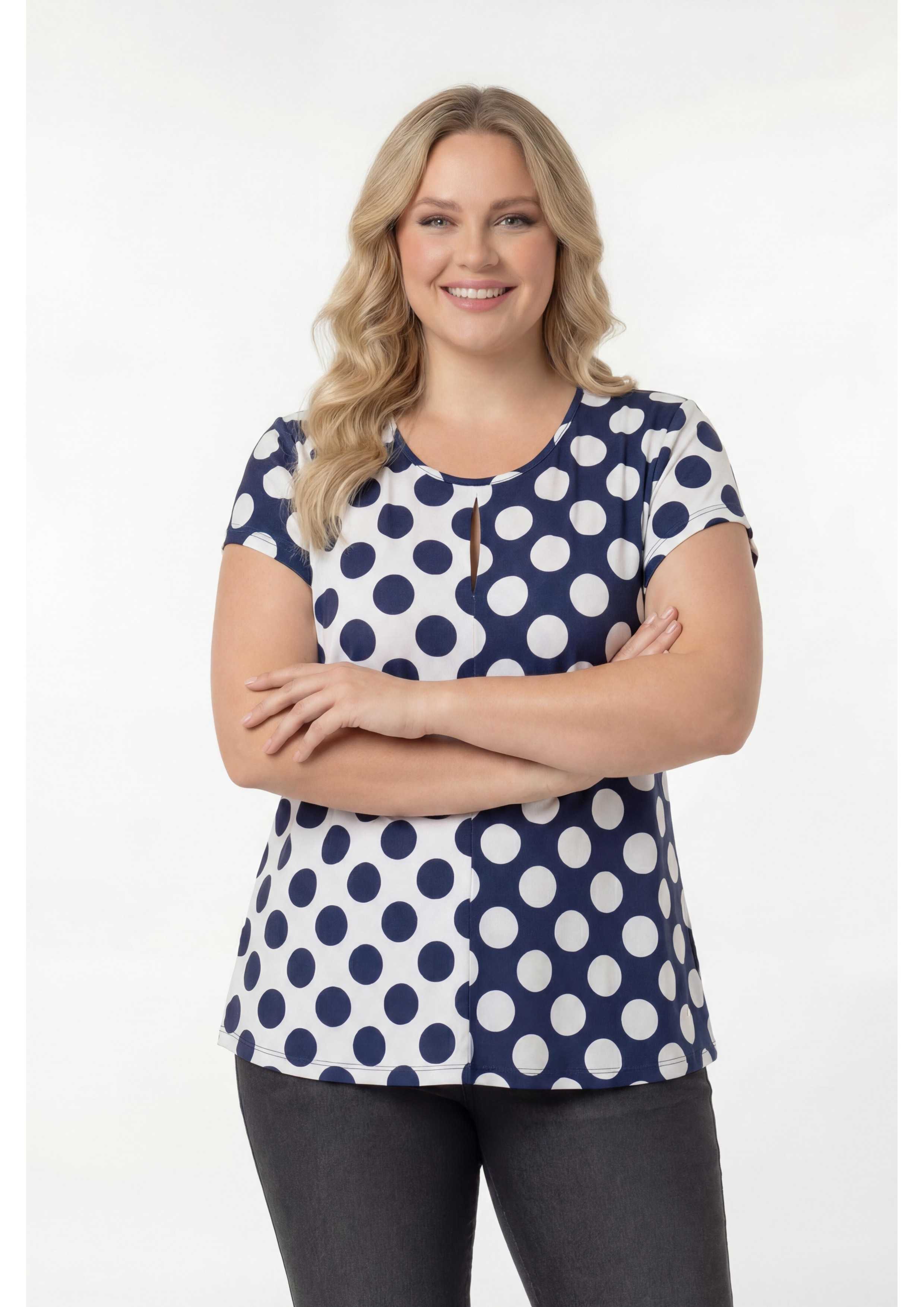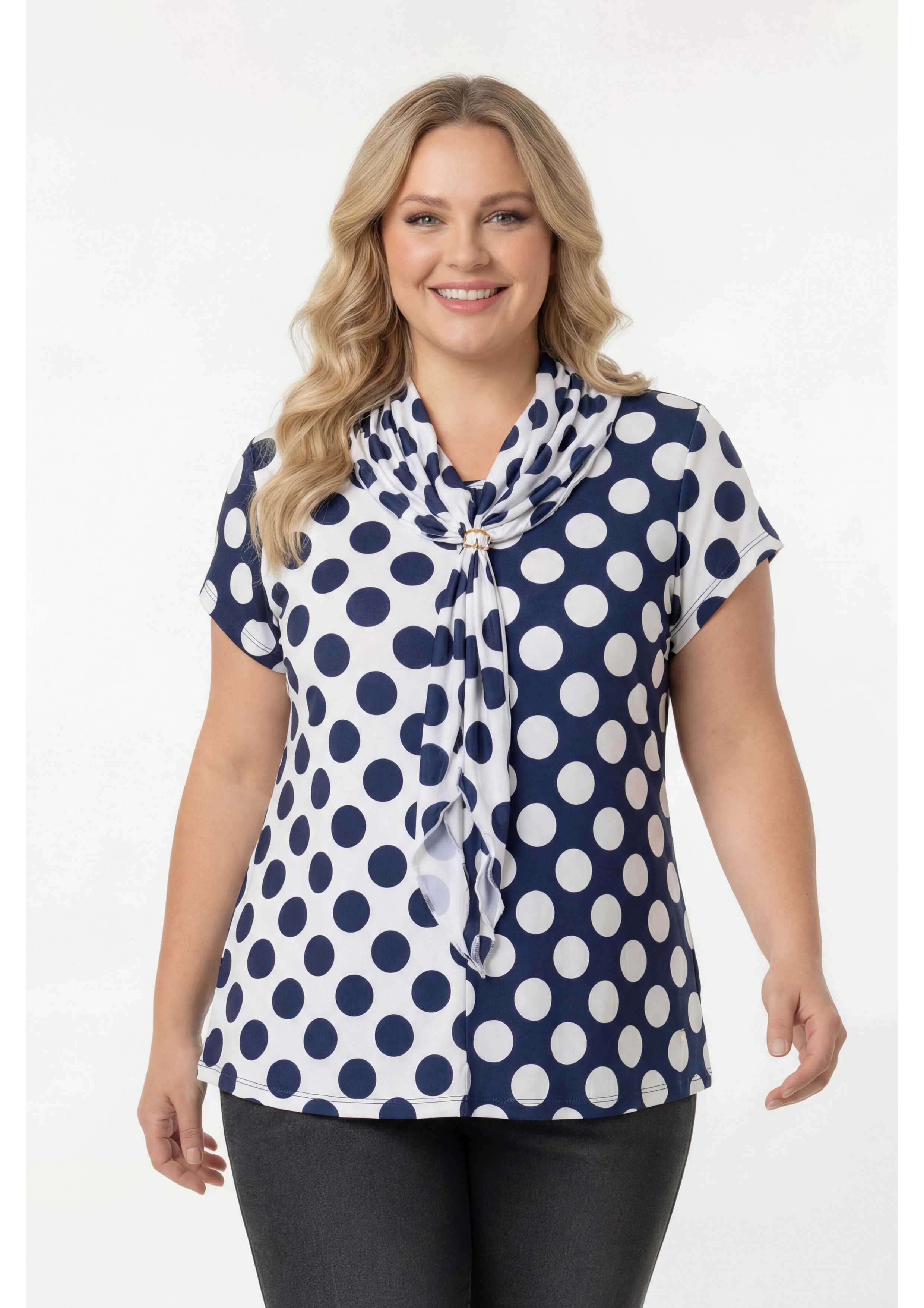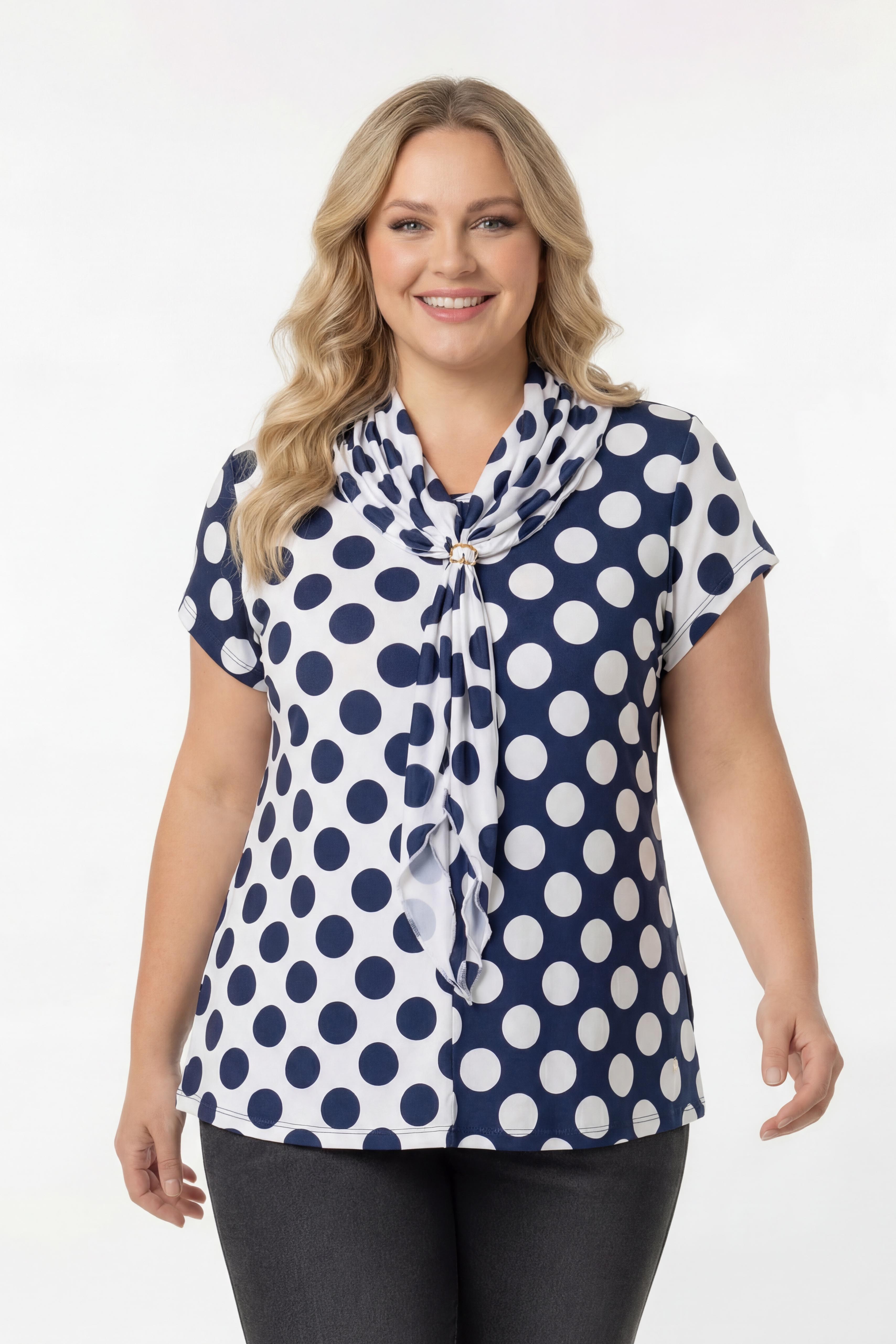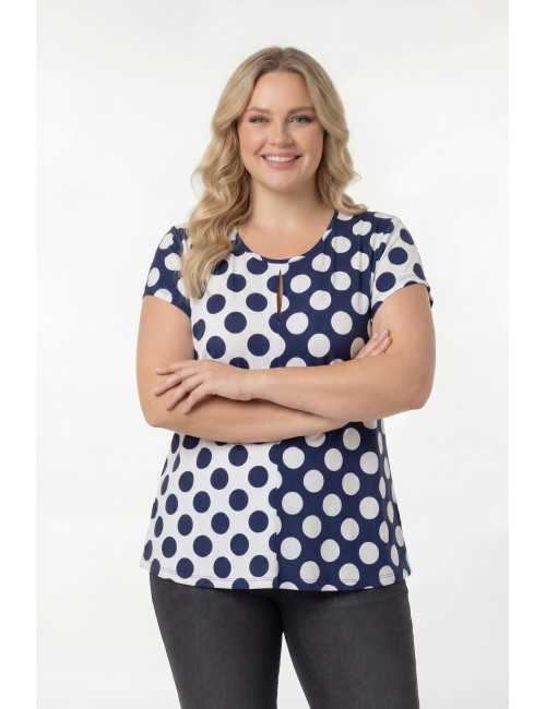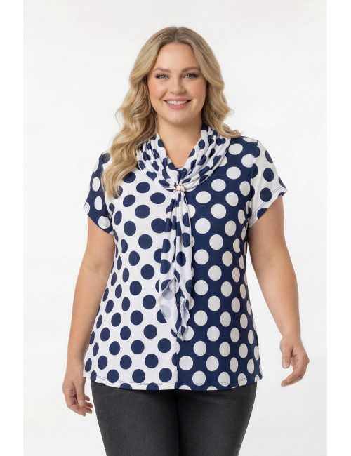 Camiseta de punto estampada, cuello redondo y manga corta. Corte frontal con 2 estampados y pequeña abertura tipo lágrima cerrada. Incluye un pañuelo en forma de triángulo con ribete y aplique metálico. Modelo evasé. Disponible en Tallas Grandes Producto de diseño y fabricación propia. Somos una marca de confección de ropa con más de 50 años de experiencia