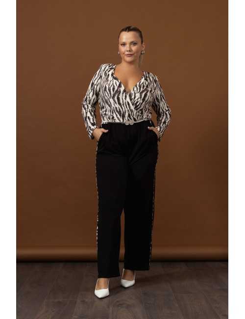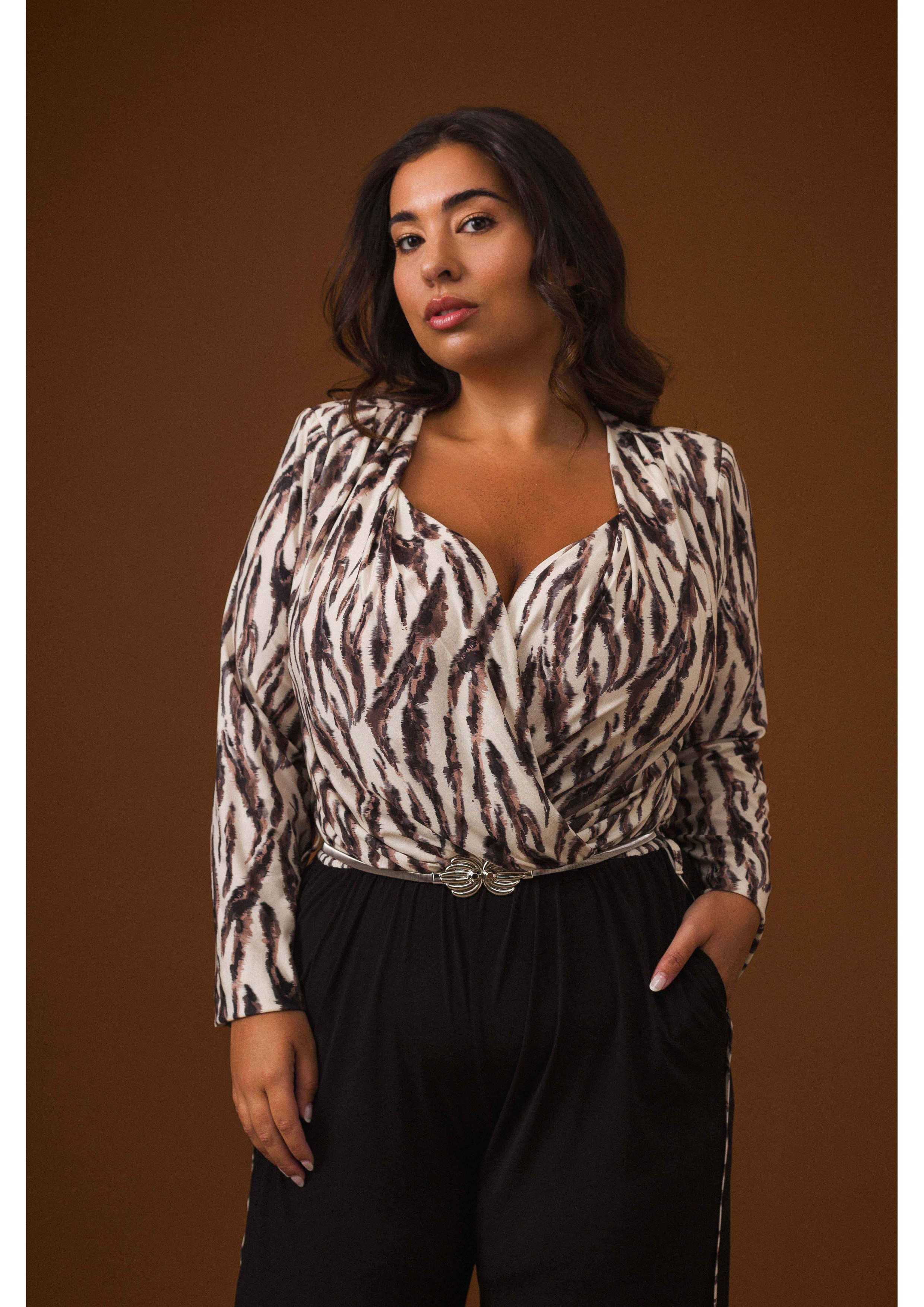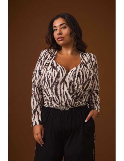 Mono de punto liso y estampado tigresa, escote cruzado, manga larga, pantalón con bolsillos laterales y vivo, cuerpo estampado, pantalón liso. Lleva cinturón de metal. Colección: Otoño Invierno Disponible en Tallas Grandes Producto de diseño y fabricación propia. Somos una marca de confección de vestuario con más de 50 años de experiencia. Modelo: Altura 1.70m y está usando la talla 2XL, en color negro. Modelo: Altura 1.63m y está usando la talla 2XL, en color beige. Composición: 94%Poliéster 6%Elastano