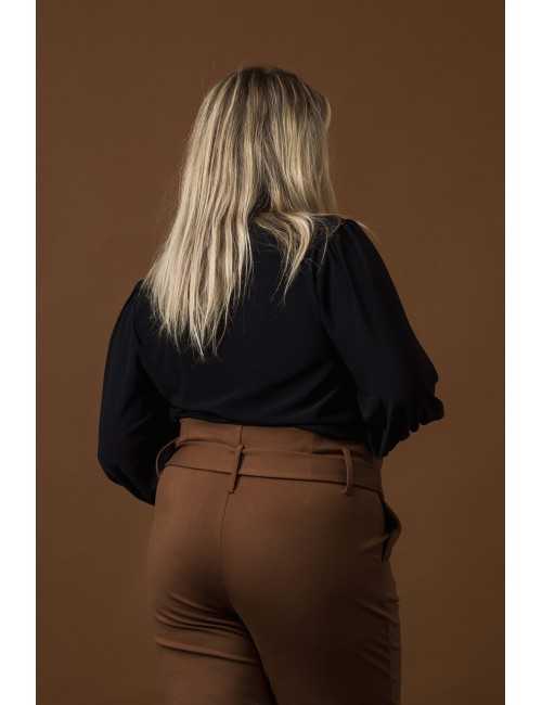 Pantalón de punto roma liso, cintura alta con pliegues, cierre delantero, bolsillos laterales. Cinturón de la misma tela con lazo. Colección: Otoño Invierno Modelo: Altura 1.63m y está vistiendo la talla 2XL